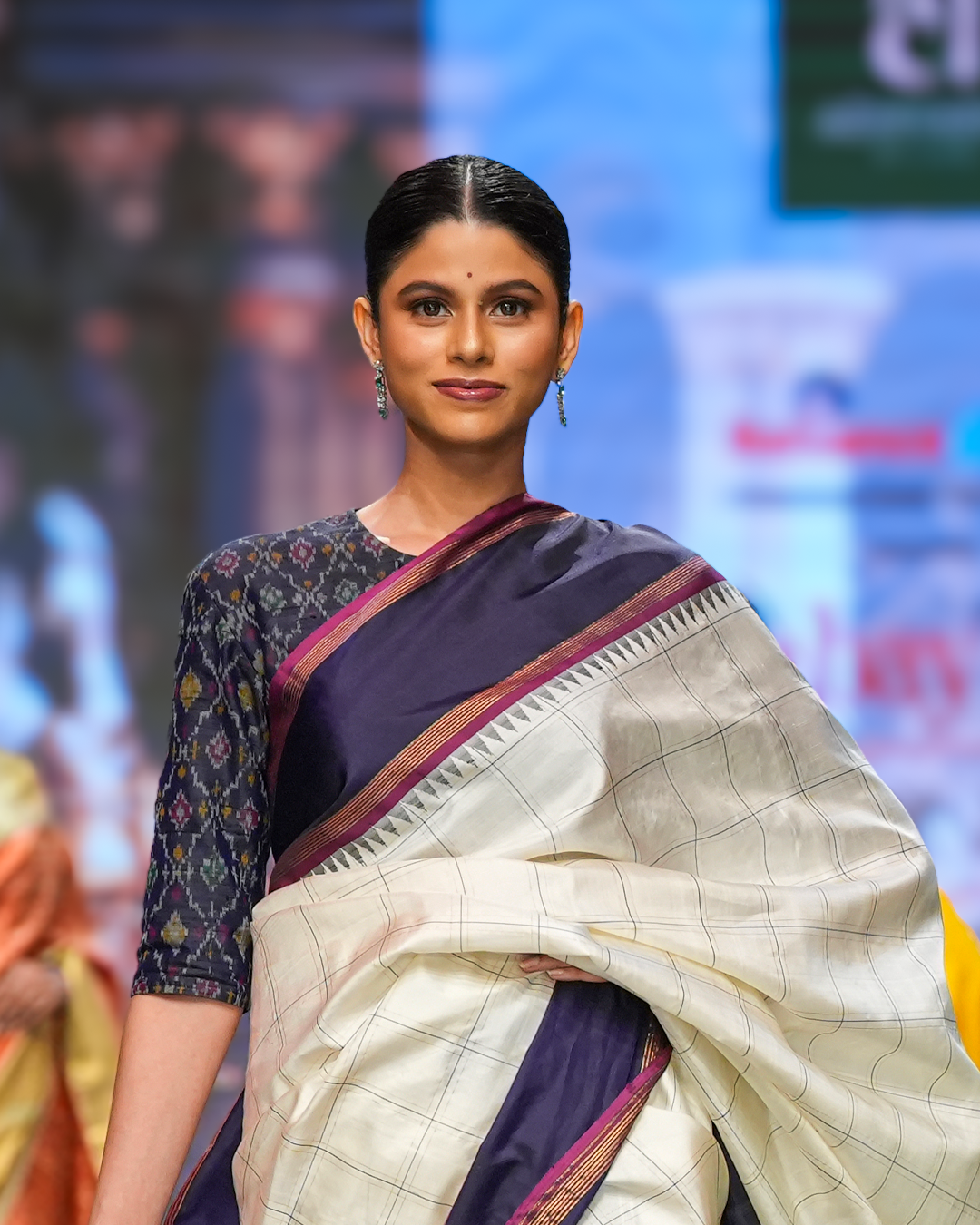 A rich Off white body contrasted with an Navy Blue korvai panel featuring subtle Navy Blue & Gold Zari checks, finished with magenta zari borders and classic temple-inspired detailing for timeless sophistication.