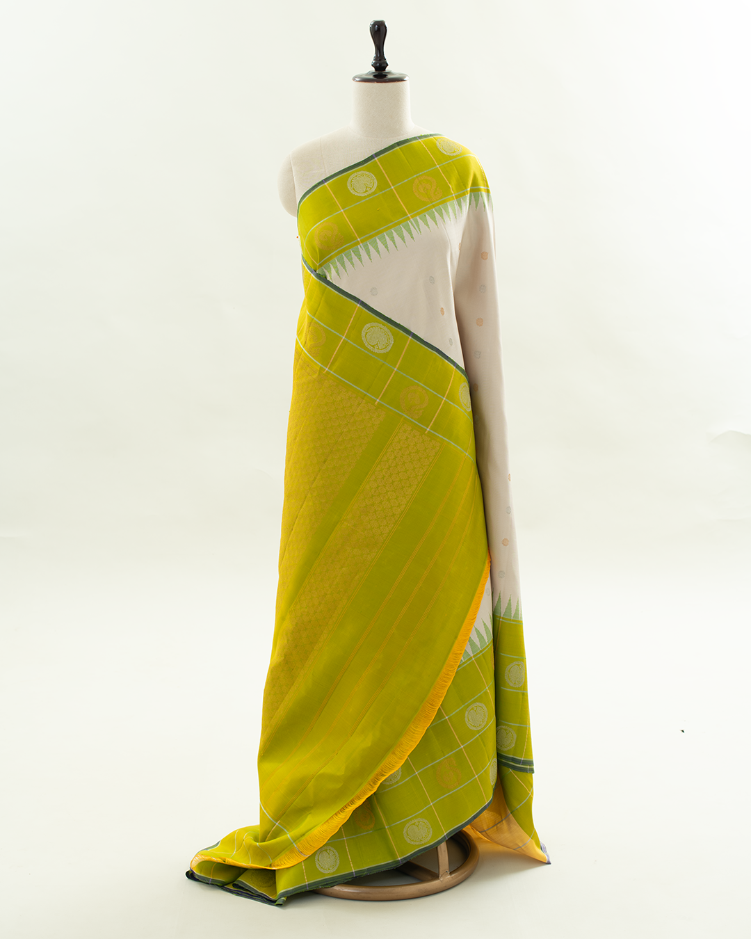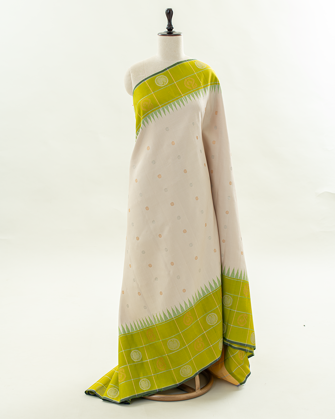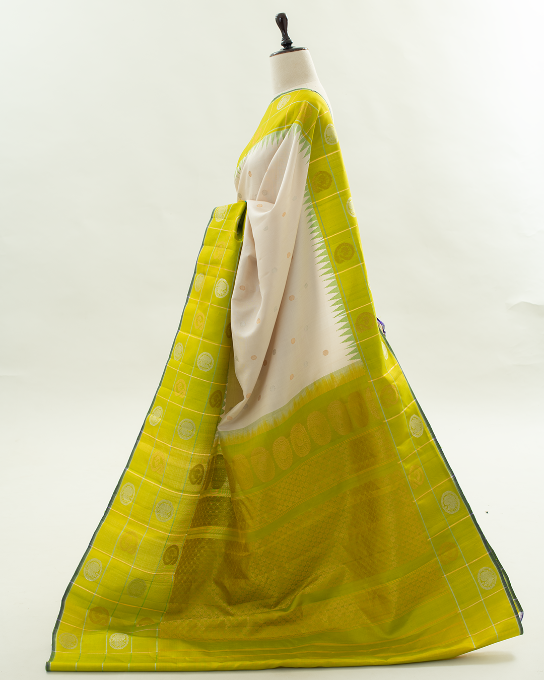 Elegant Gadwal silk saree features an off-white body with delicate buttas, framed by a vibrant lime green border showcasing classic temple motifs and checkered zari weaving.