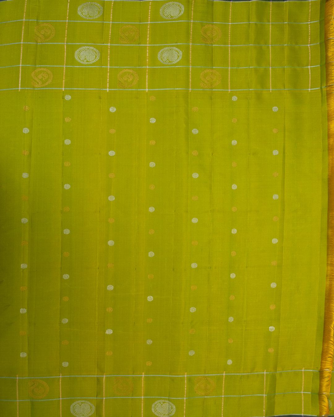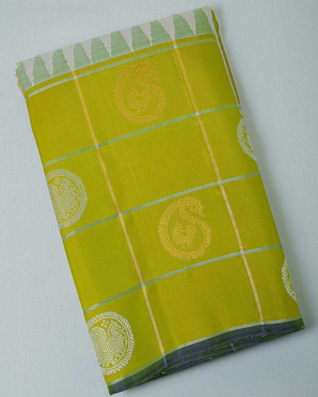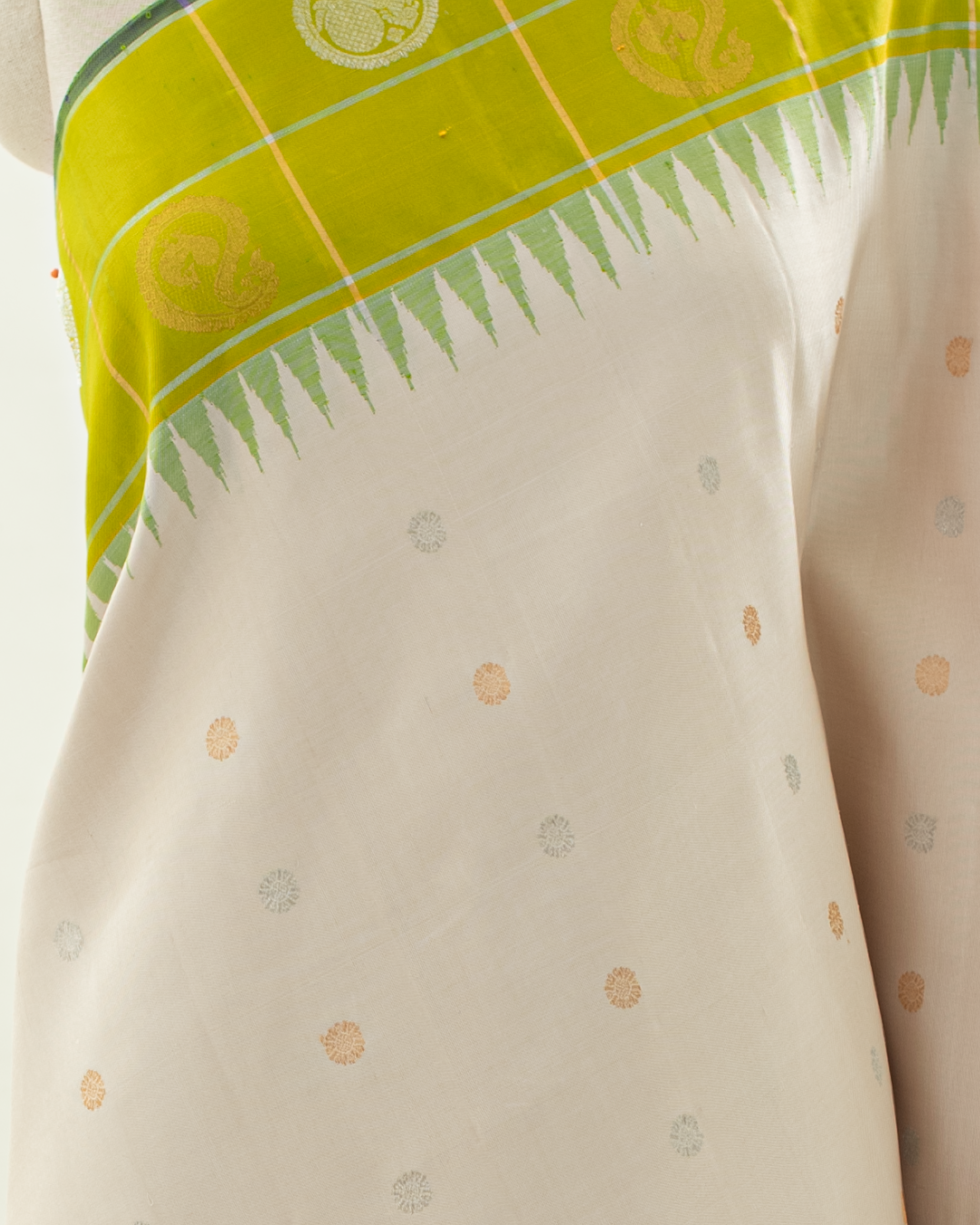 Elegant Gadwal silk saree features an off-white body with delicate buttas, framed by a vibrant lime green border showcasing classic temple motifs and checkered zari weaving.