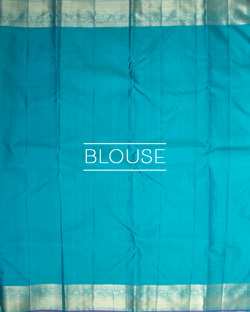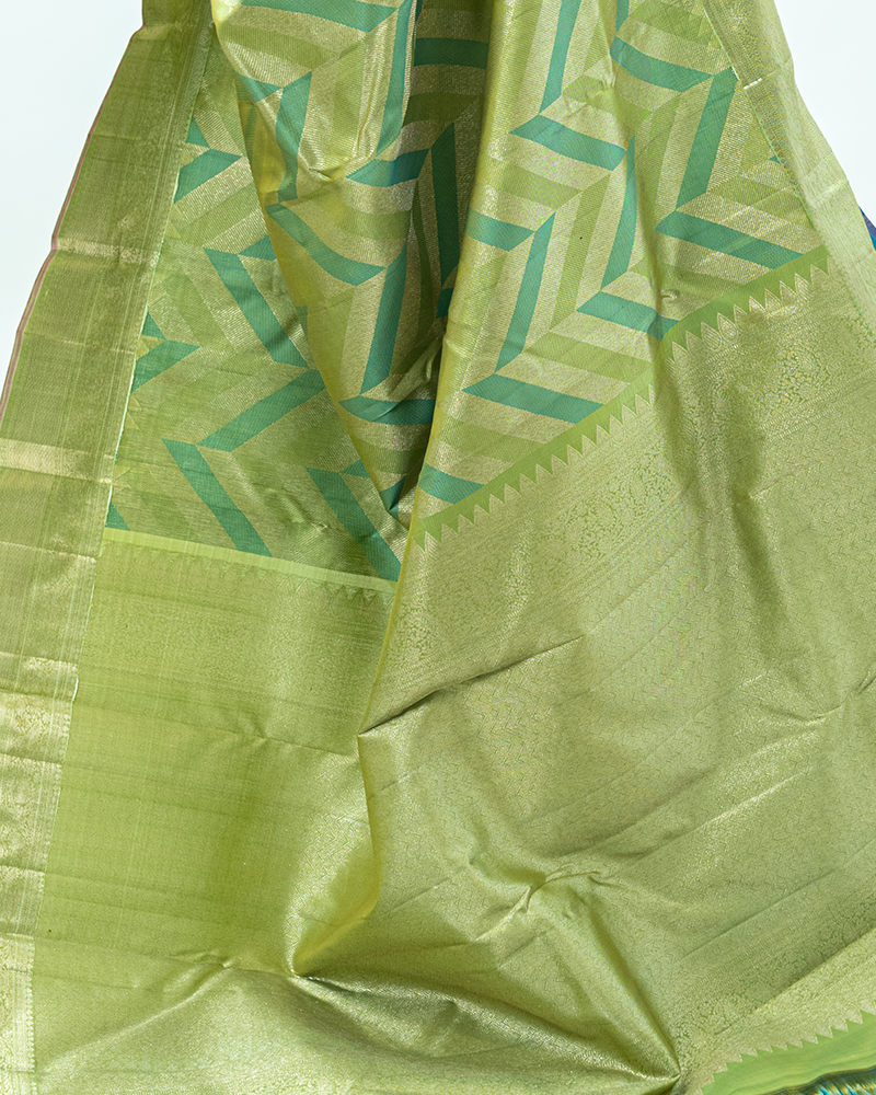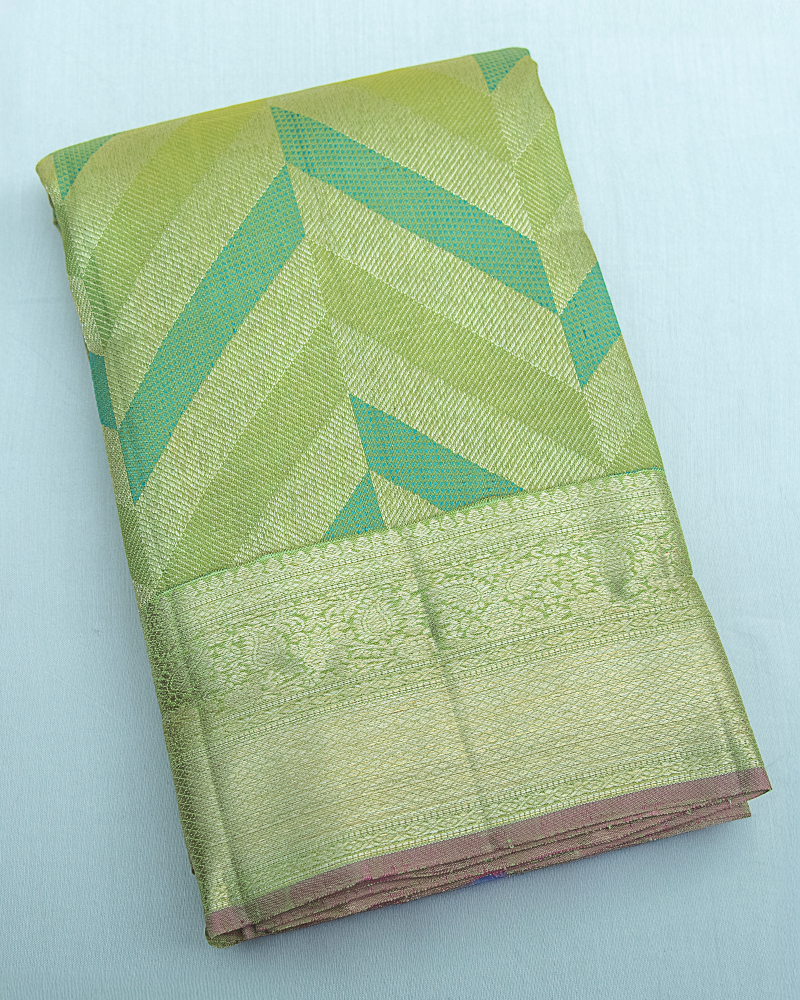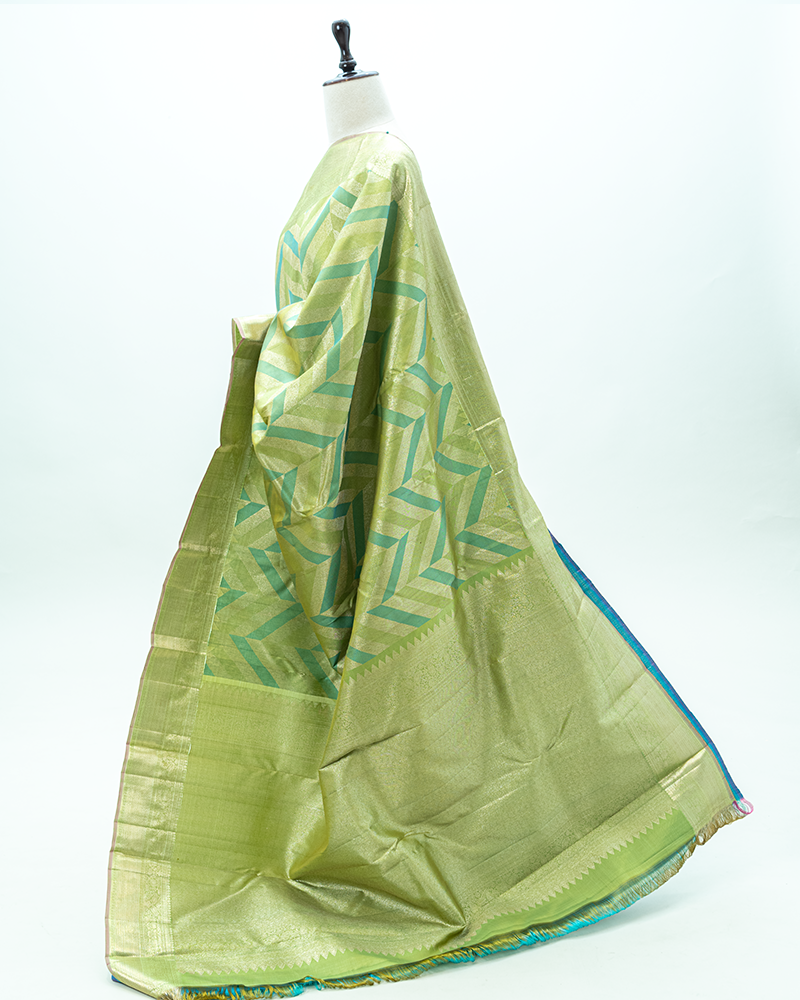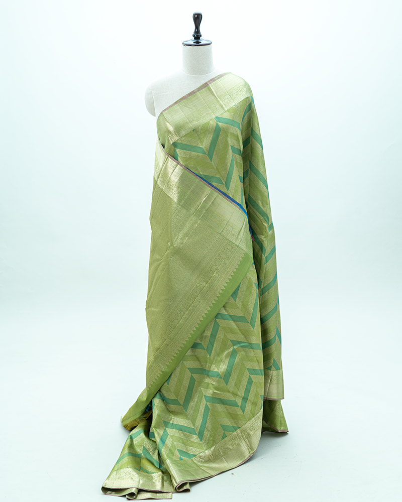 Elegant Olive green Kanjivaram silk saree adorned with shimmering silver chevron patterns and a co-ordinated pallu.