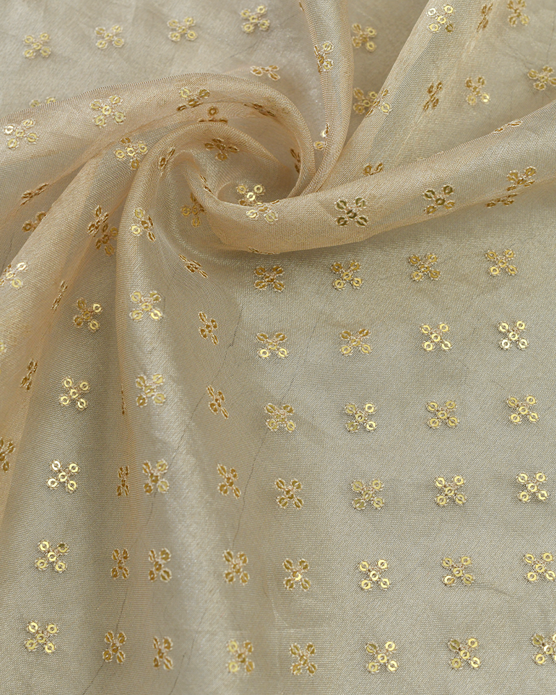 This Chanderi silk saree features a soft onion-pink body detailed with golden floral butis and a vibrant fuchsia pink border with silver zari stripes.