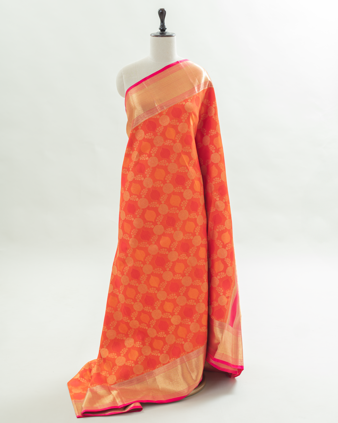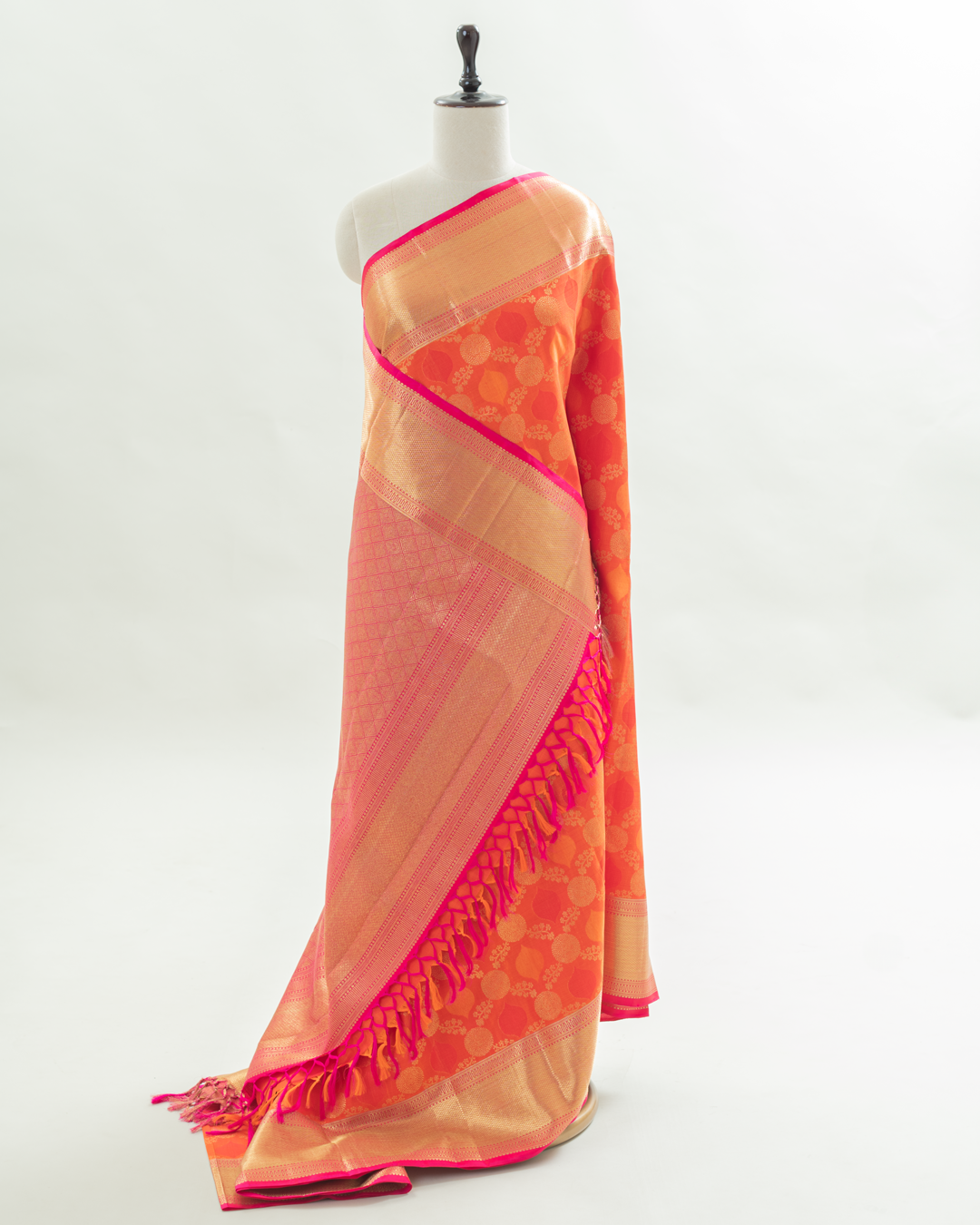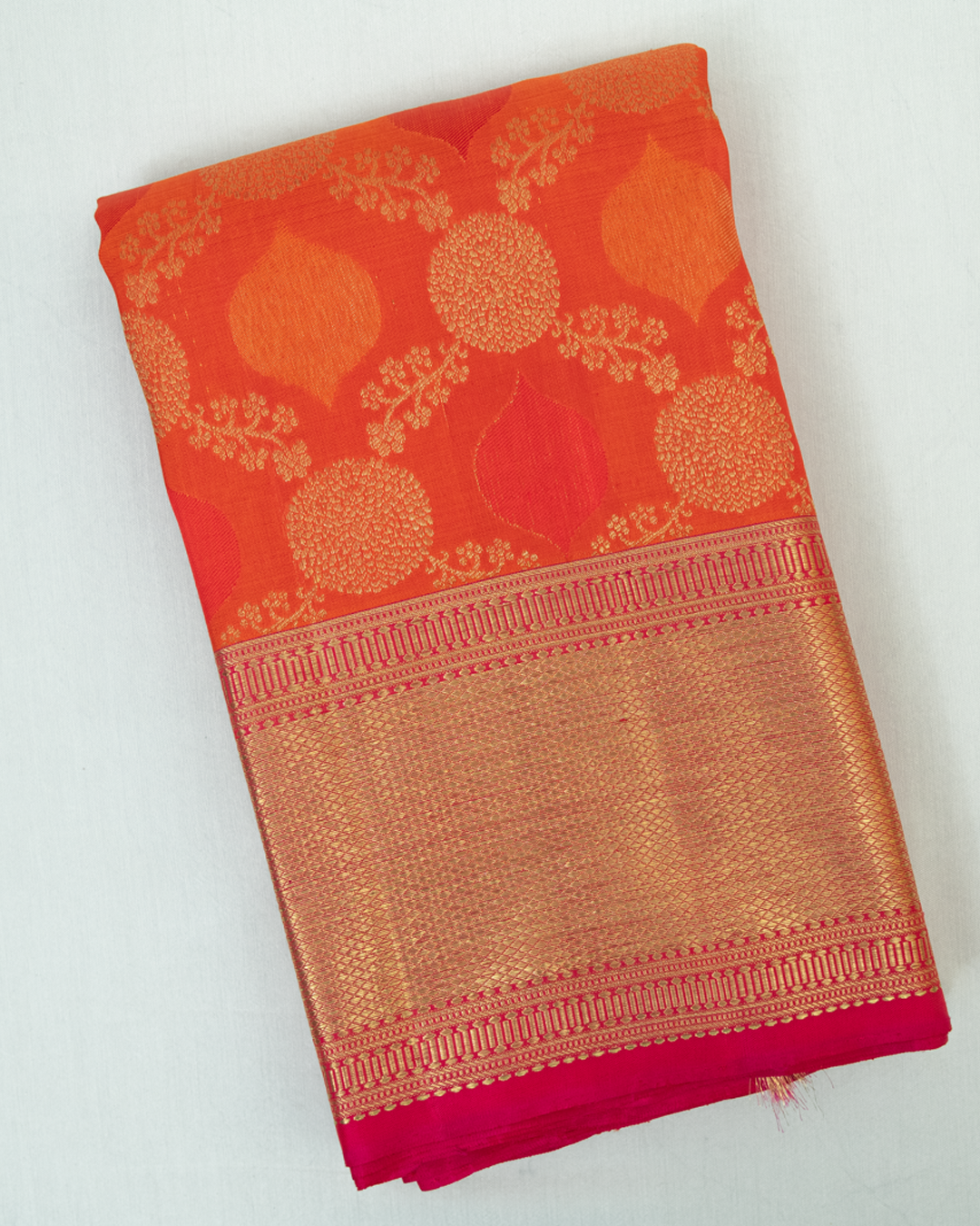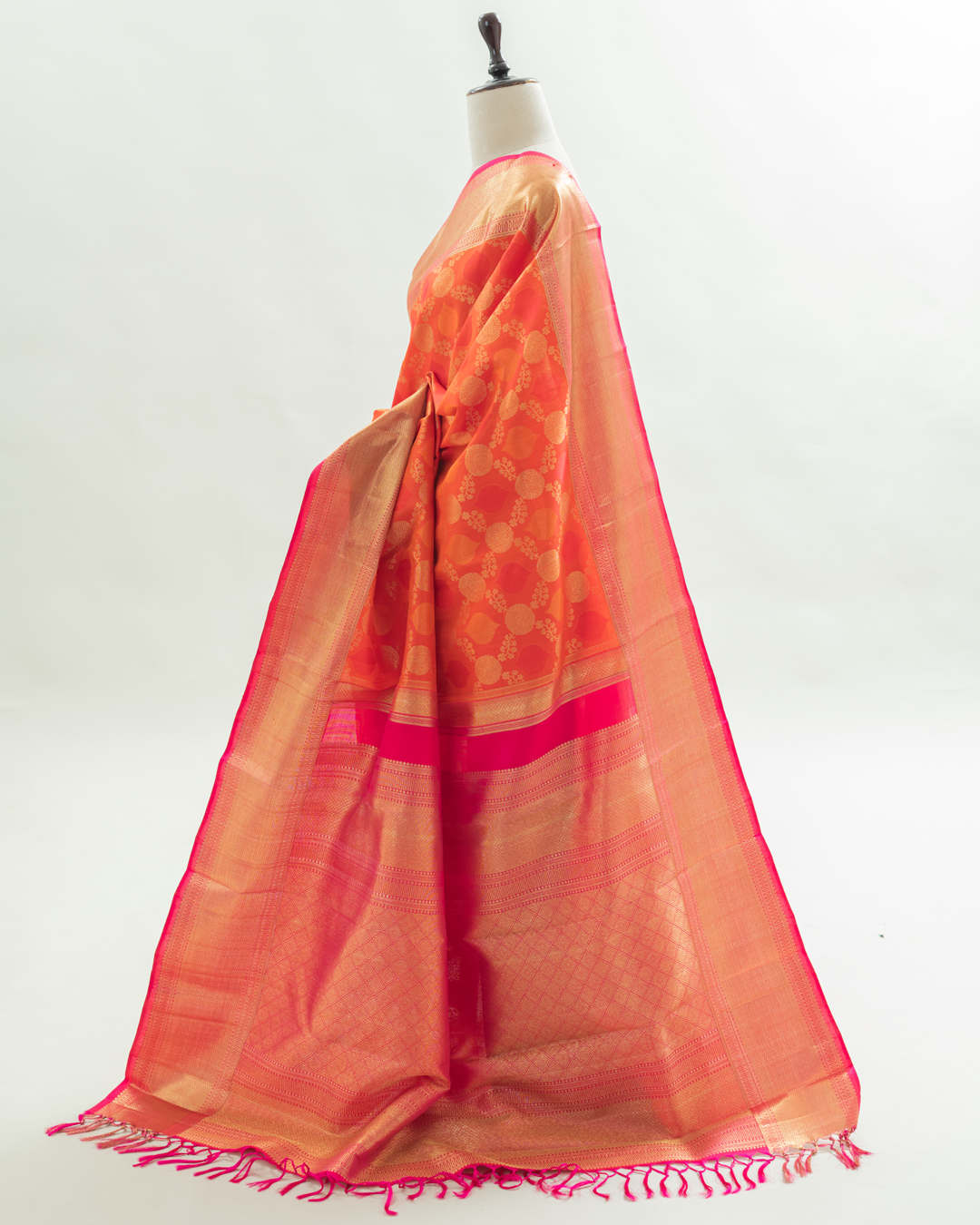 Vibrant orange body featuring intricate golden zari Vanasingaram-inspired floral and leaf motifs, paired with a rich pink Pettu border and diamond Vairaoosi patterns.