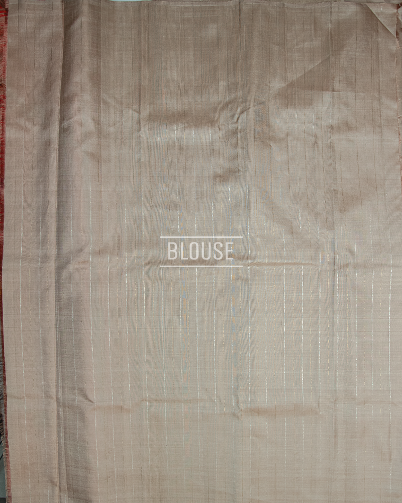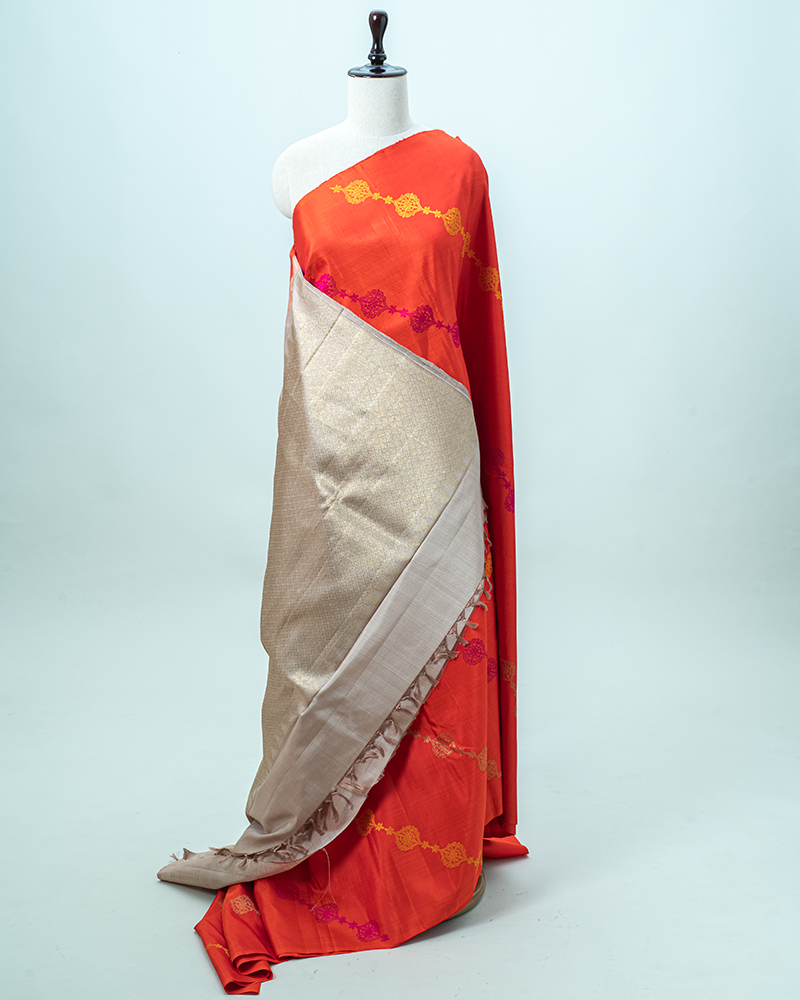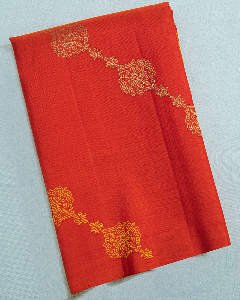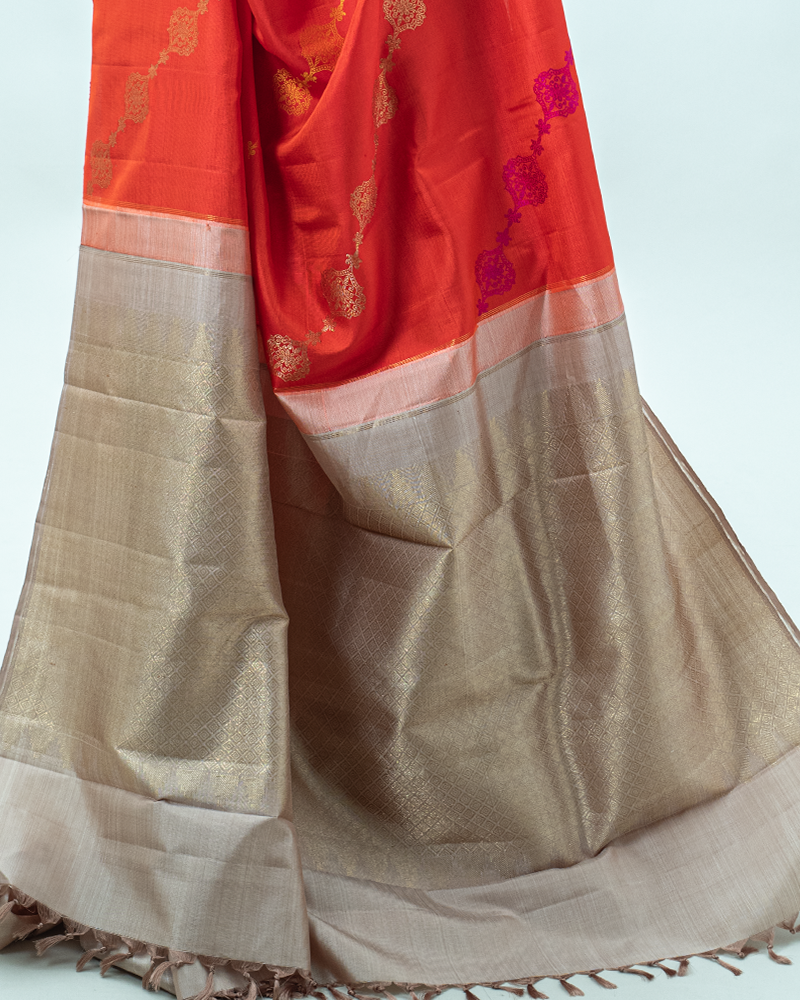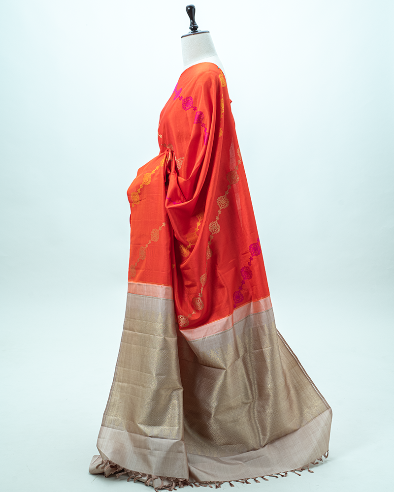 This Kanjivaram features a bright orange body with diagonal bands of floral buttas in shades of gold and pink, complemented by a wide gold-zari border.