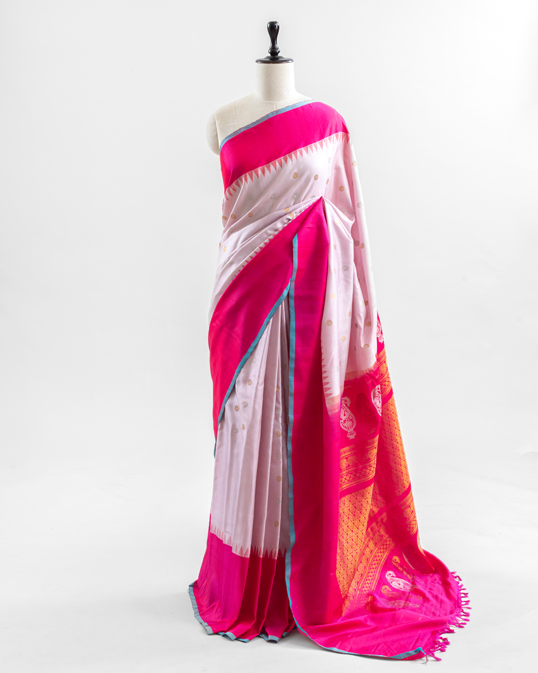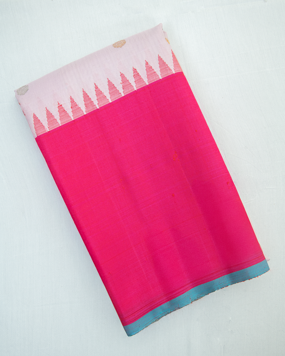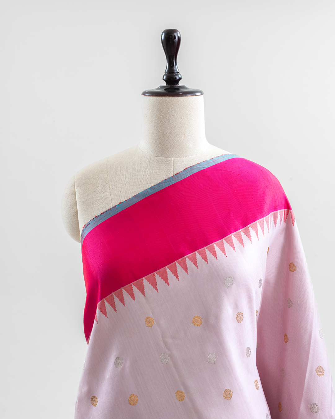 Pale Pink & Pink Gadwal Silk Saree with Temple Border, subtle Gold & Silver Zari buttas, and contrast edge, reflecting lightweight and timeless elegance.
