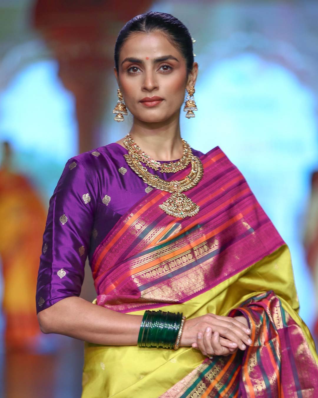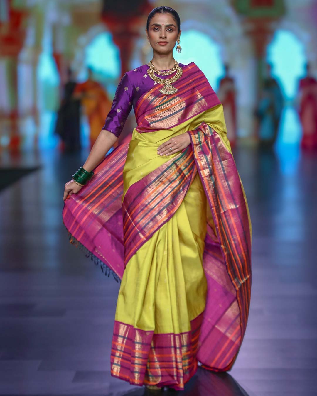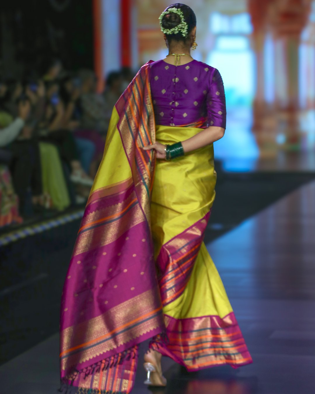 Parrot yellow Kanchipattu saree with zari buttas and bold purple korvai border, perfect for festive occasions.