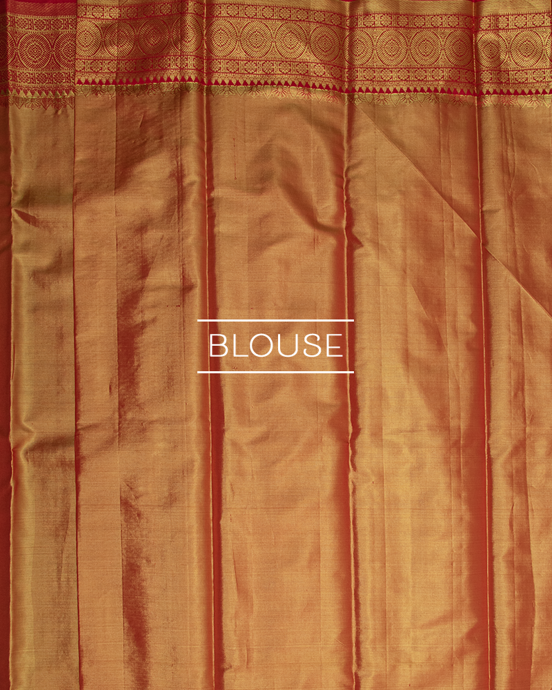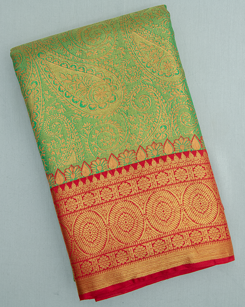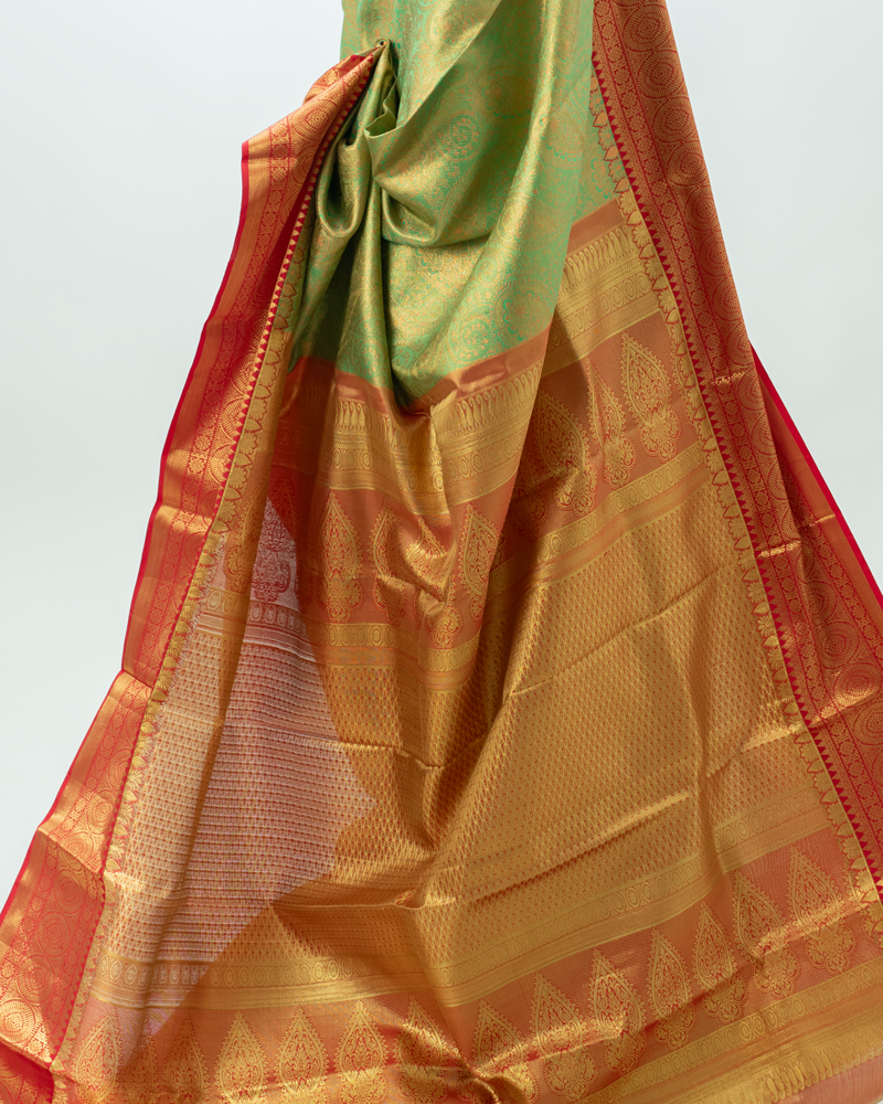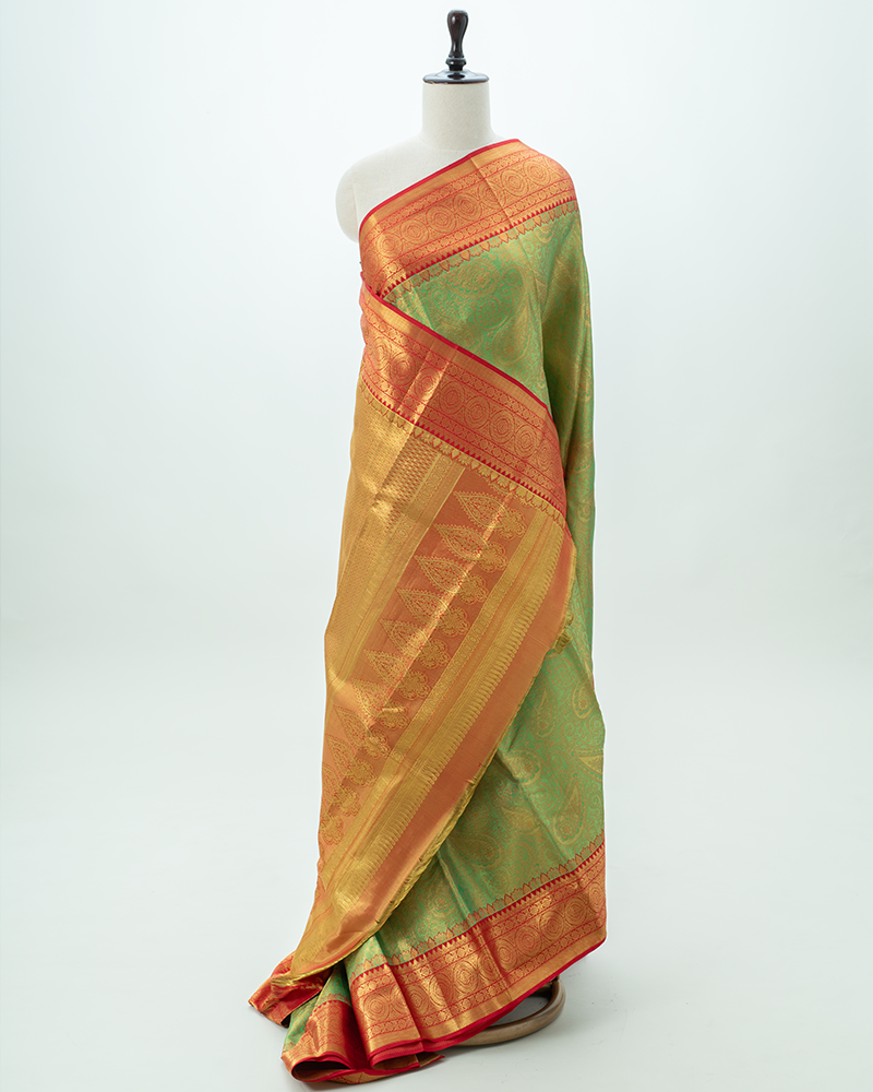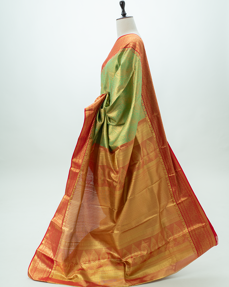 This Parrot Green tissue Kanjivaram silk saree with gold manga motifs all over the body and rich Gold zari Arakku border/pallu is a timeless masterpiece, perfect for any grand or festive occasion.