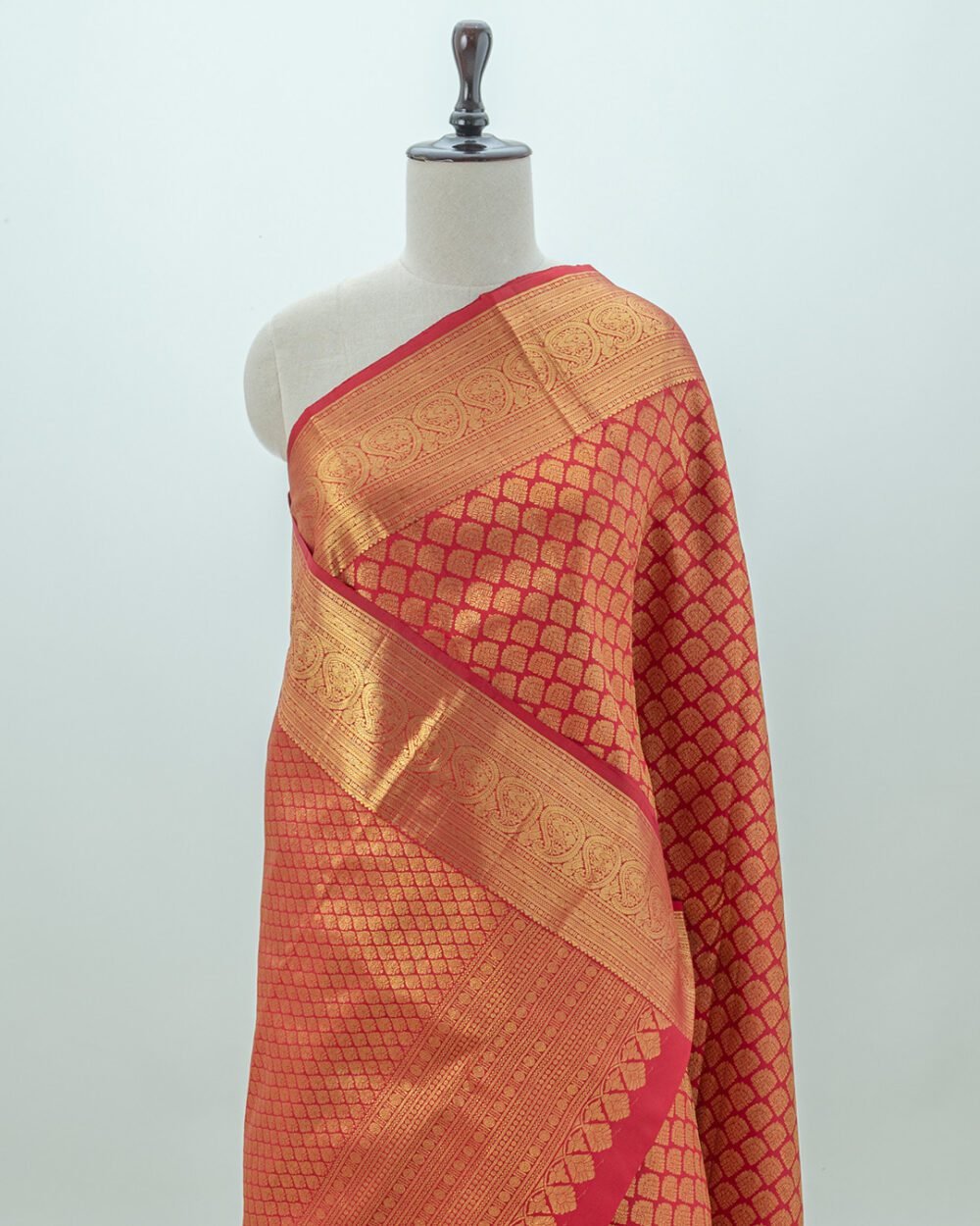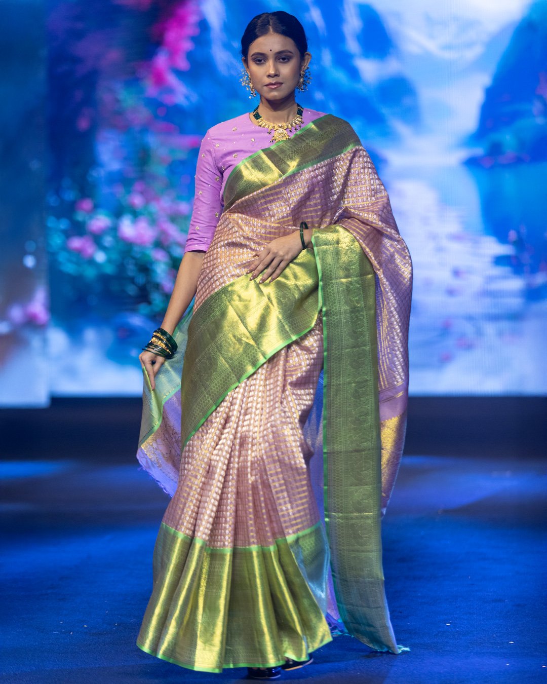 Lustrous dual-tone Vairaoosi checks, contrasted by a wide, solid Ellai (border) and Pallu (end-piece) in rich gold.
