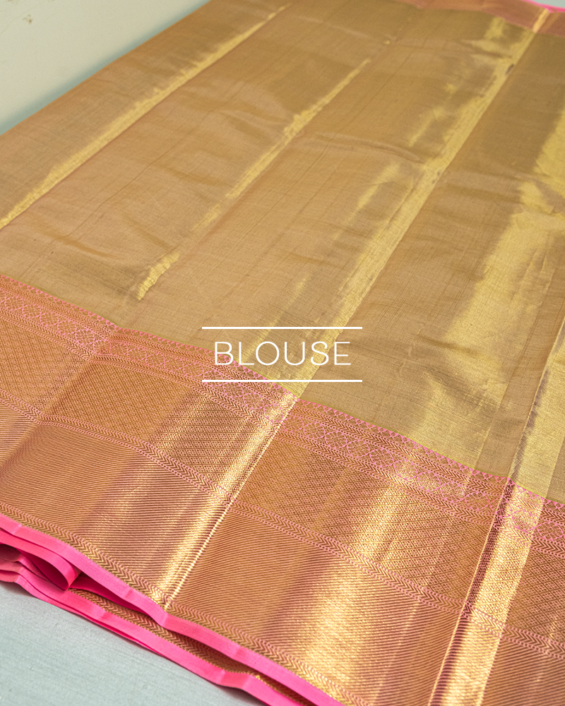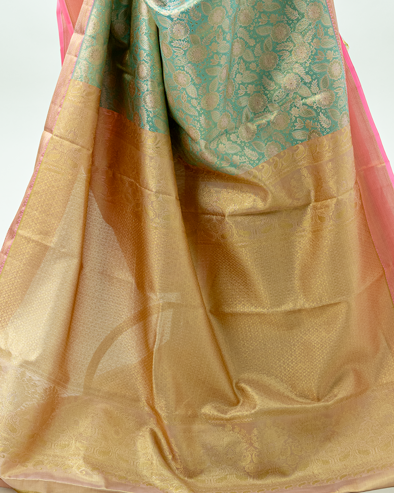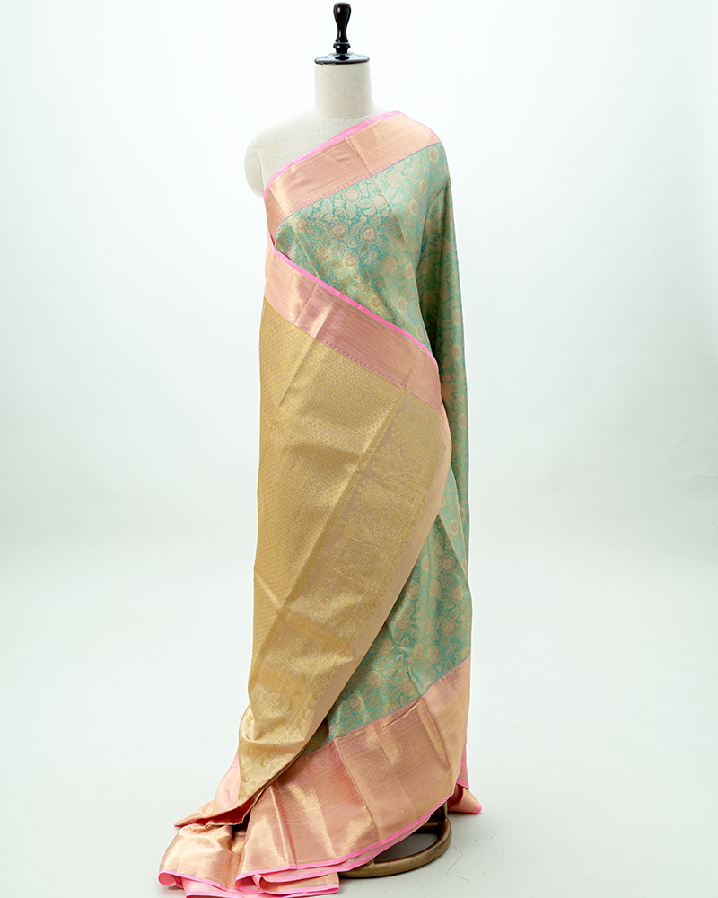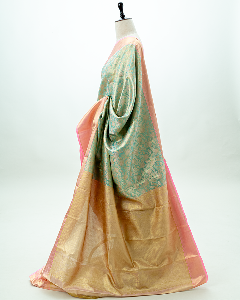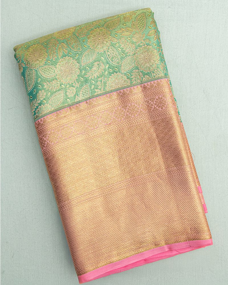 A luxurious Tissue Kanjivaram in a soothing pastel leaf green woven with continuous Gold Zari floral butta across the body. The contrasting border and pallu are in a vibrant Vazhaipoo Pink (banana flower pink) with traditional Gold Zari bands. This heirloom piece blends rich Kanchi weaving with soft, contemporary pastel elegance.