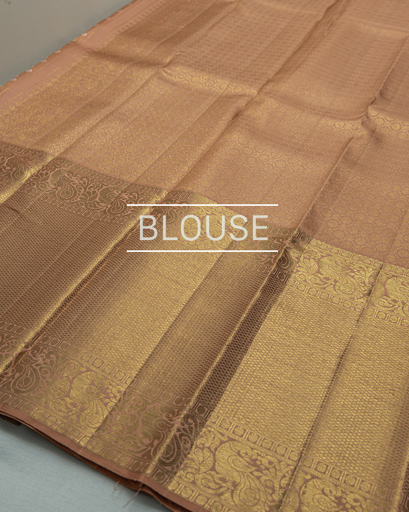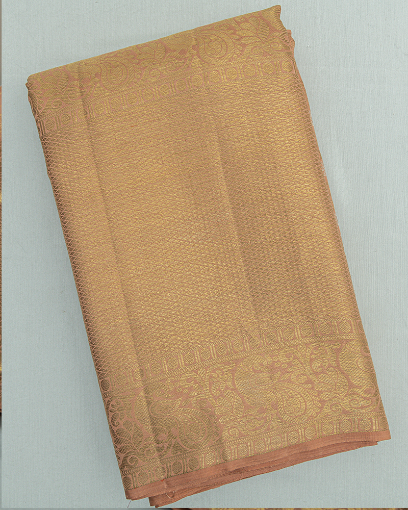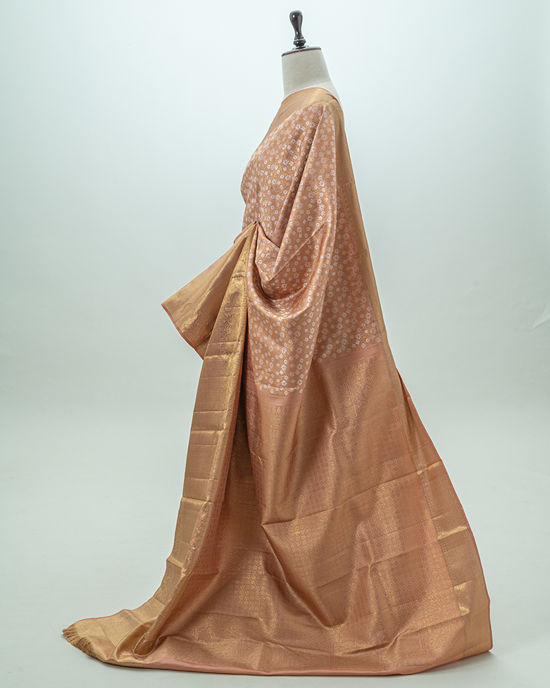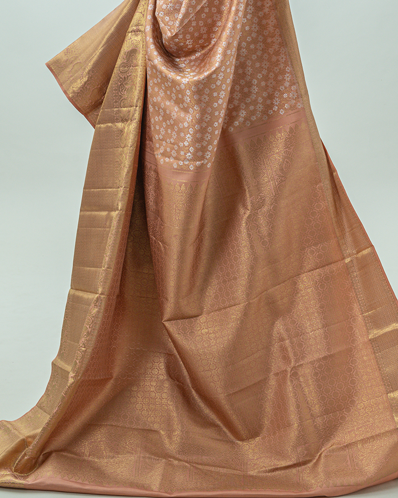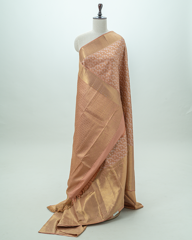 This Peach & Gold silk features delicate floral Buttas and a stunning golden border with a plain Korvai, ideal for modern grand wear