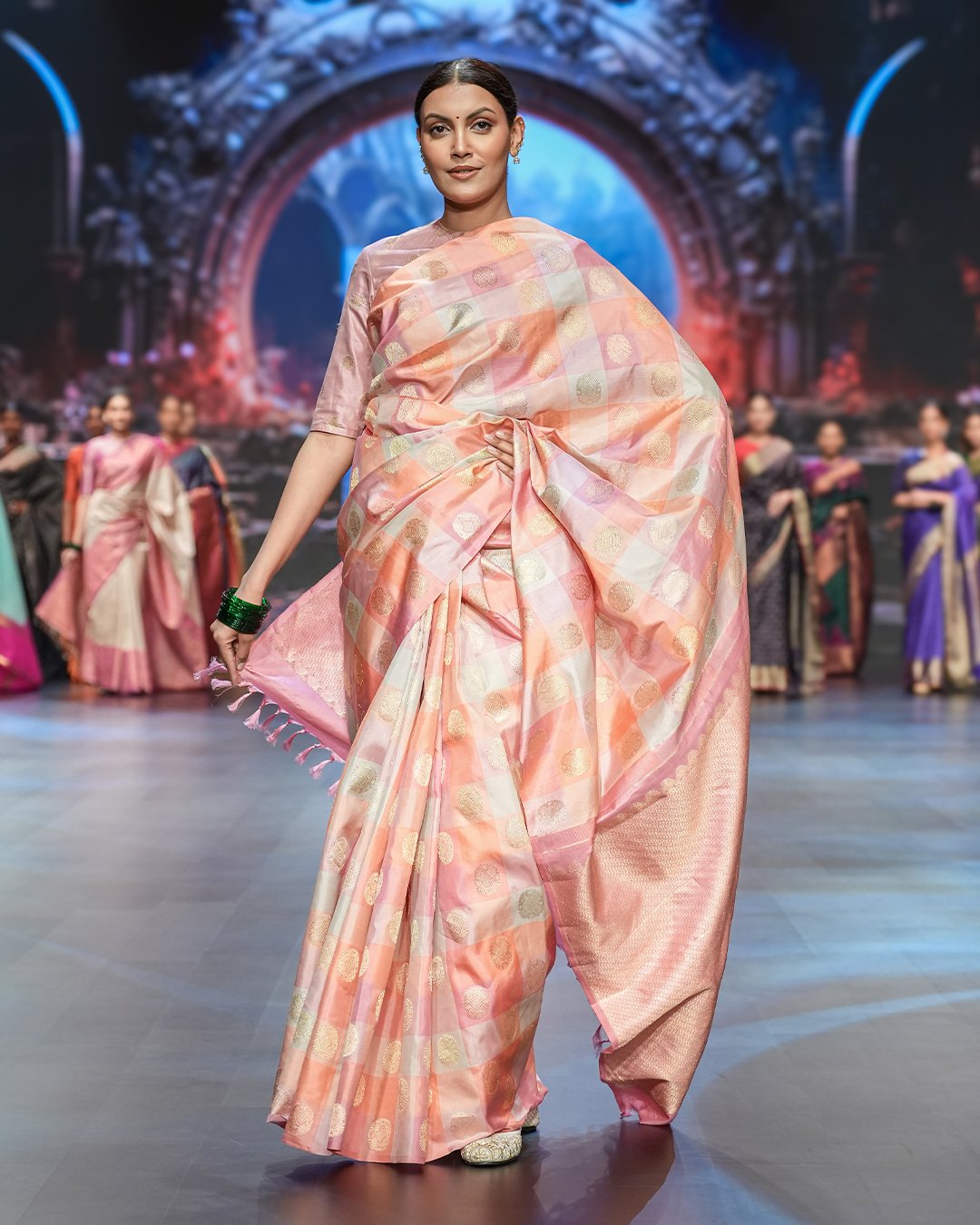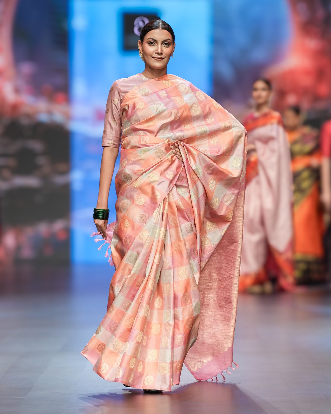 Soft peach Kanjivaram silk saree featuring multi-colour Madras kattam (checks), adorned with diamond buttas, offering a delicate blend of contemporary colour play and classic woven elegance of Kanchi loom aesthetics.