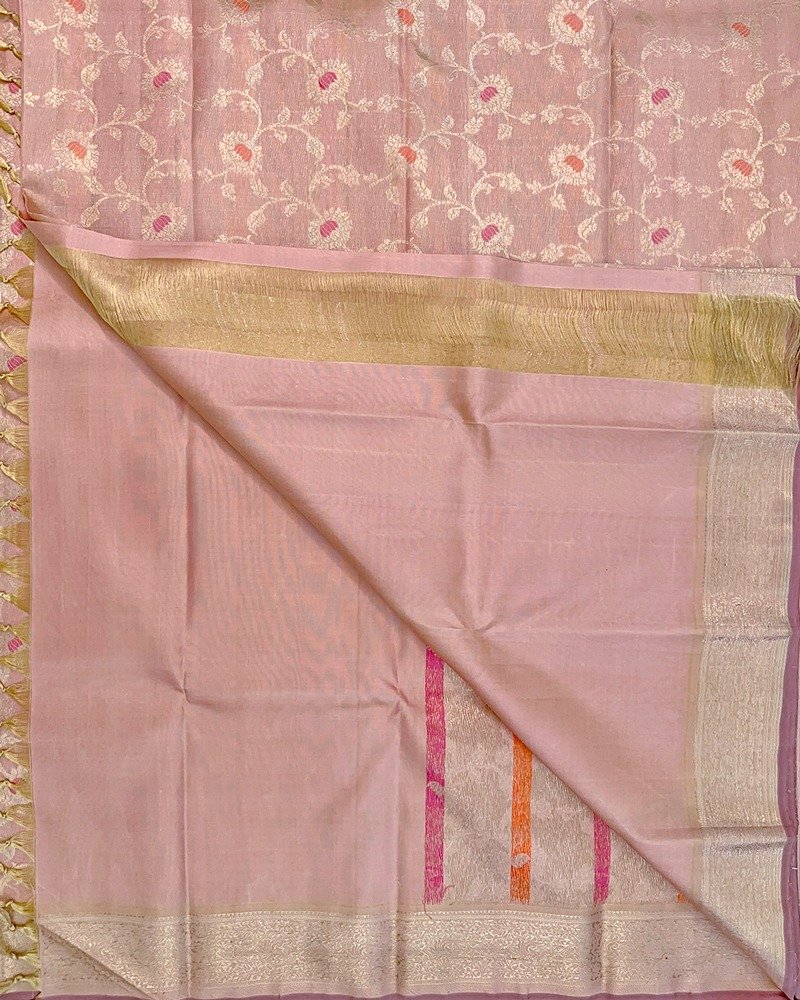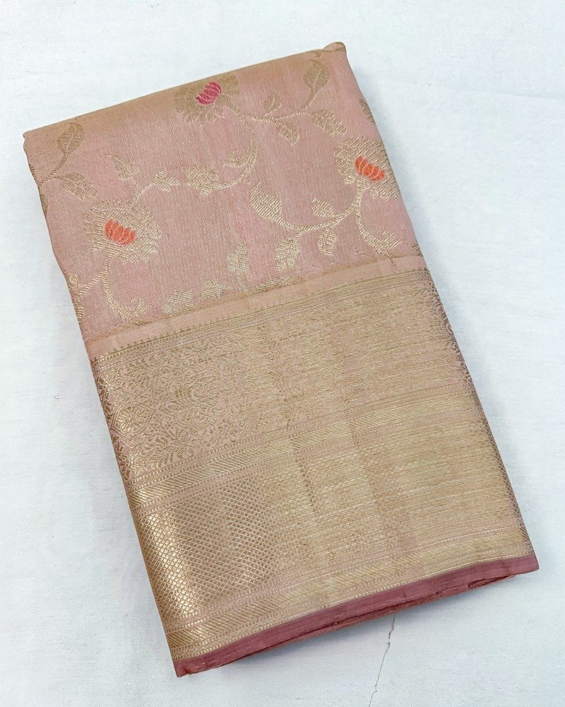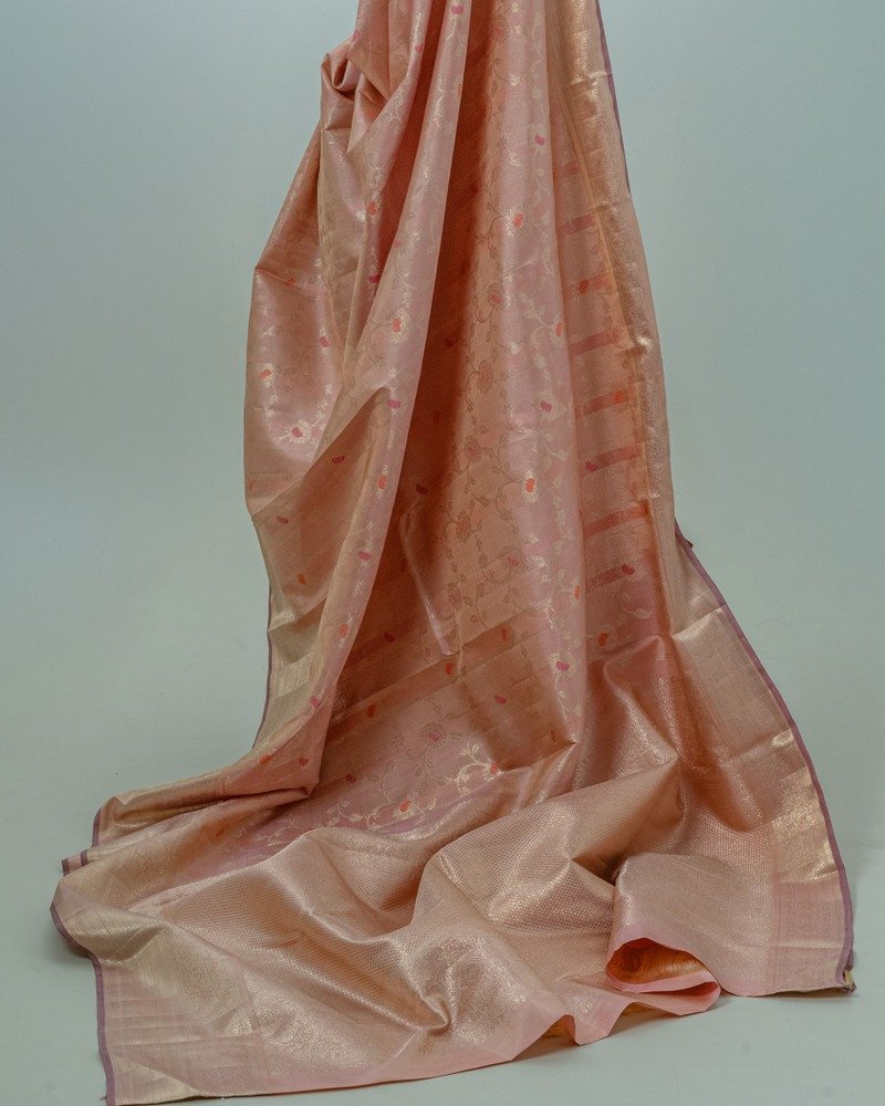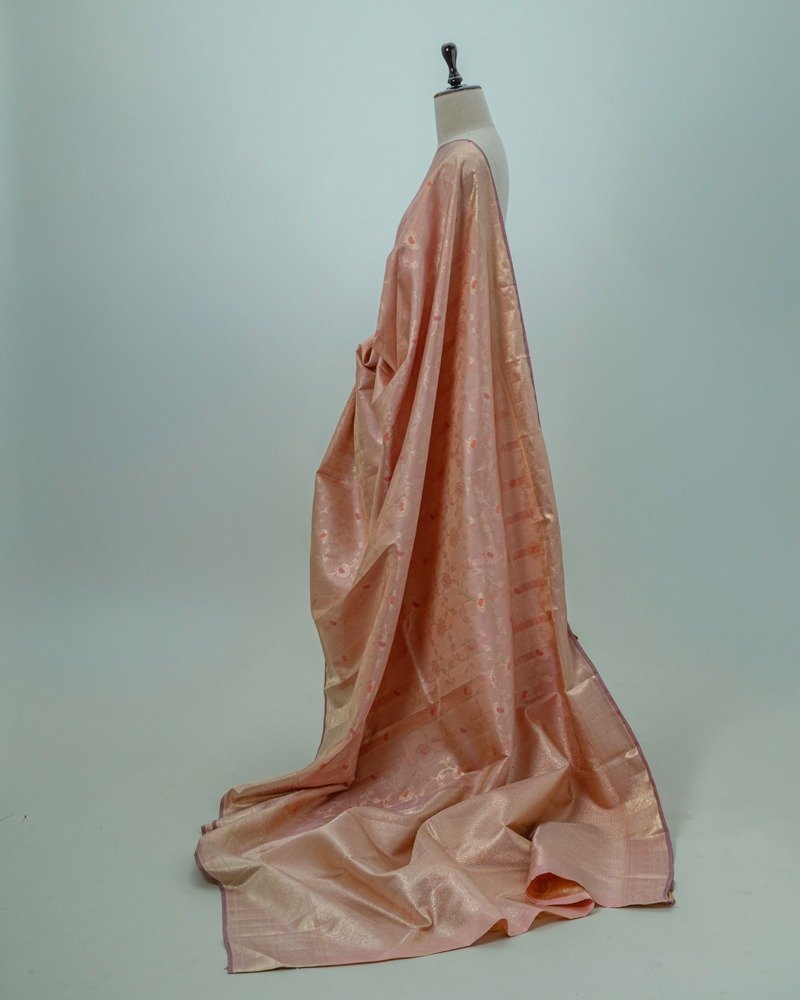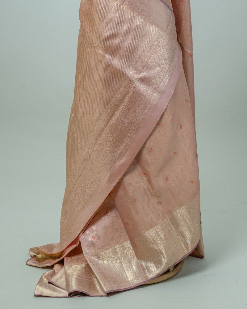 Peach Kanjivaram silk saree adorned with all-over zari-woven buttas and intricate Meena design