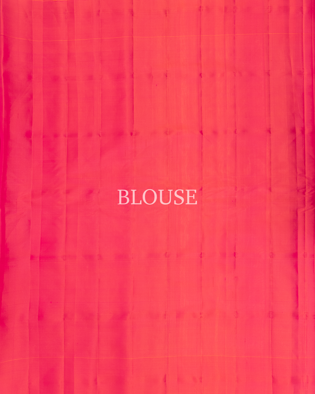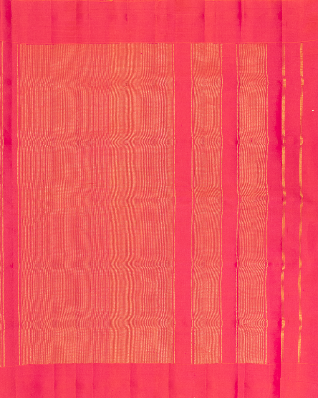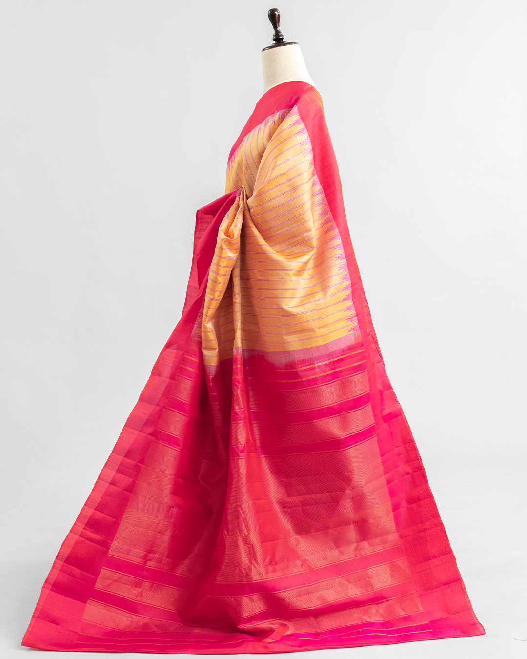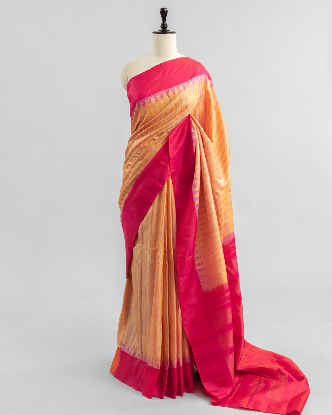 Peach-orange dual-tone body with pink horizontal stripes, a vibrant magenta border, and interlocked temple motifs.