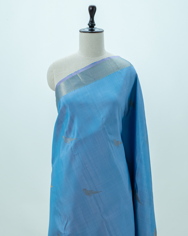 Peach pink Kanjivaram silk saree adorned with intricate gold and silver zari peacock motifs, complemented by rich all-over diamond weaves for a luxurious appeal.