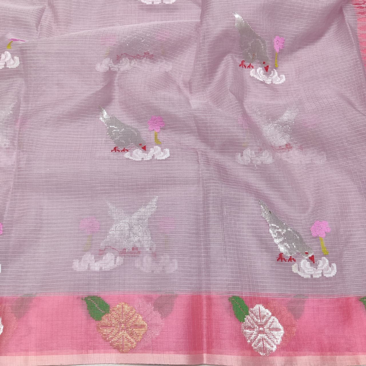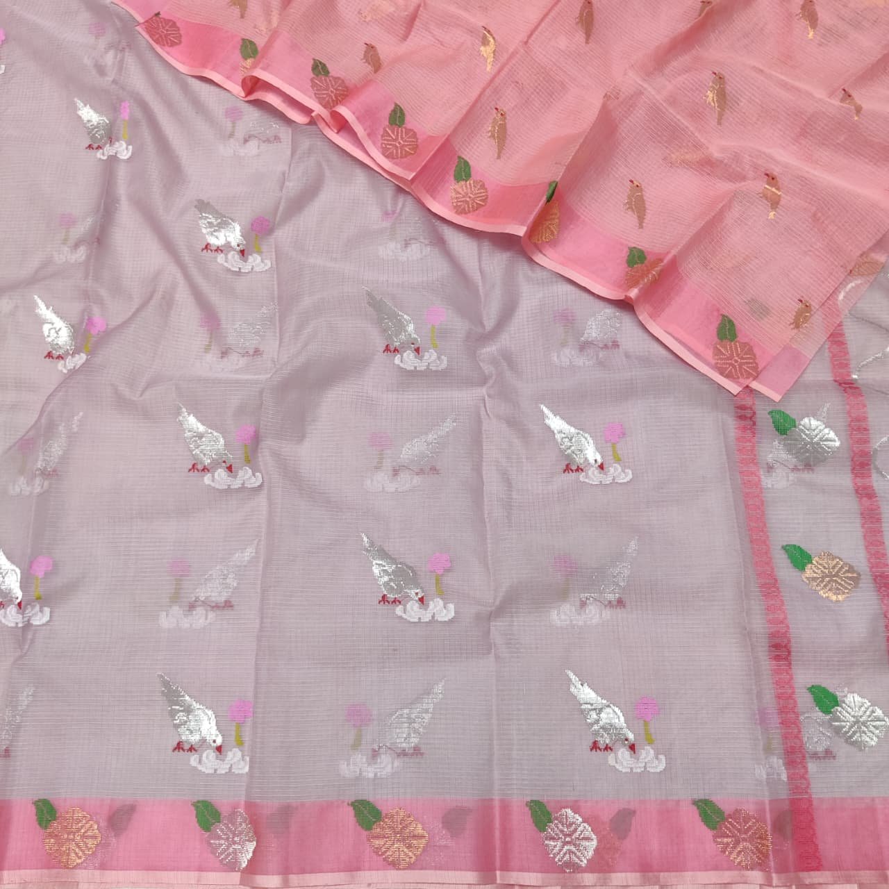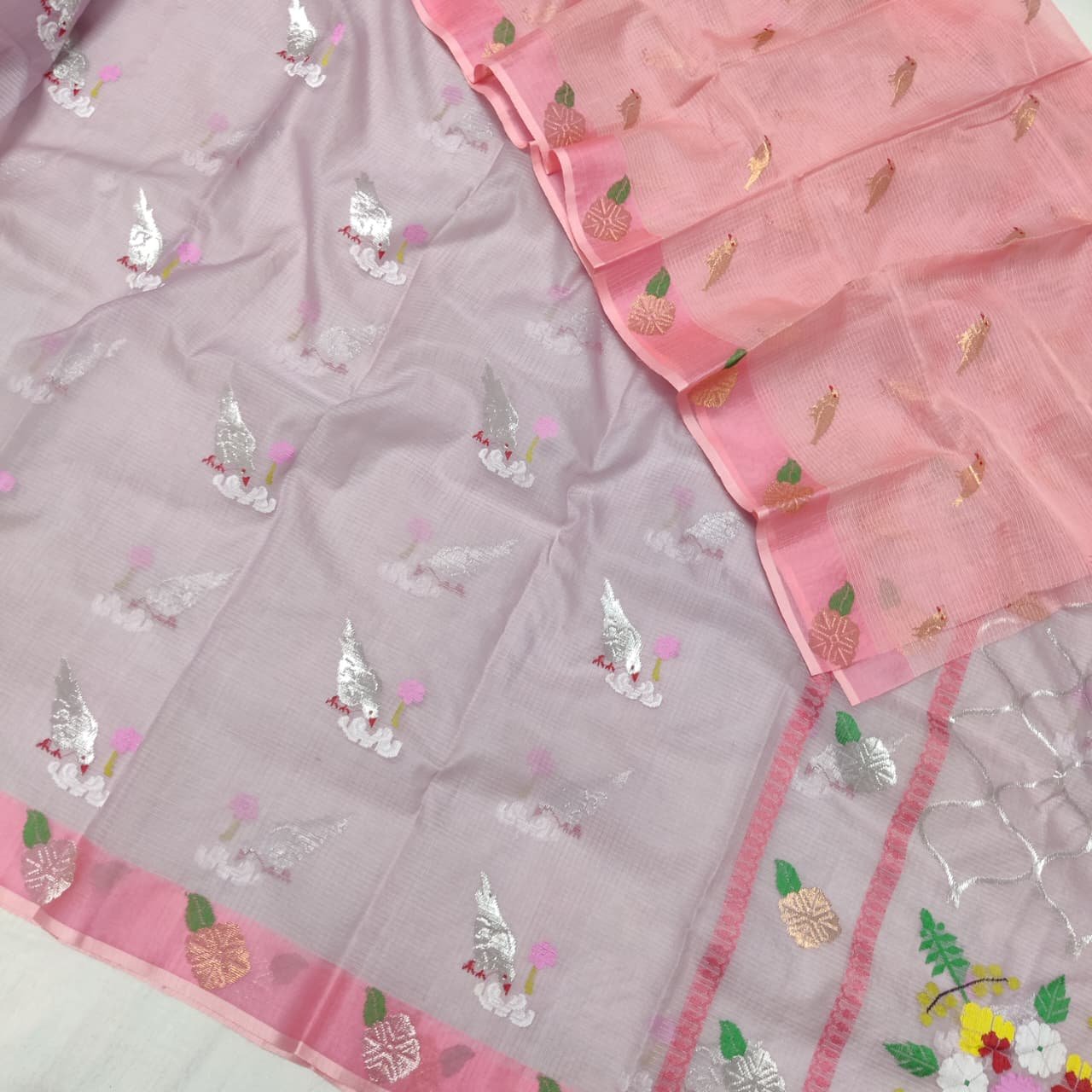 This pink and grey zari Kota silk saree has delicate motifs, a contrasting border, and comes with a matching blouse piece.