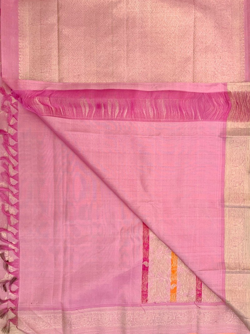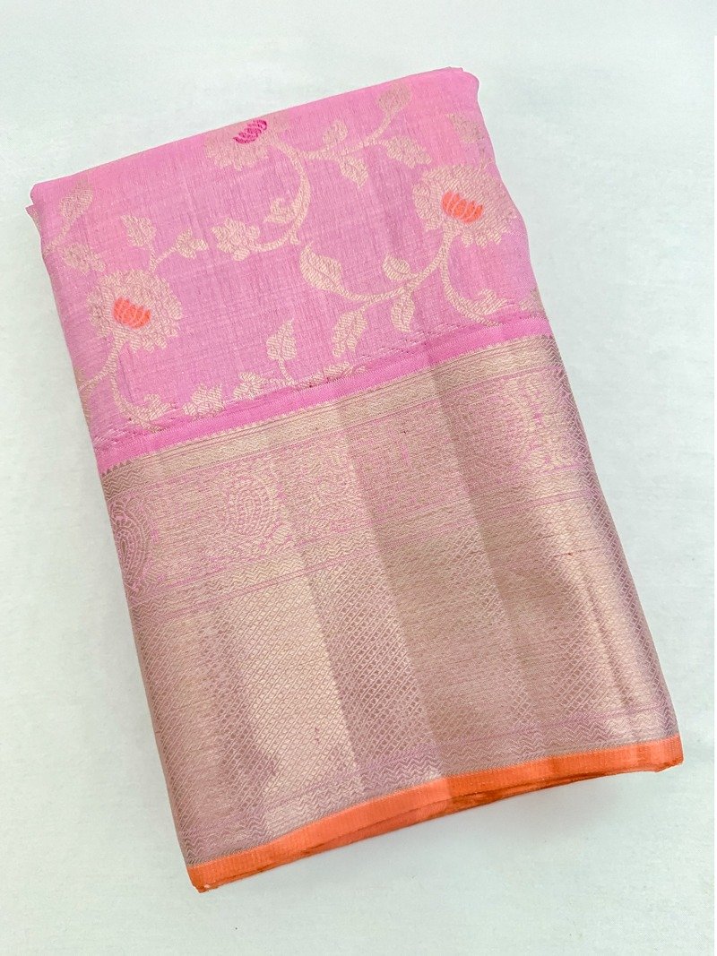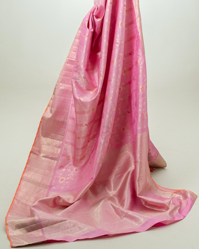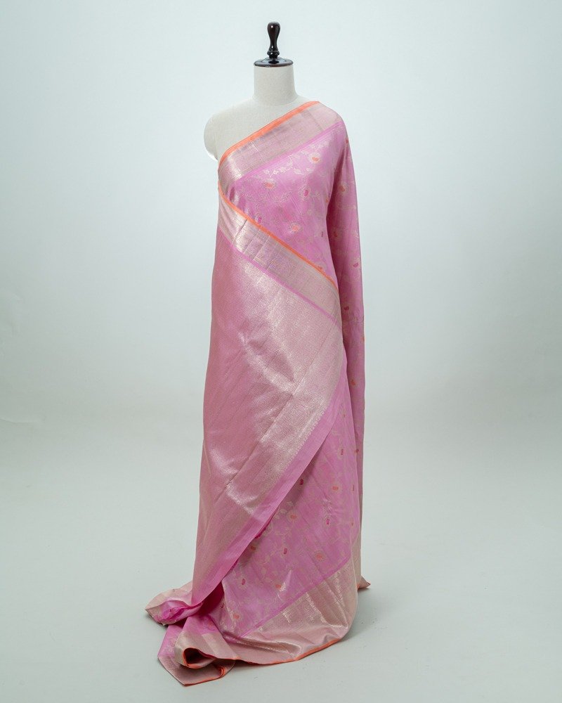 Pink Kanjivaram silk saree featuring meena design all-over, complemented by a Gold zari-woven border.