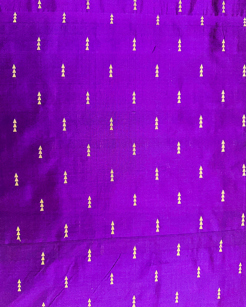 Lustrous Purple silk featuring delicate gold zari temple-style buttas (triple triangles) arranged in a neat, rhythmic, and elegant repeating pattern.
