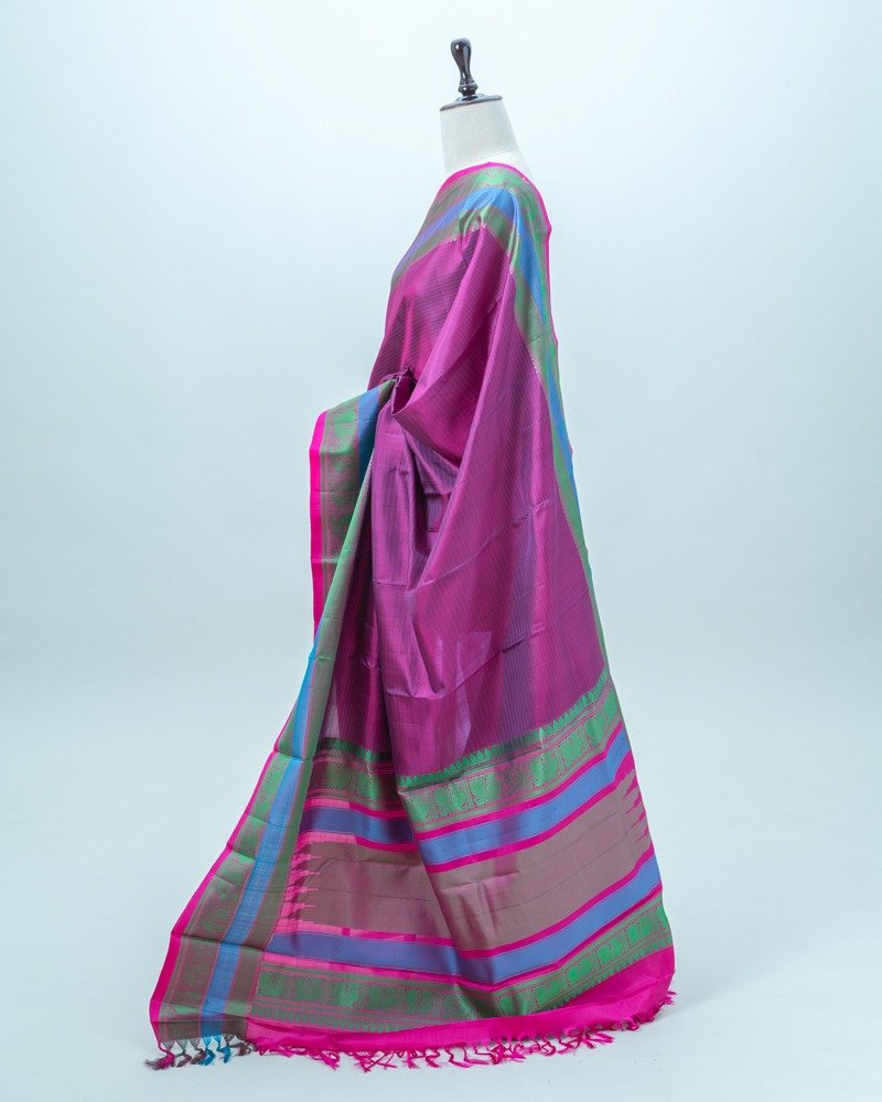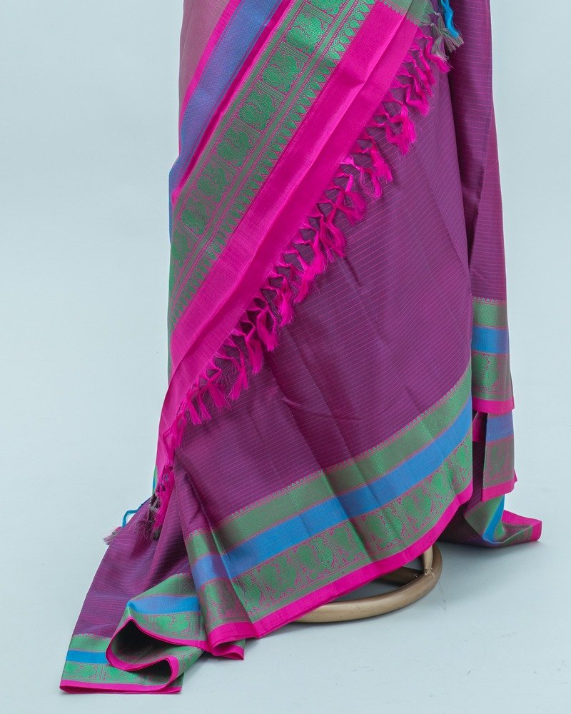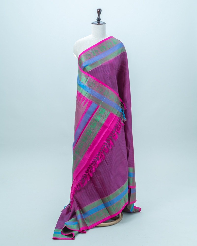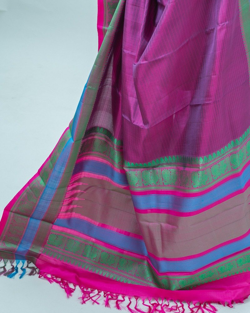 Rich magenta-pink with subtle violet Vairaoosi Kanjivaram Silk saree, complemented by a dual-tone blue and green zari border and a vibrant pink selvedge.