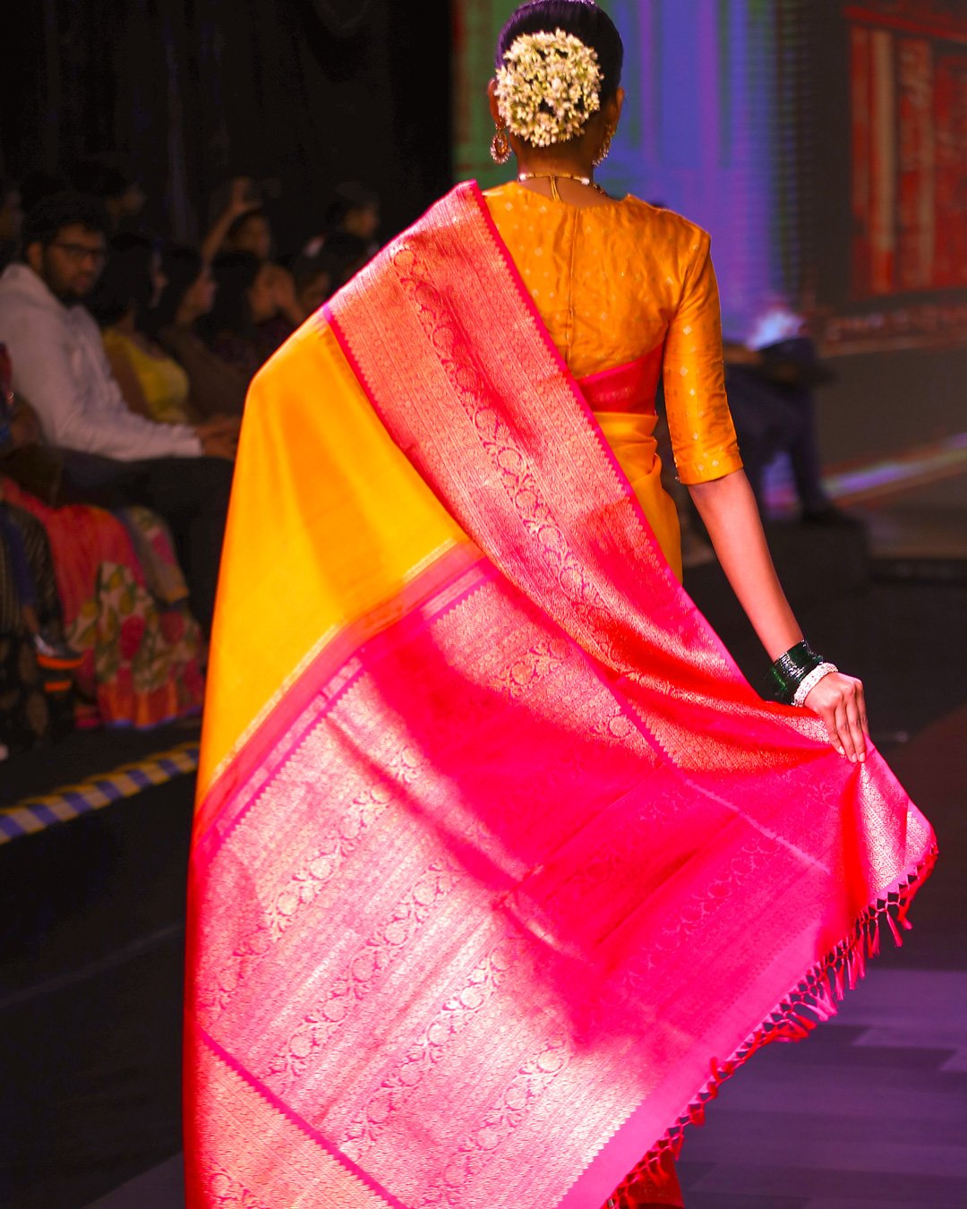 Radiant mustard yellow Kanchipattu saree featuring a smooth plain body, paired with a deep pink Korvai border intricately woven with traditional Rekku temple patterns and ornate Kodivallar floral vines in gold zari.