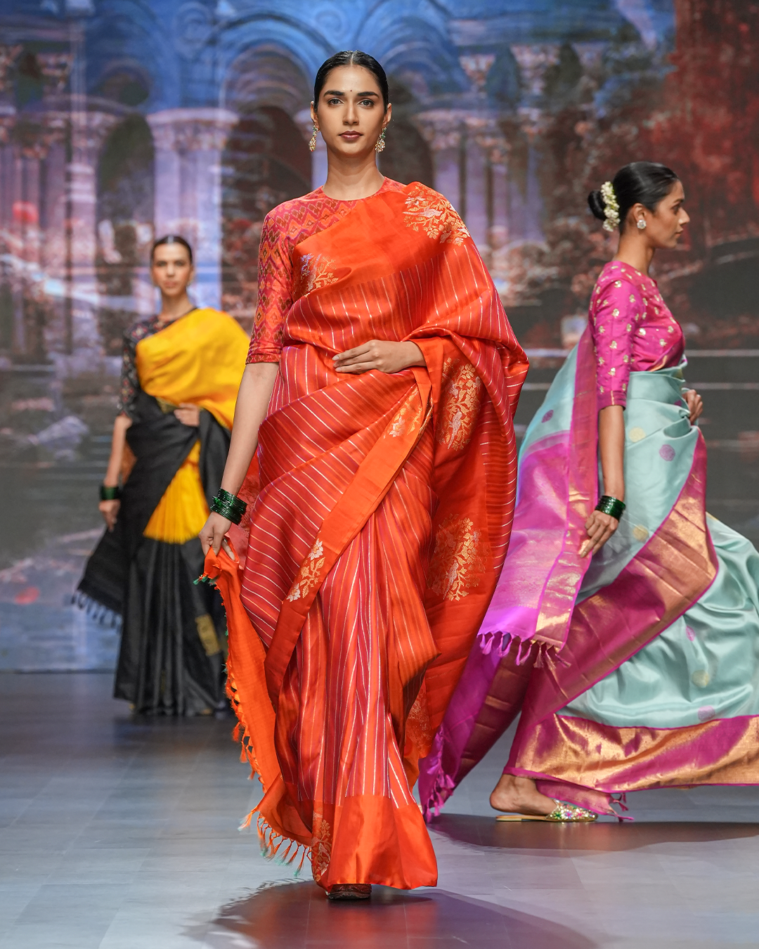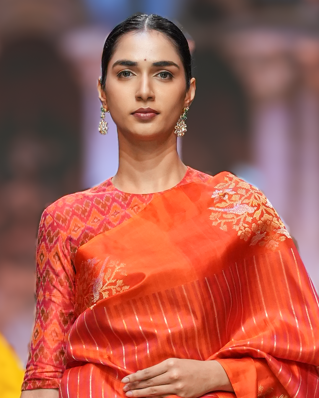 A vivid red body featuring intricately woven Gold & Silver zari stripes, paired with a rich traditional border featuring bird and floral zari motifs, evoking nature-inspired storytelling in classic Kanchipattu weave.