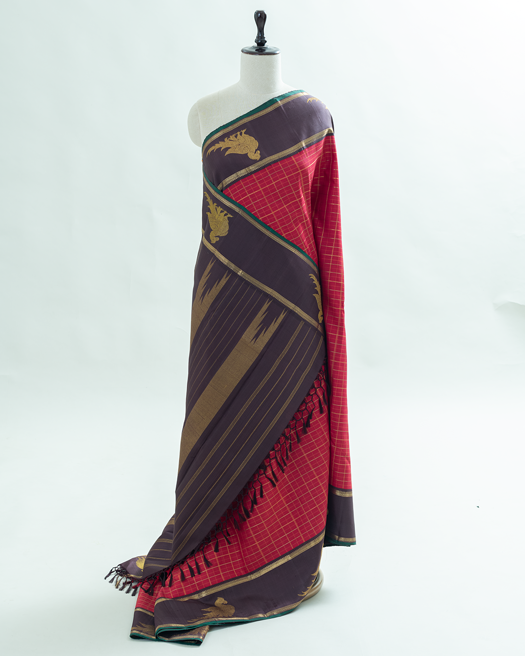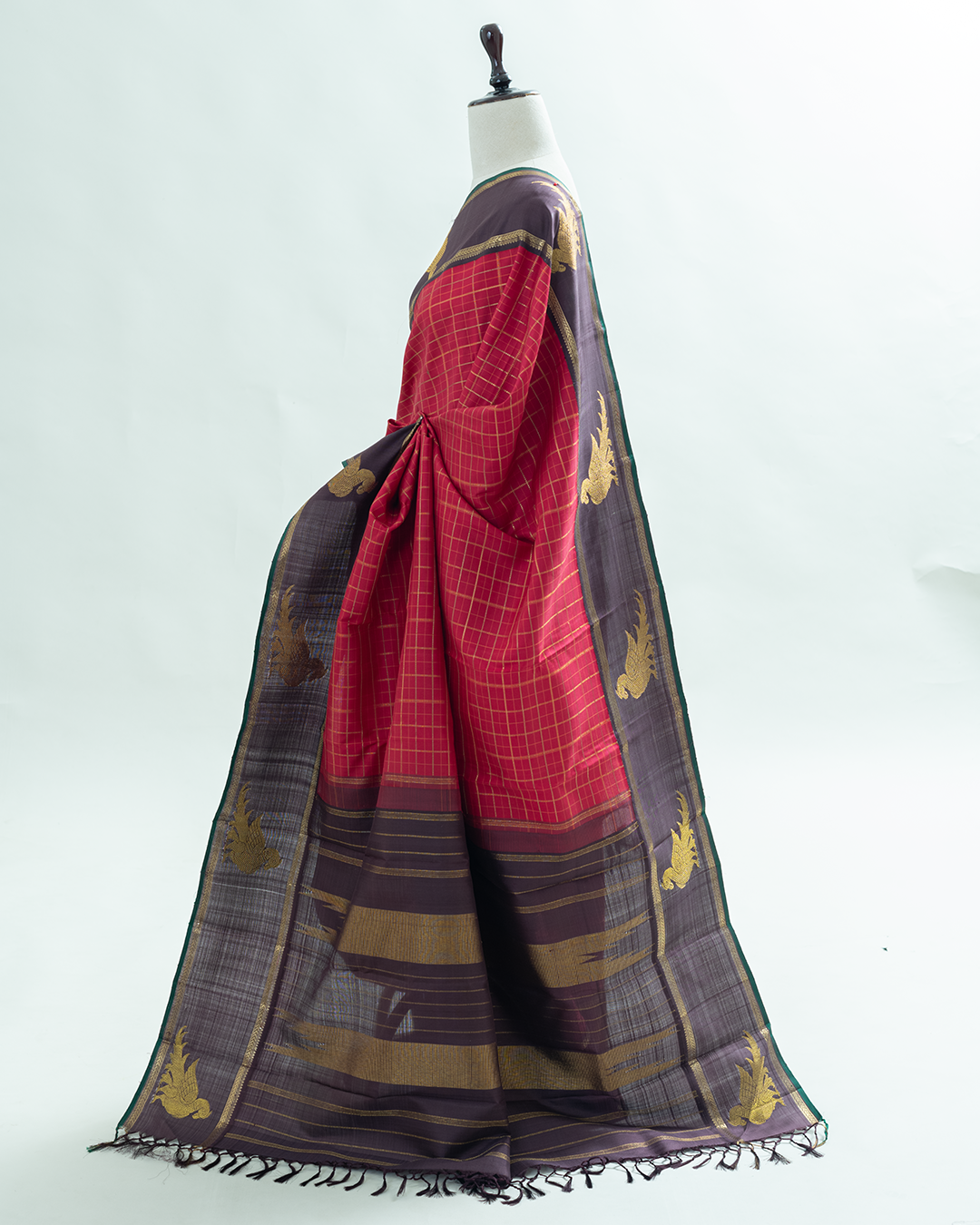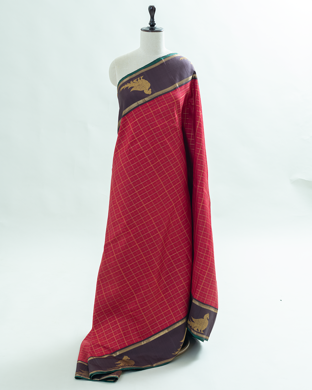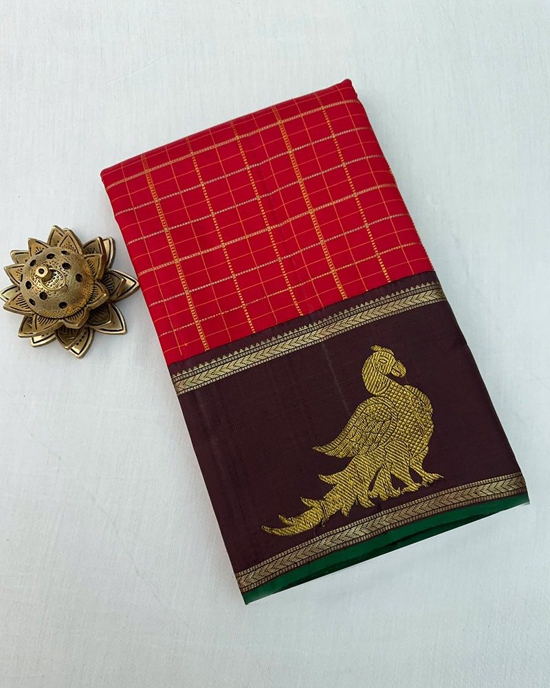 Exquisite Maroon Kanjivaram silk saree woven with fine zari checks, enriched with coffee – toned korvai border, majestic golden parrot motif and green selvedge.