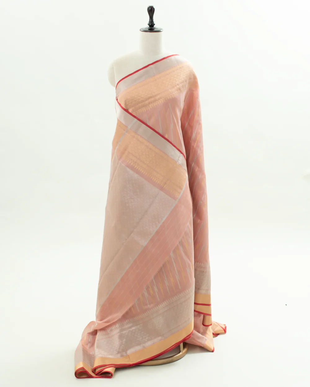 Elegant beige and mauve Banarasi silk saree adorned with delicate golden motifs, maroon border.
