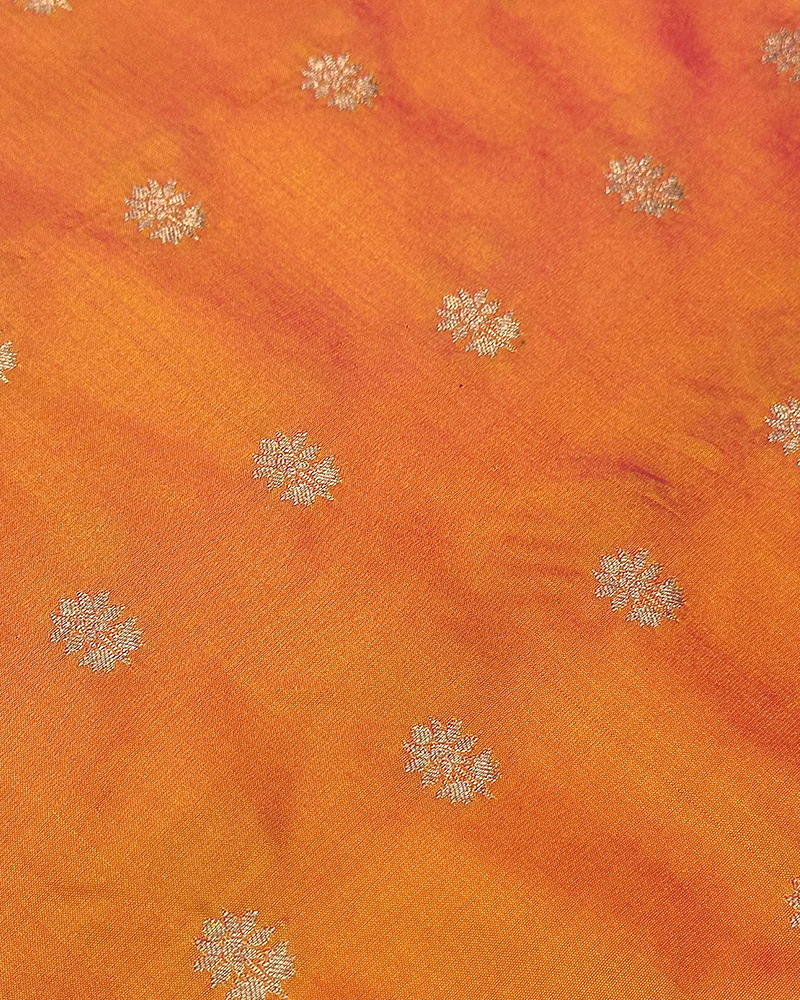 Rich royal blue raw silk fabric highlighted with intricate golden floral buttas.