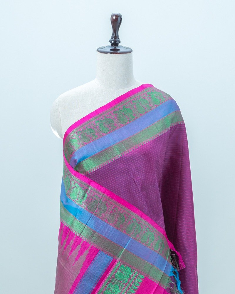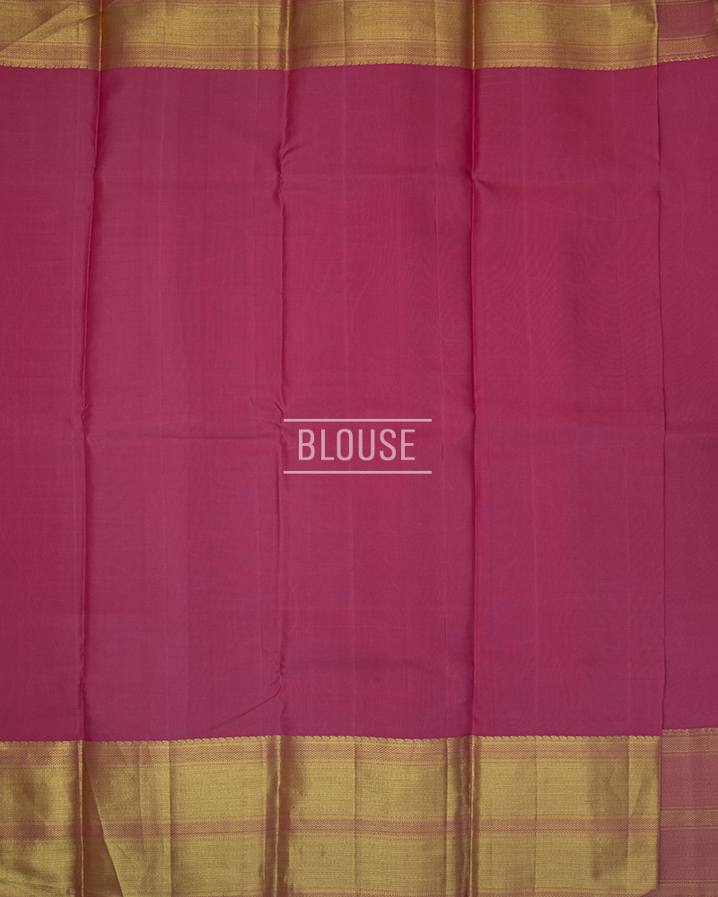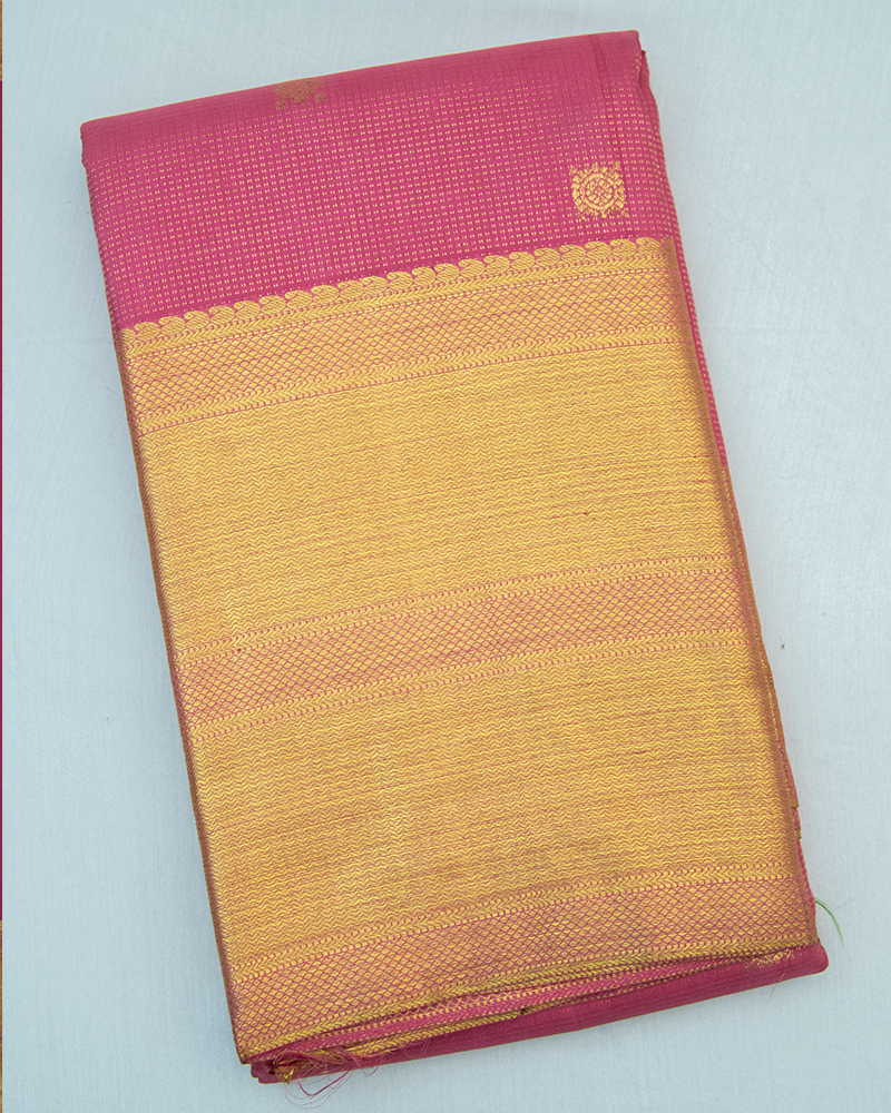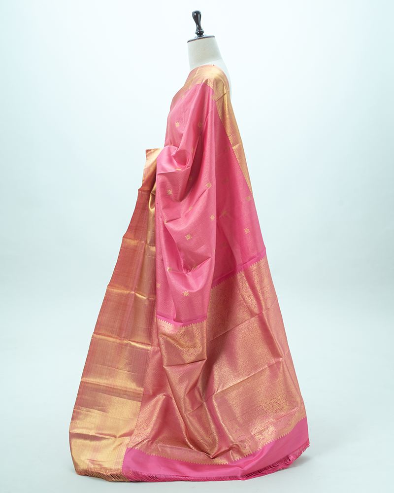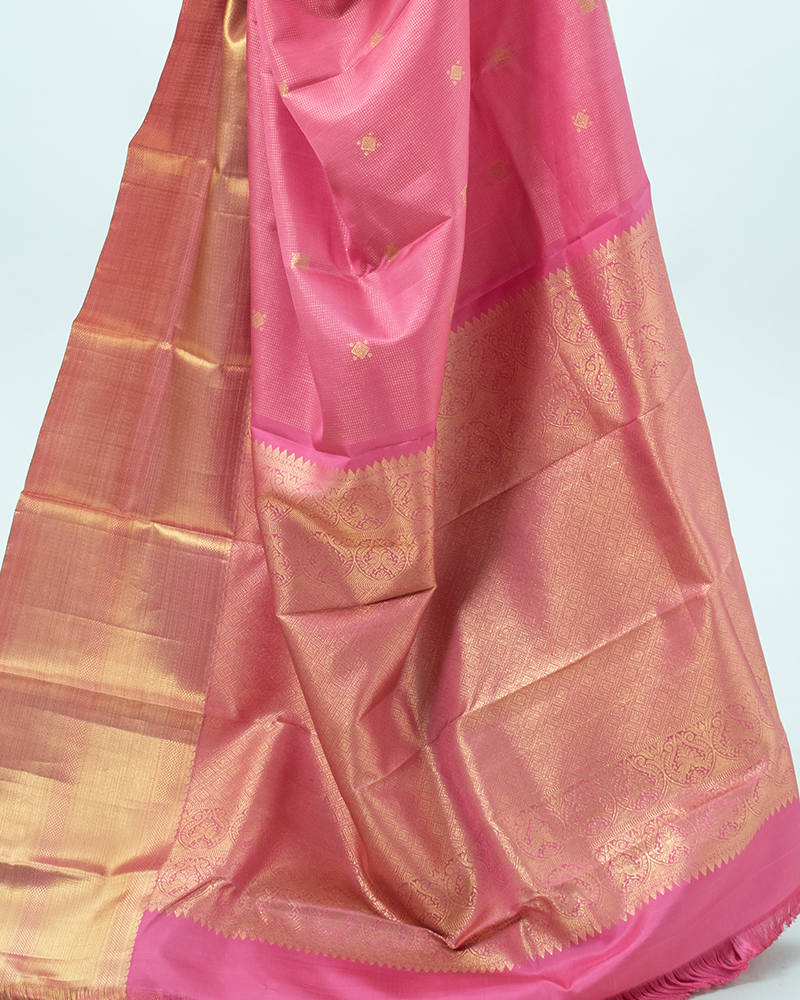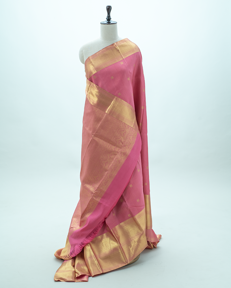 Rose pink silk Kanjivaram with subtle zari stripe texture, dotted square buttas, and a magnificent pure gold zari pallu.