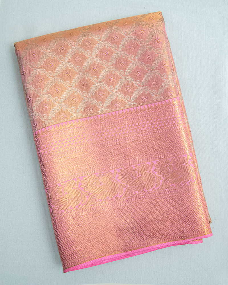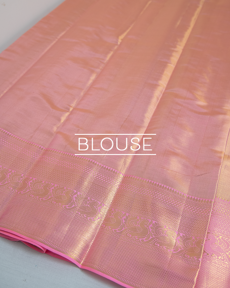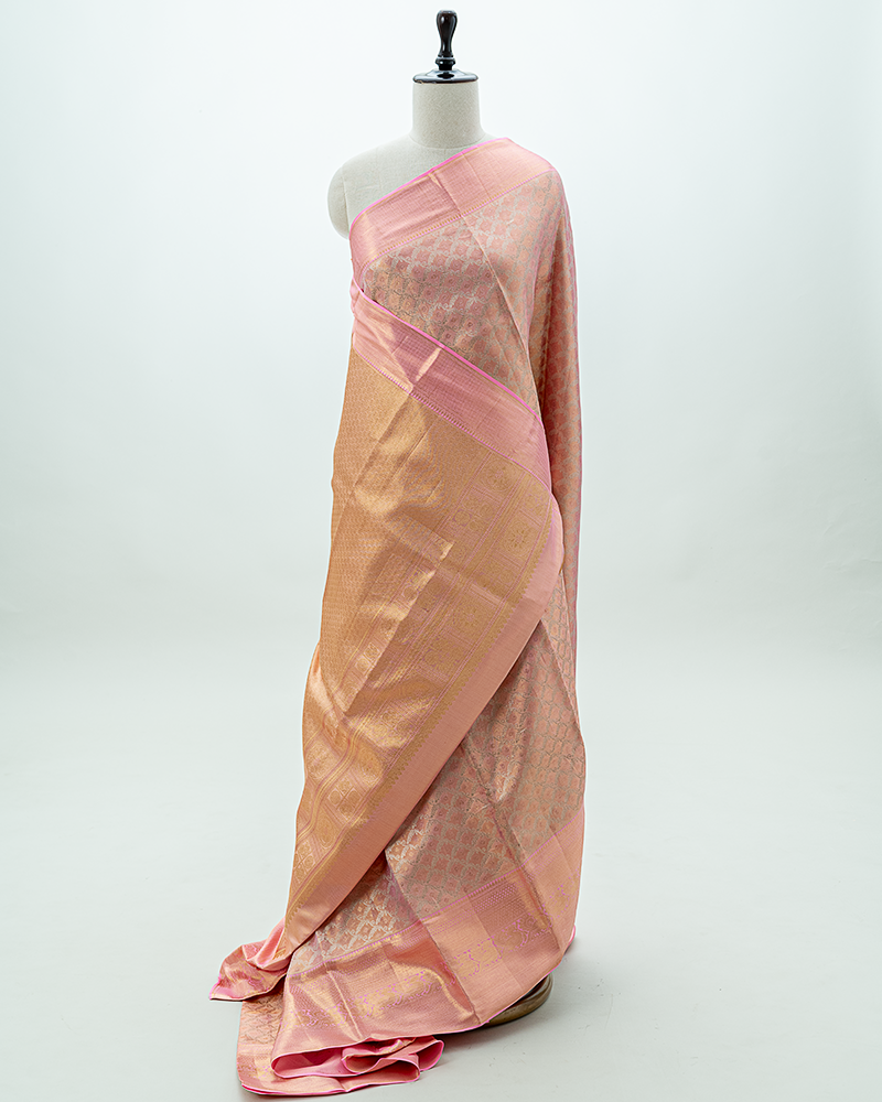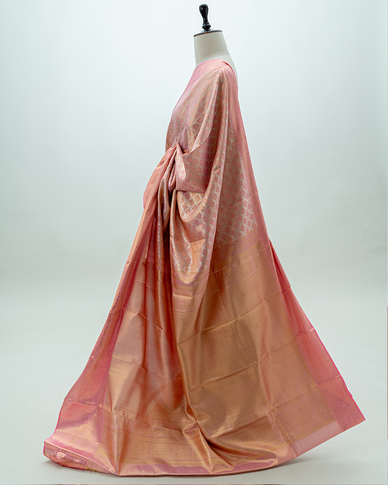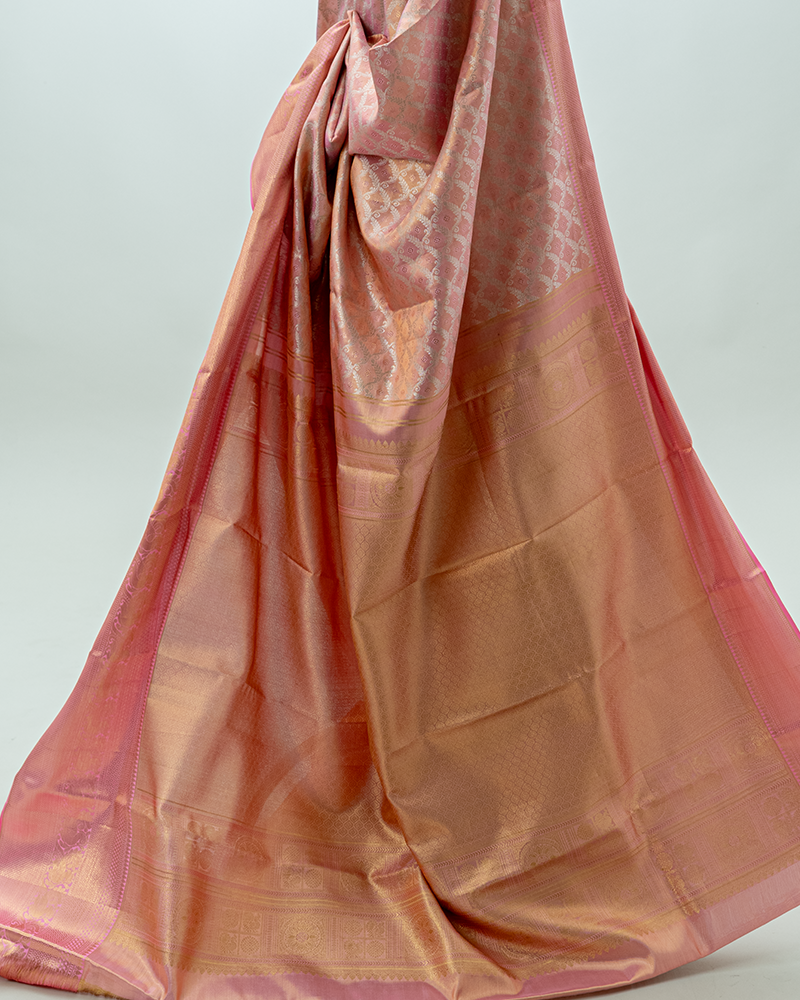 This saree is a shimmering Rose Pink Tissue Kanjivaram with self-colored silk and Gold zari creating an elaborate geometric Jari Kattams pattern.