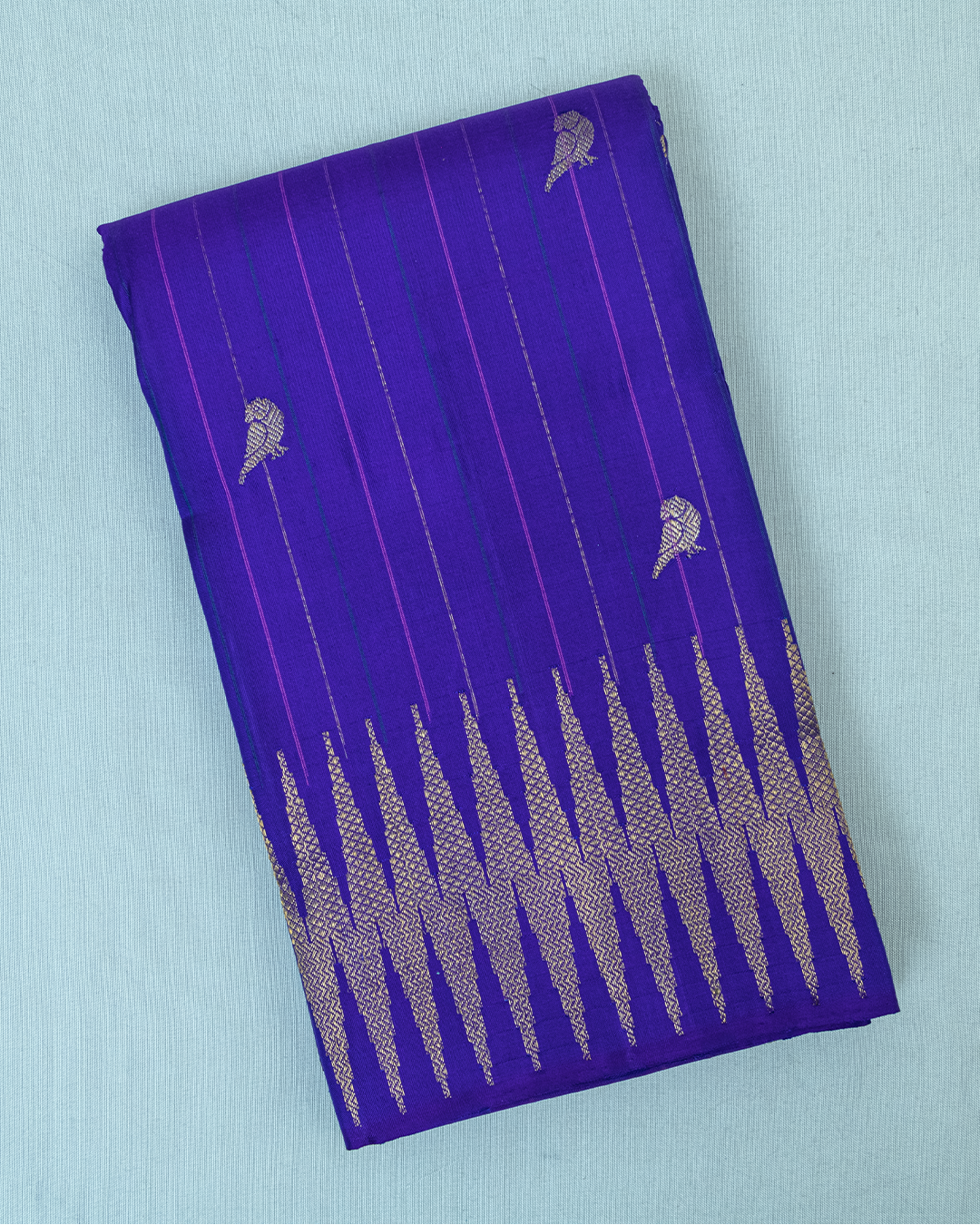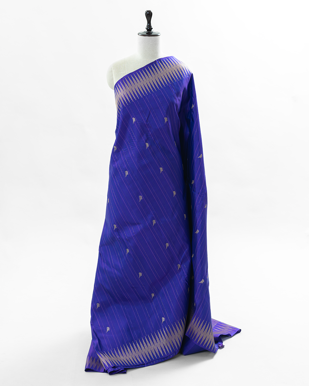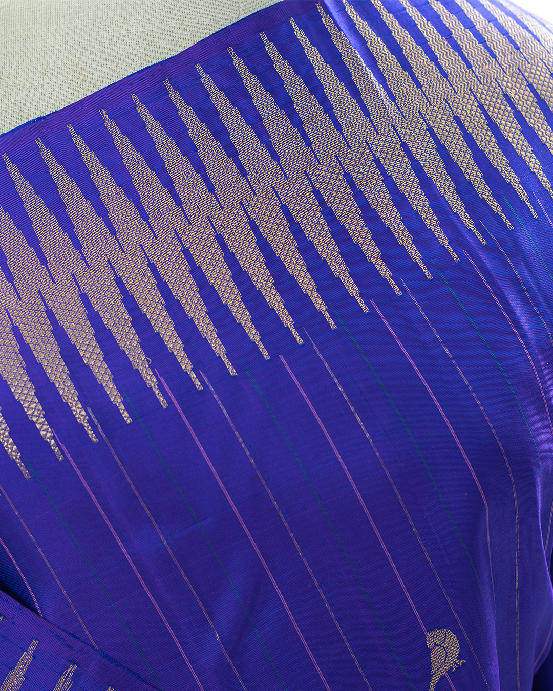 Classic Vibrant Royal Blue Kanjivaram silk with subtle stripes and gold buttas. It features an intensely woven pallu with a chevron design