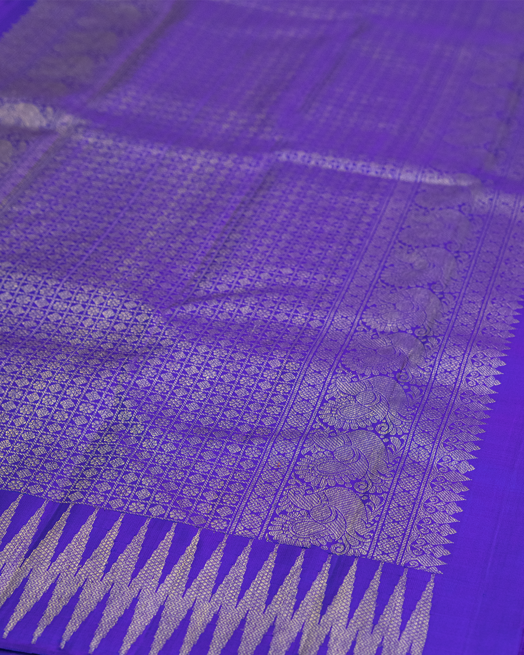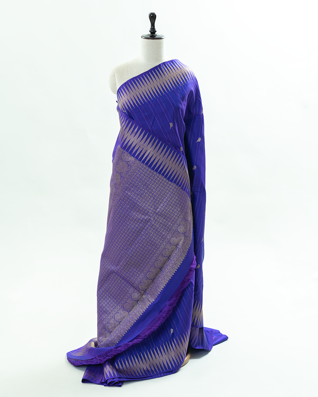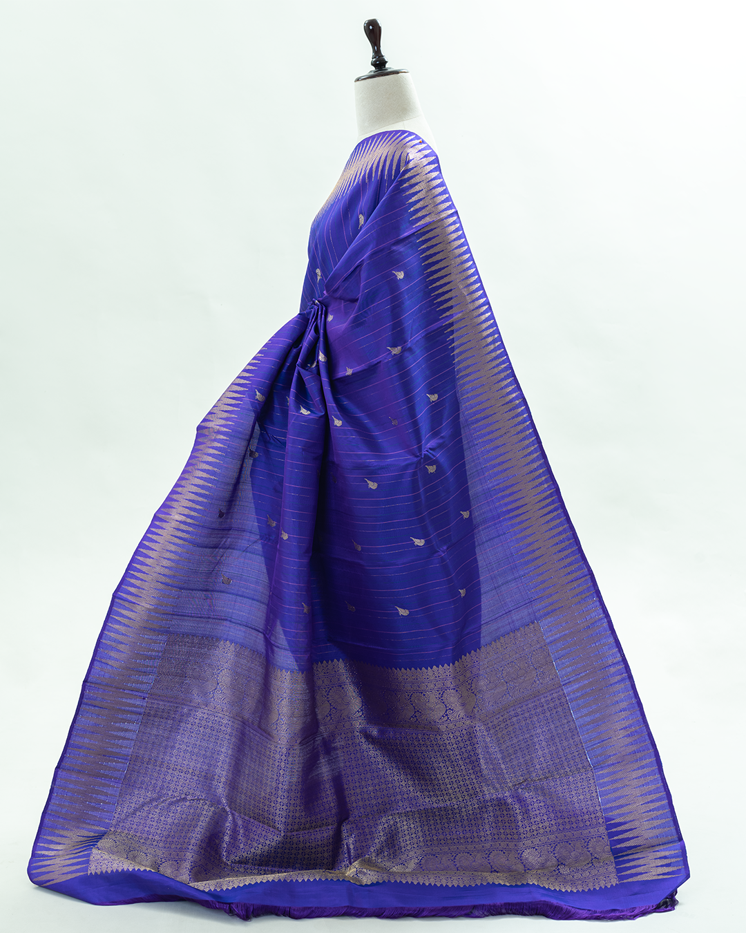 Classic Vibrant Royal Blue Kanjivaram silk with subtle stripes and gold buttas. It features an intensely woven pallu with a chevron design