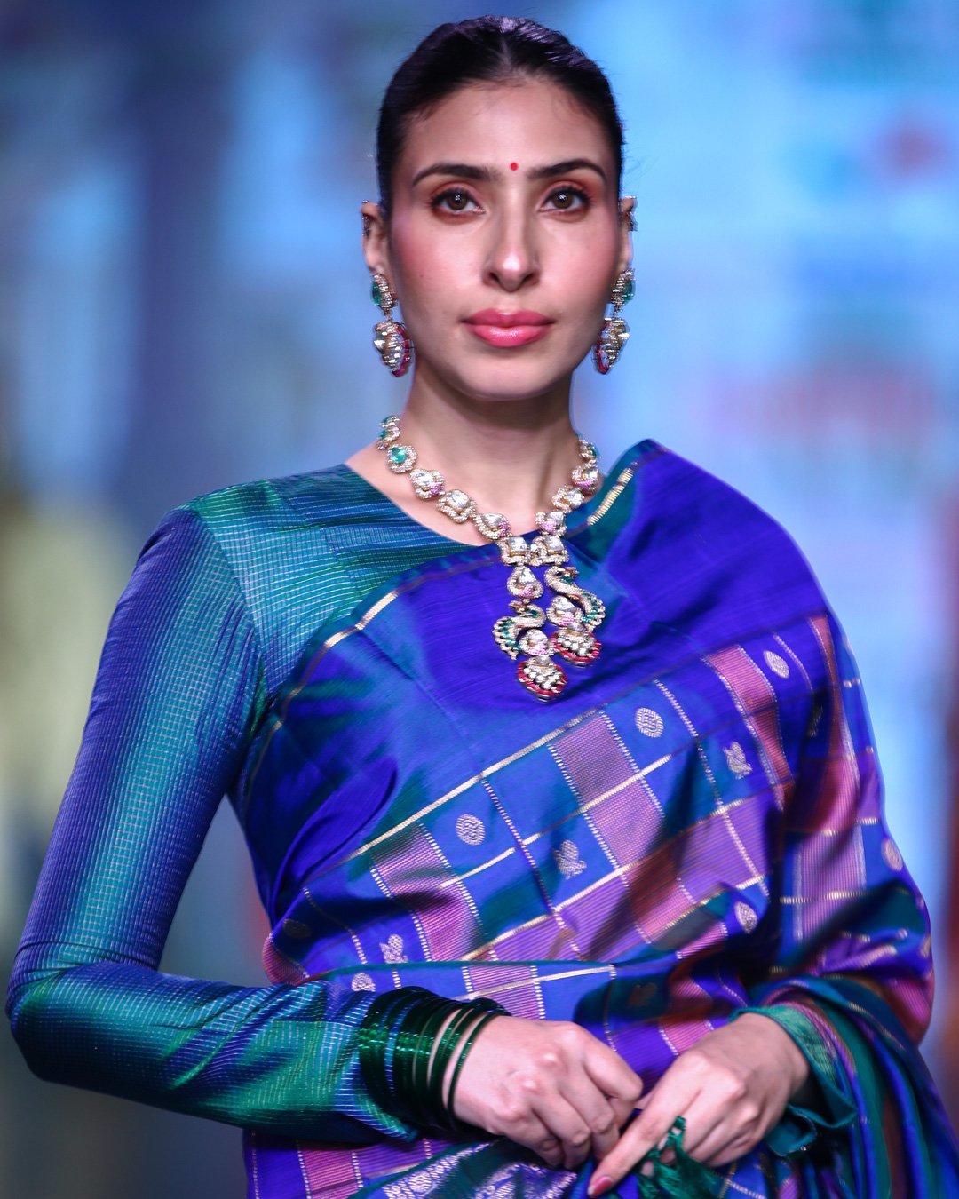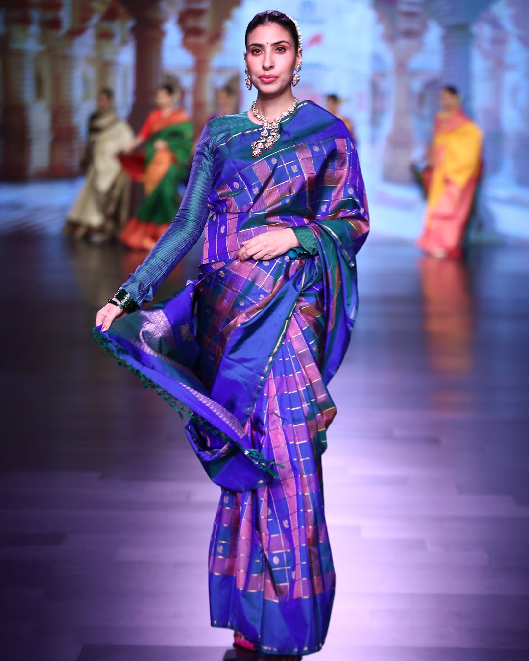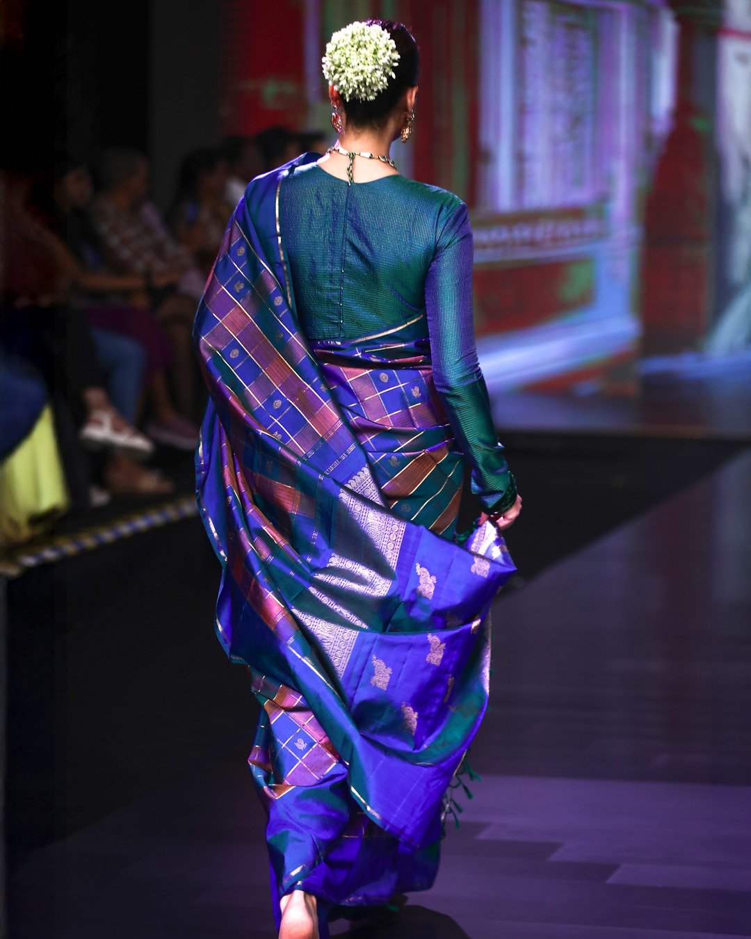 Royal blue Kanchipattu silk with kattam, poo chakram zari motifs, balanced contrast border, structured weave, heritage sophistication.