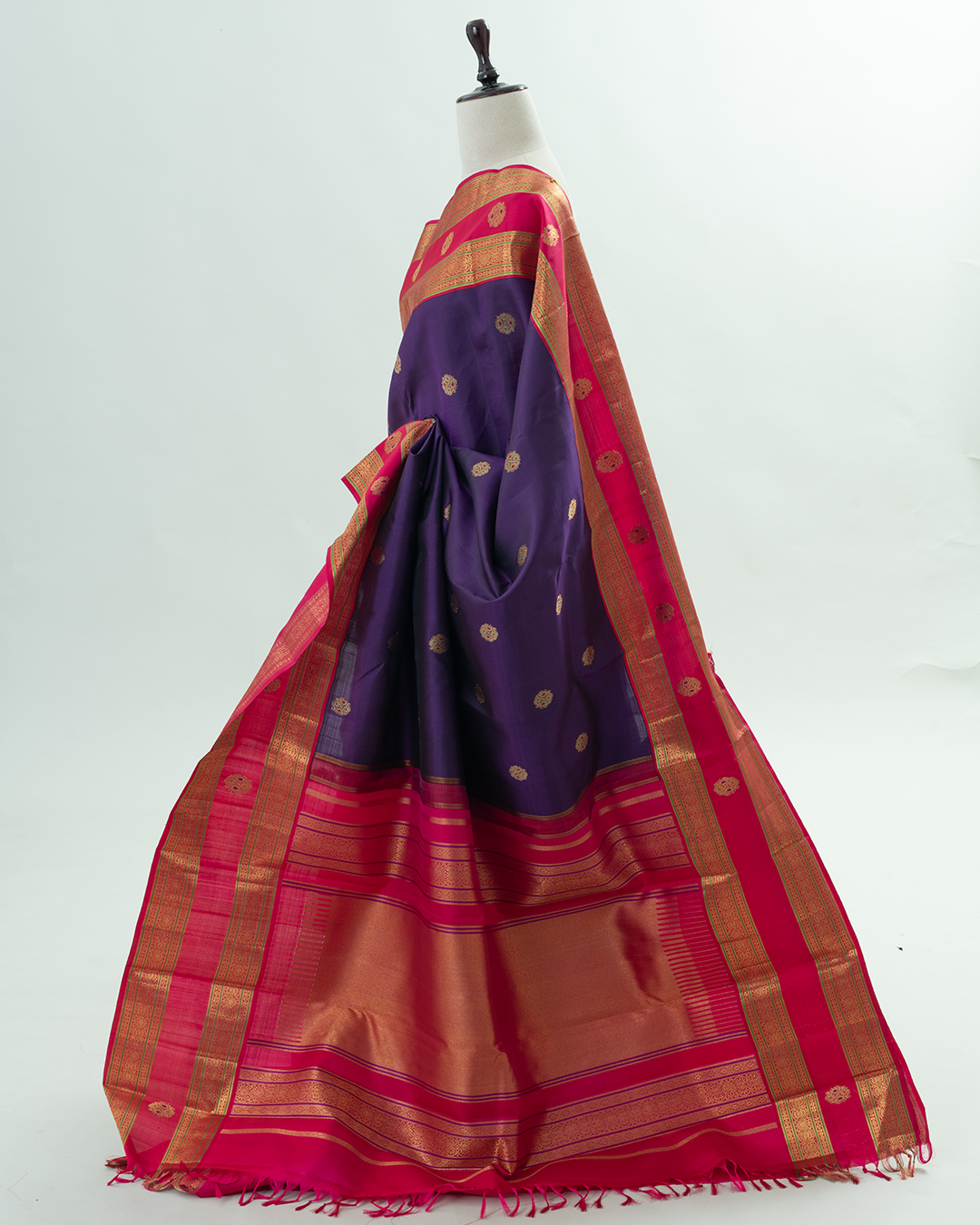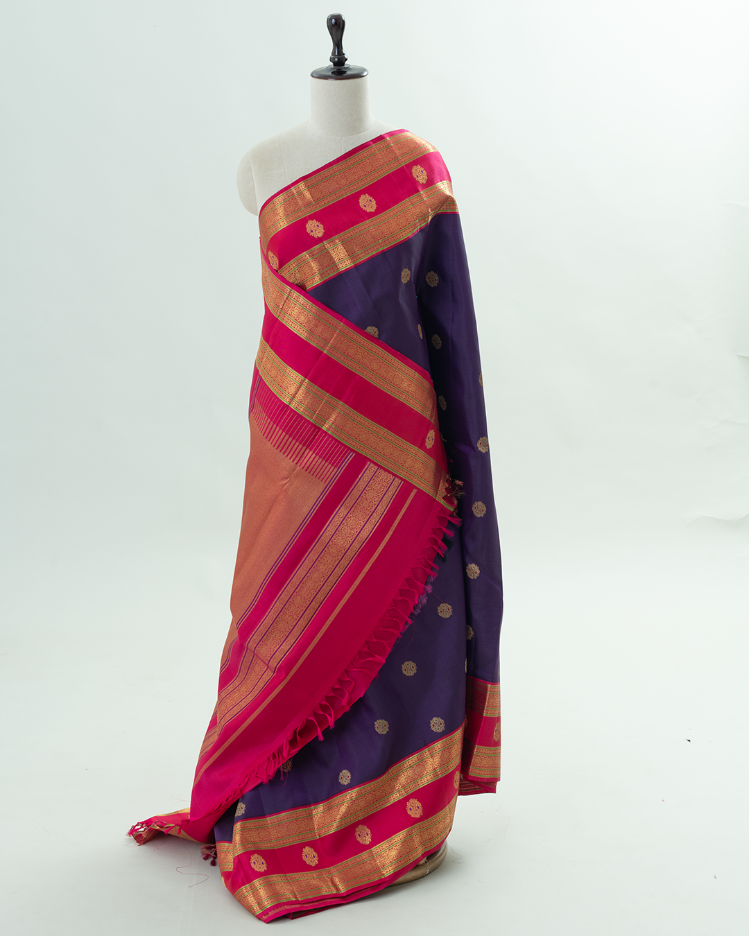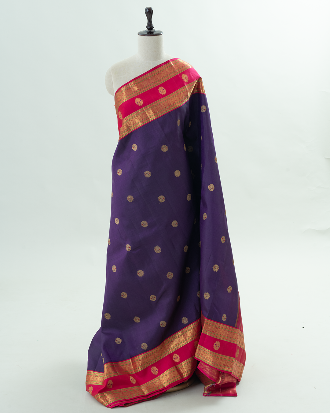 This elegant royal purple Kanjivaram saree features gold zari buttas and a striking magenta pink border accented with intricate gold-woven traditional motifs.