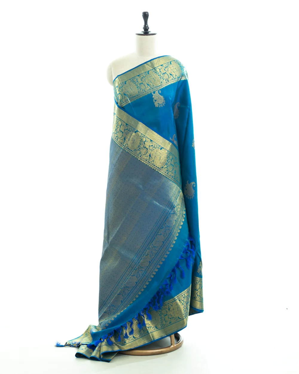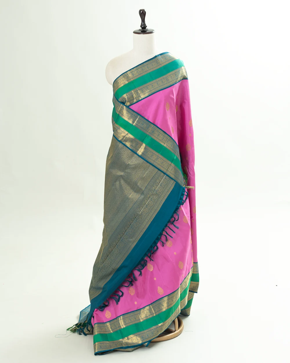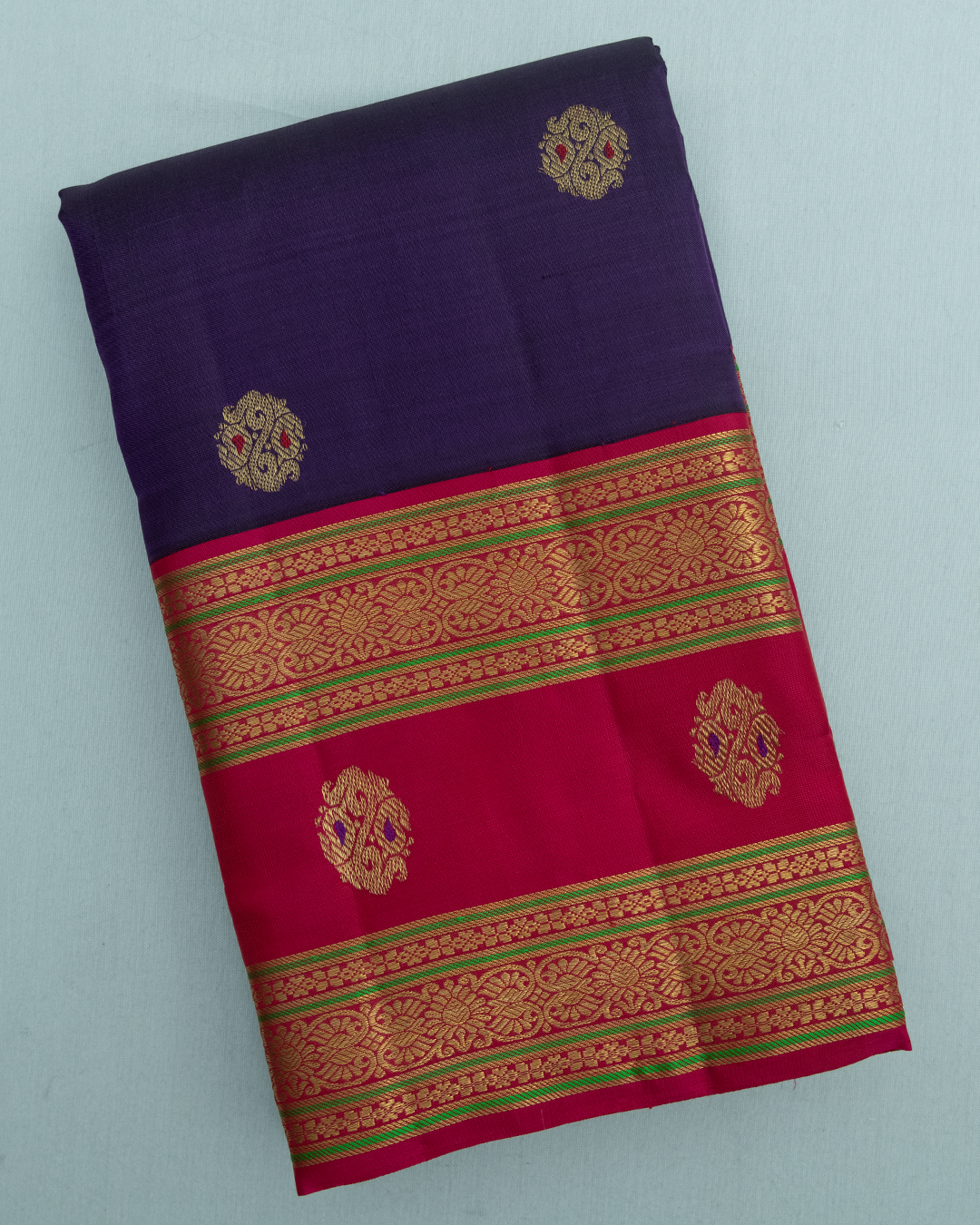 This elegant royal purple Kanjivaram saree features gold zari buttas and a striking magenta pink border accented with intricate gold-woven traditional motifs.