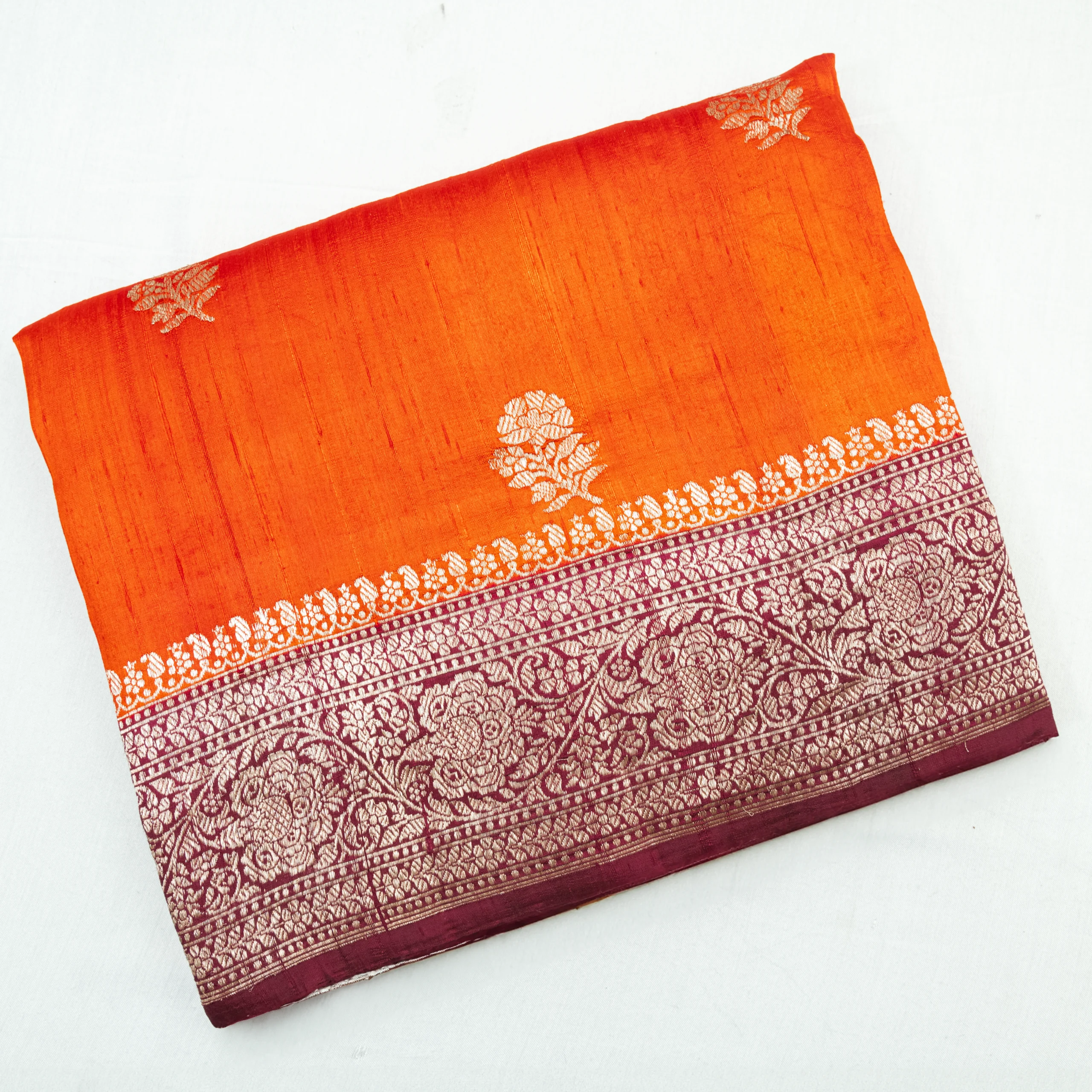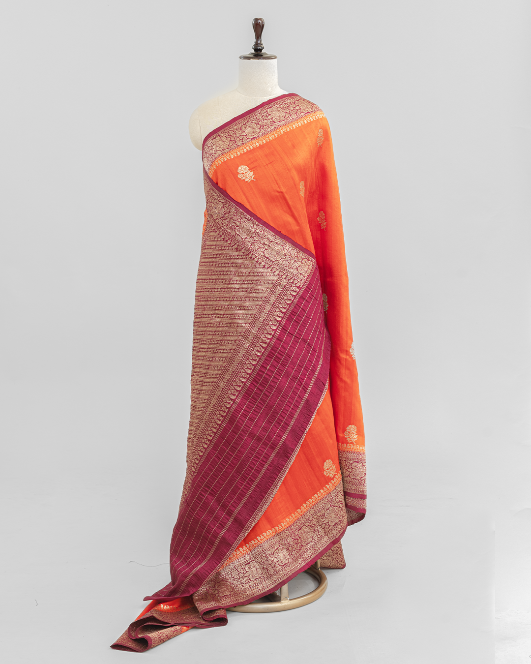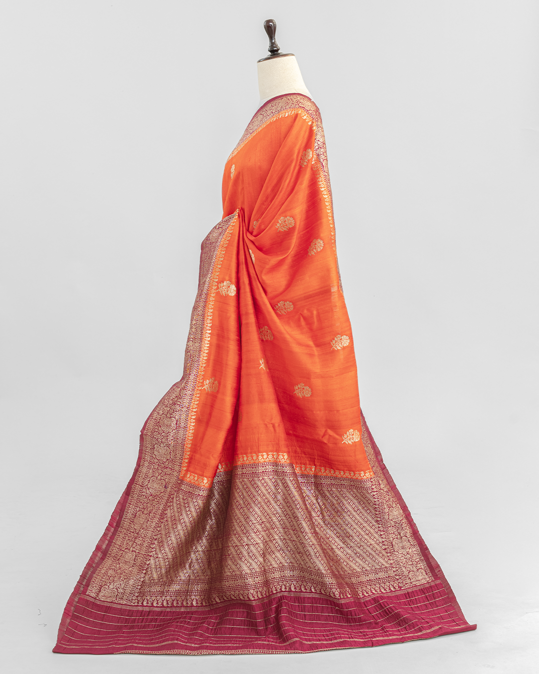 Textured Rust Orange Raw Silk body with gold floral Buttis, paired with a Wine Maroon border. This Kadhwa weave features intricate gold Meenakari floral scrolls and diagonal gold zari stripes Pallu.