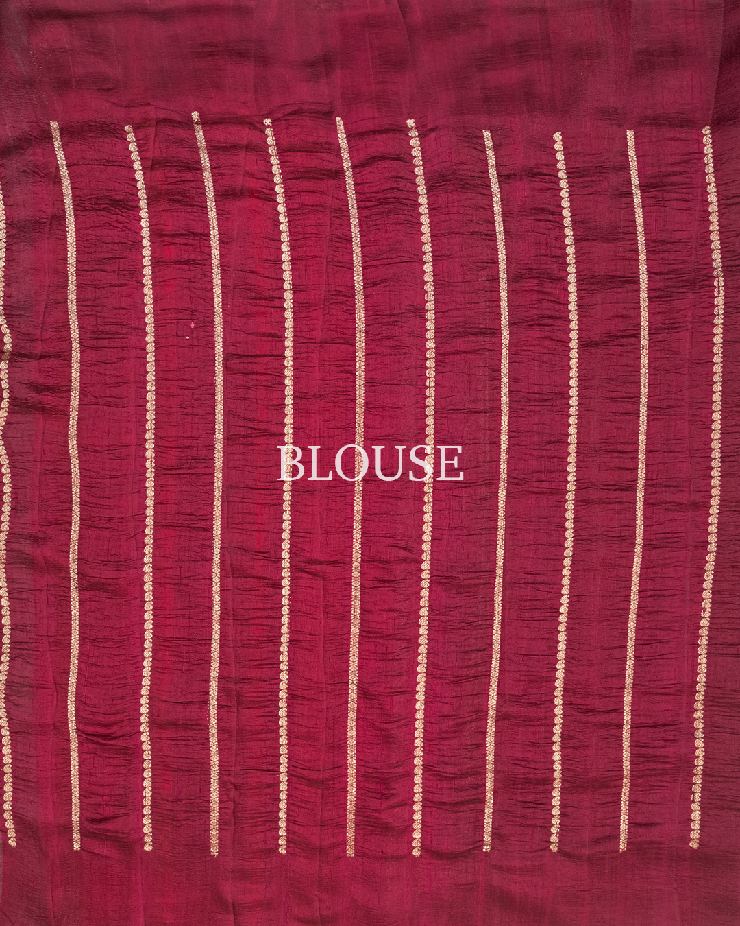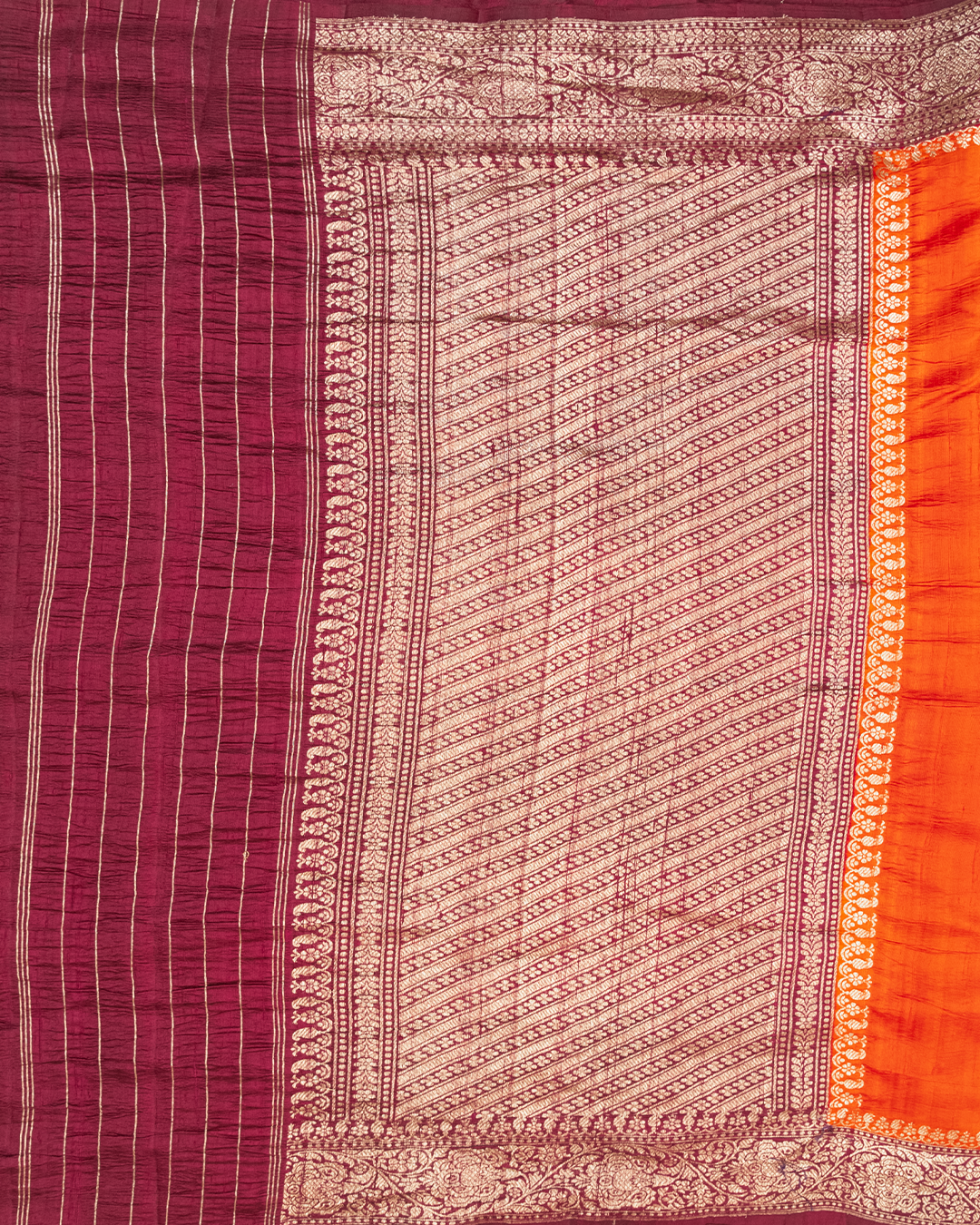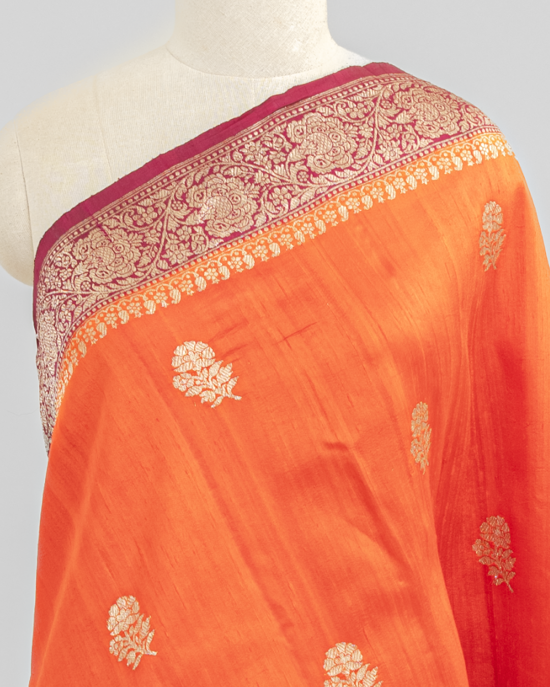 Textured Rust Orange Raw Silk body with gold floral Buttis, paired with a Wine Maroon border. This Kadhwa weave features intricate gold Meenakari floral scrolls and diagonal gold zari stripes Pallu.