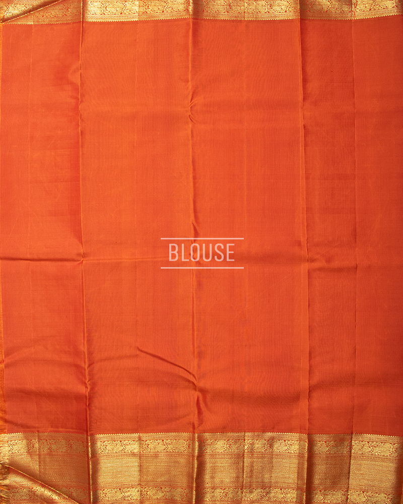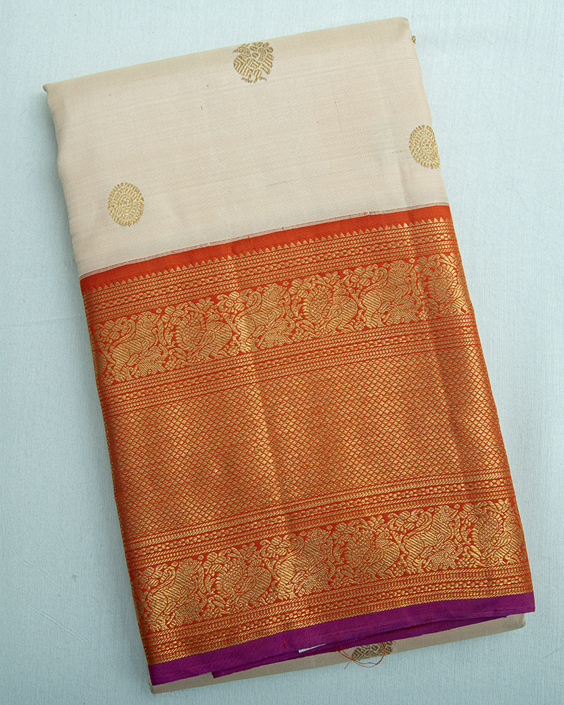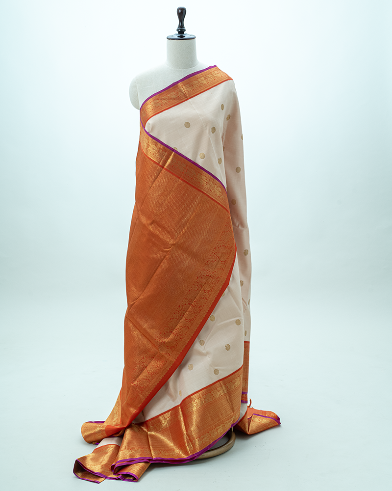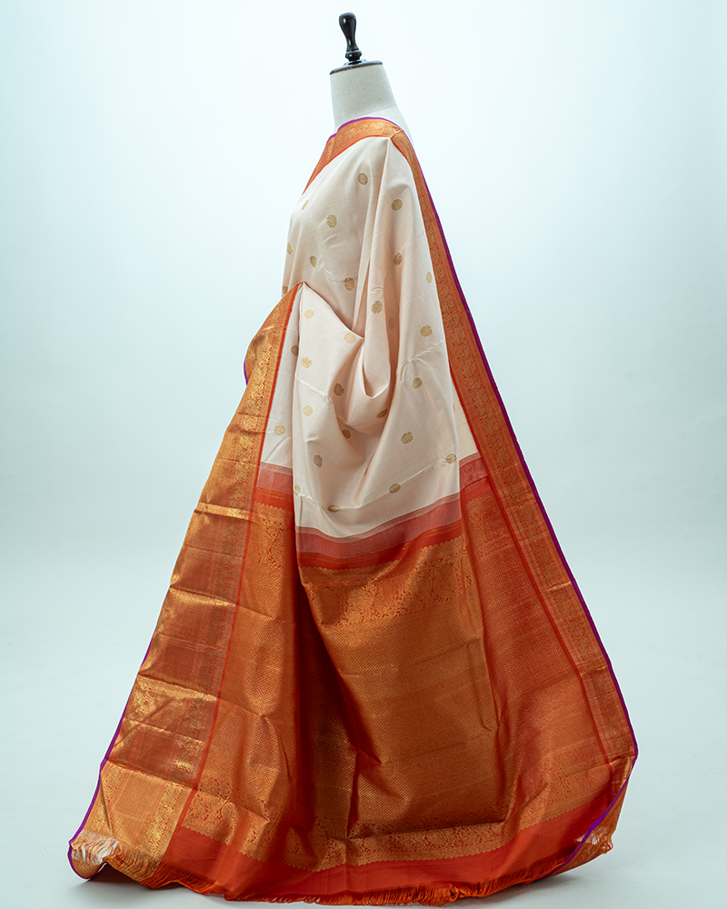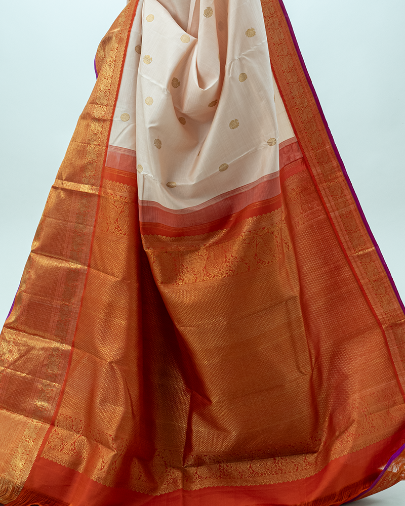 A Chandana silk body with Maanga buttas meets a rich Mayil Kazhuthu contrast Korvai border. An heirloom Kanchi pattu woven with pure Zari.