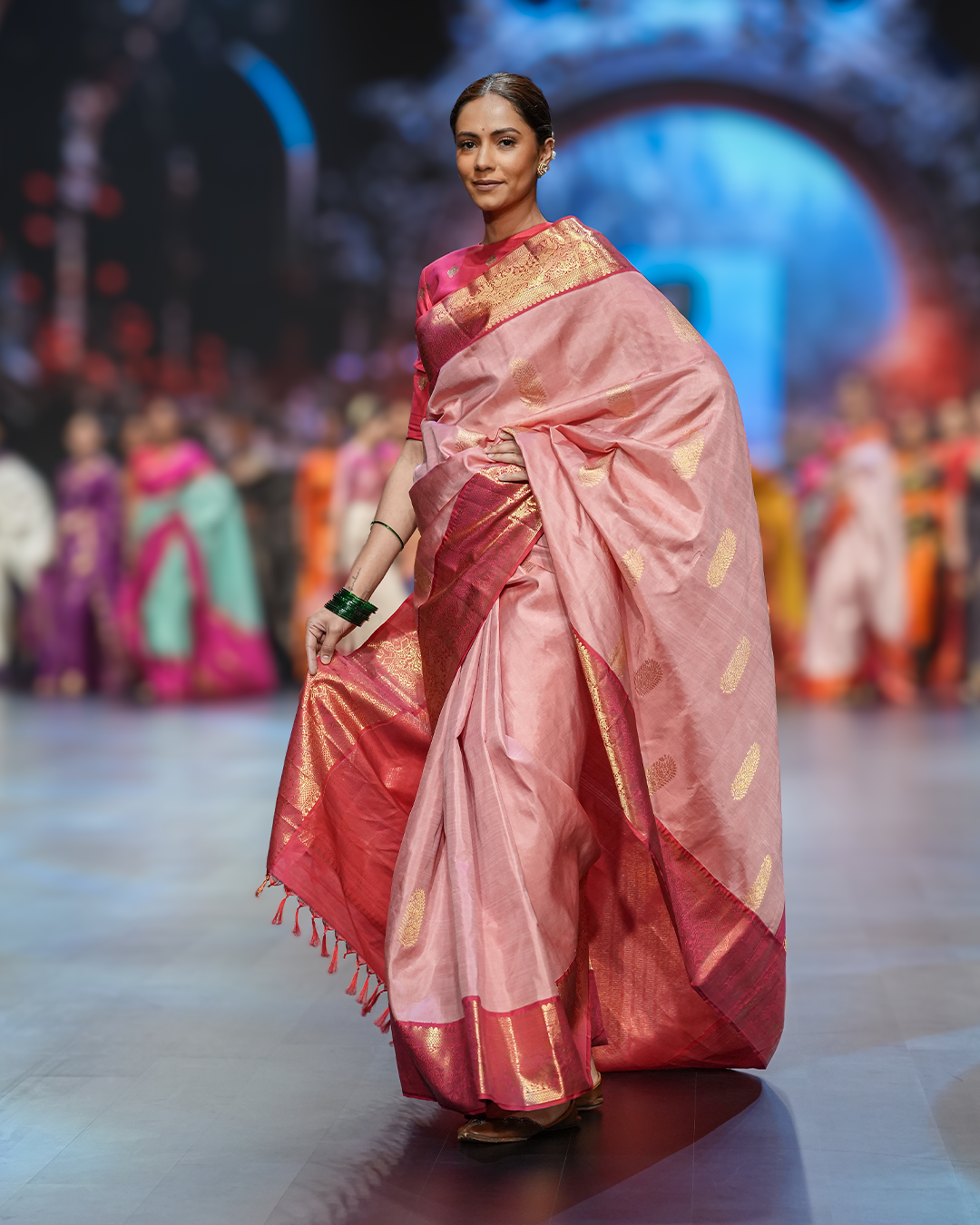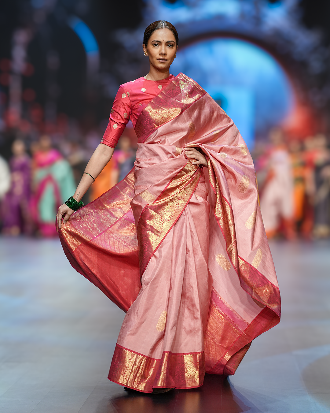 A soft peach body highlighted with a traditional Maanga butta featuring floral detailing. The rich rani border showcases classic yanai (elephant) motifs woven in korvai style, enhanced with intricate floral creepers and temple-inspired bands, creating a timeless festive drape.