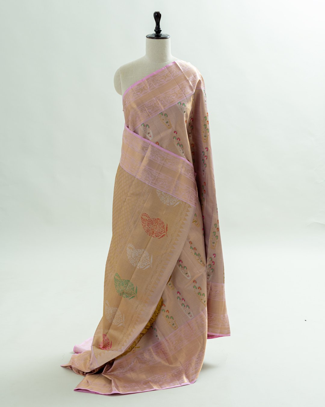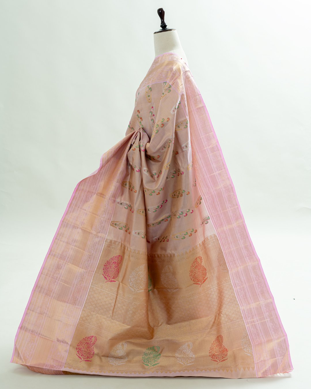 Lilac tissue Kanjivaram silk saree with Paithani-inspired floral motifs, a heavy pallu, and a matching self-colored tissue blouse.