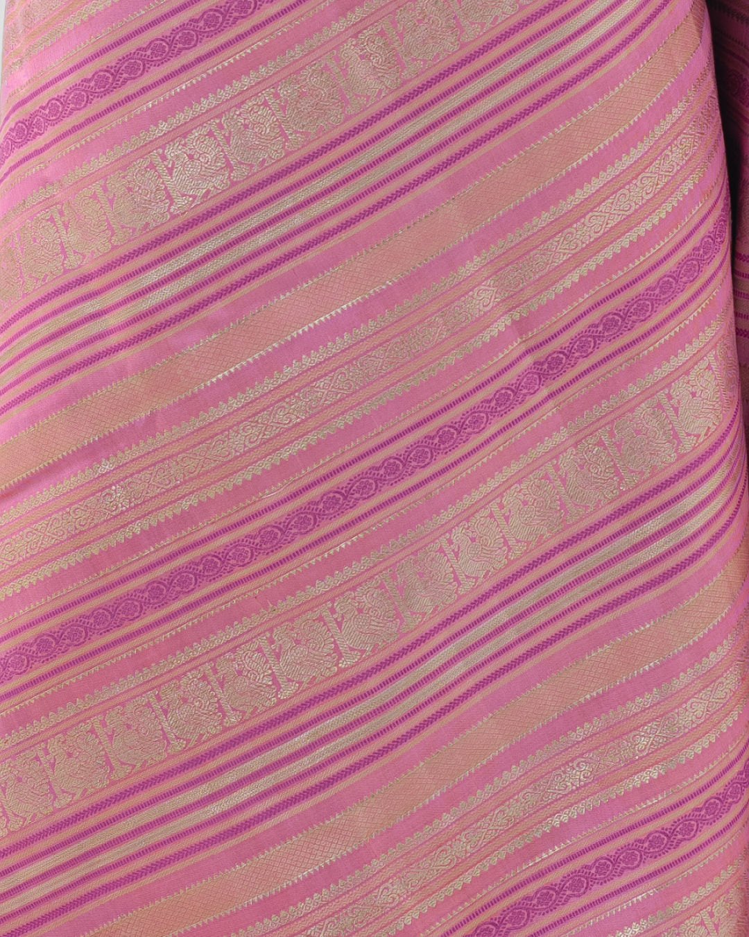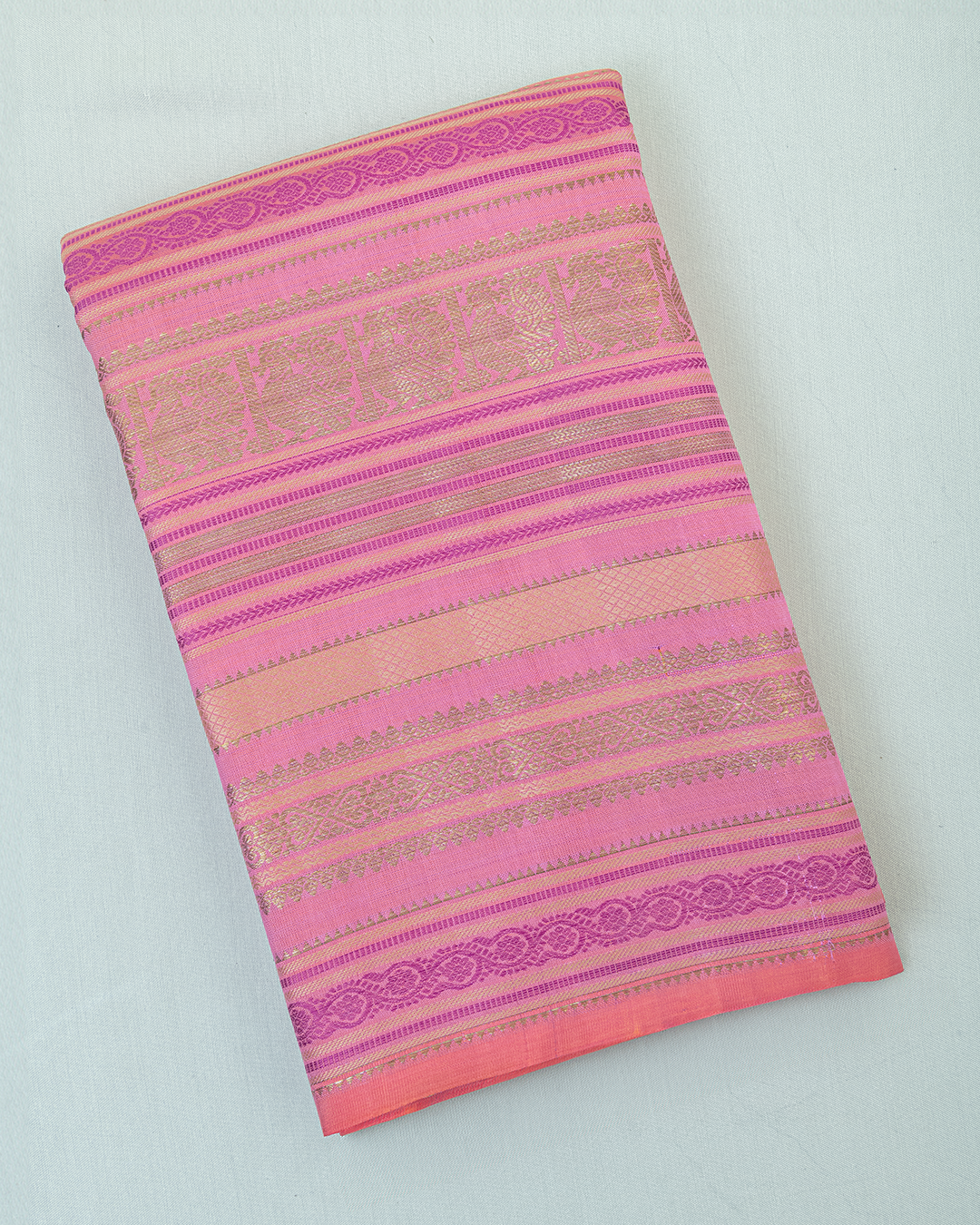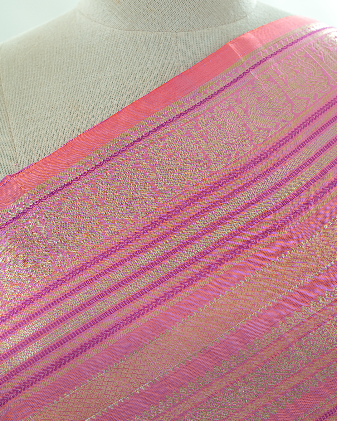 A vibrant Flamingo Pink body featuring rhythmic geometric stripes, interspersed with Annapakshi motifs and a Deep Magenta geometric border for refined elegance.