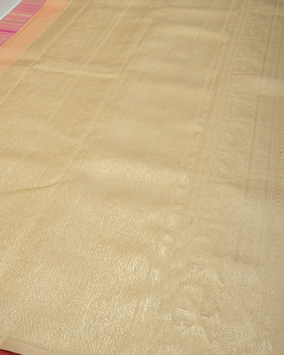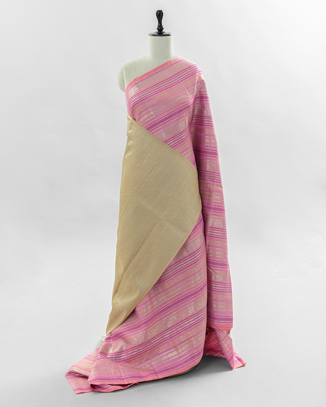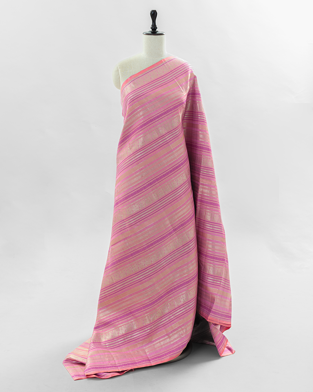 A vibrant Flamingo Pink body featuring rhythmic geometric stripes, interspersed with Annapakshi motifs and a Deep Magenta geometric border for refined elegance.
