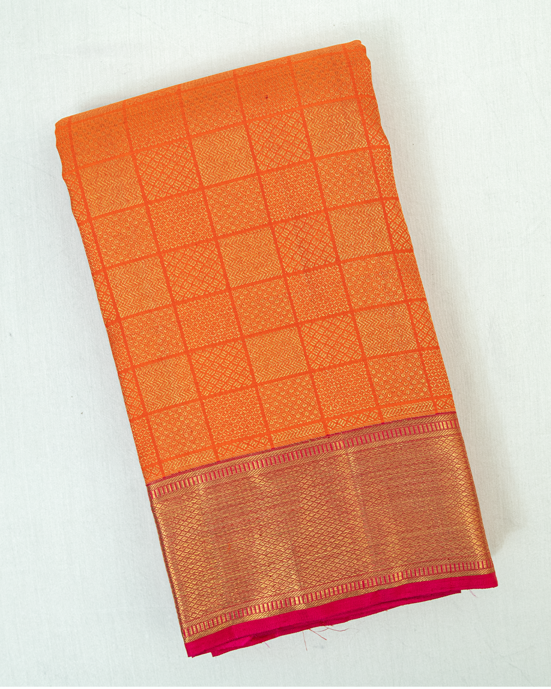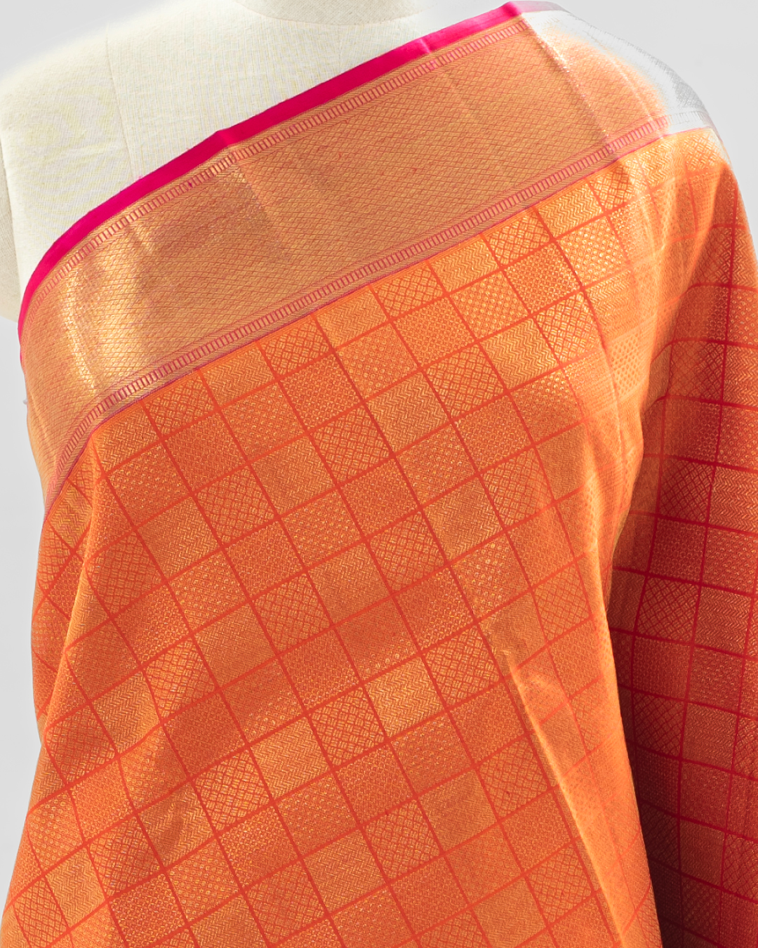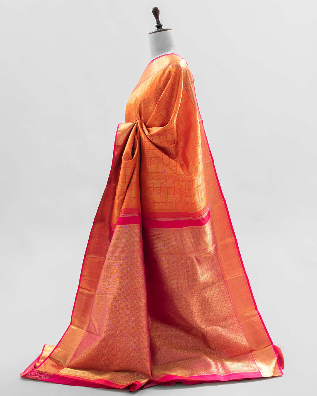 This radiant Sunset Orange Kanjivaram features a specialized Kattam body where each grid is filled with delicate zari micro-motifs. It is paired with a striking Fuschia Pink border and an opulent, heavy zari pallu featuring a continuous diamond-weave pattern for a “Sober Luxury” finish.