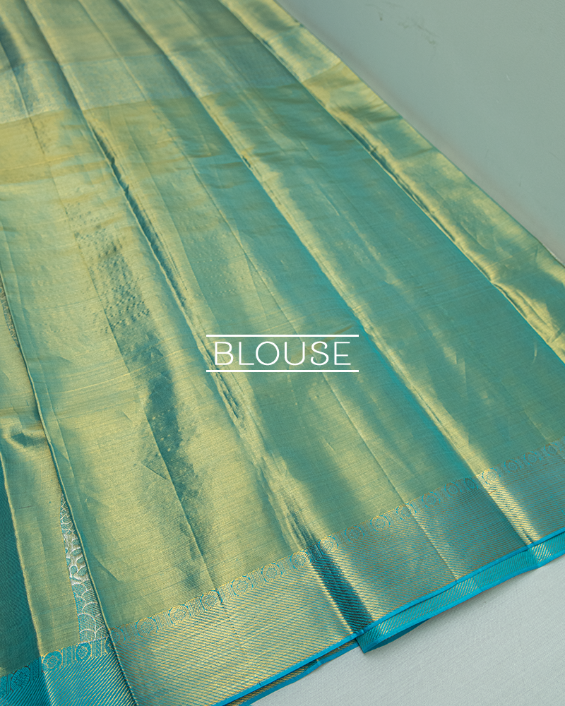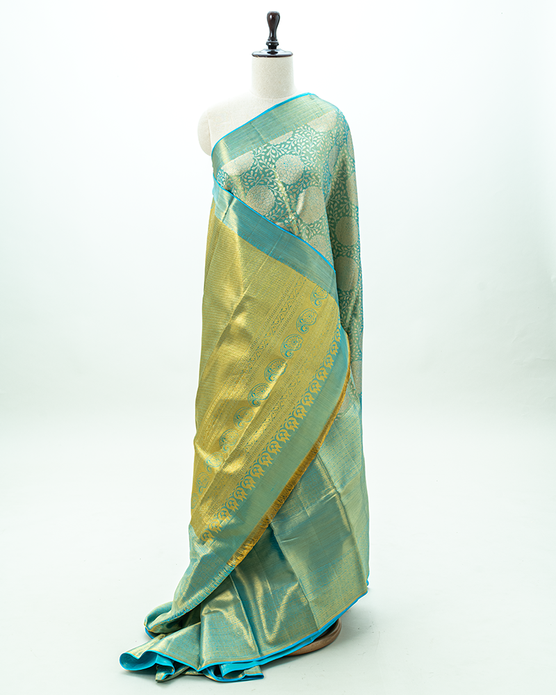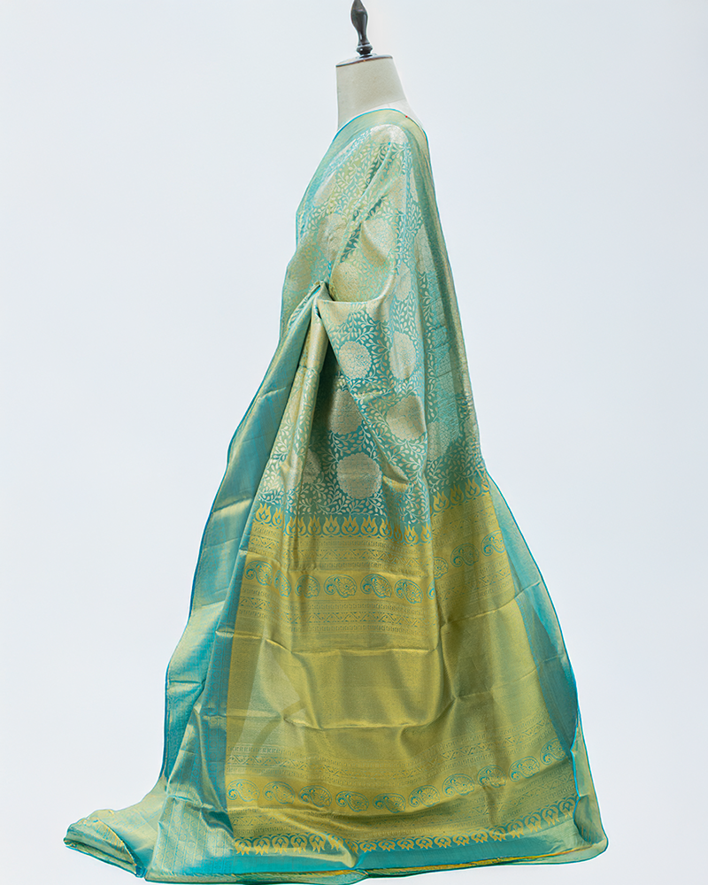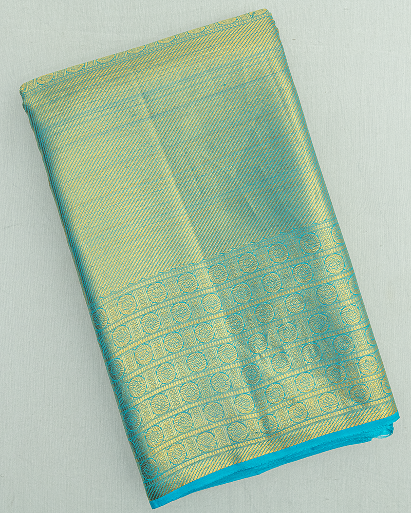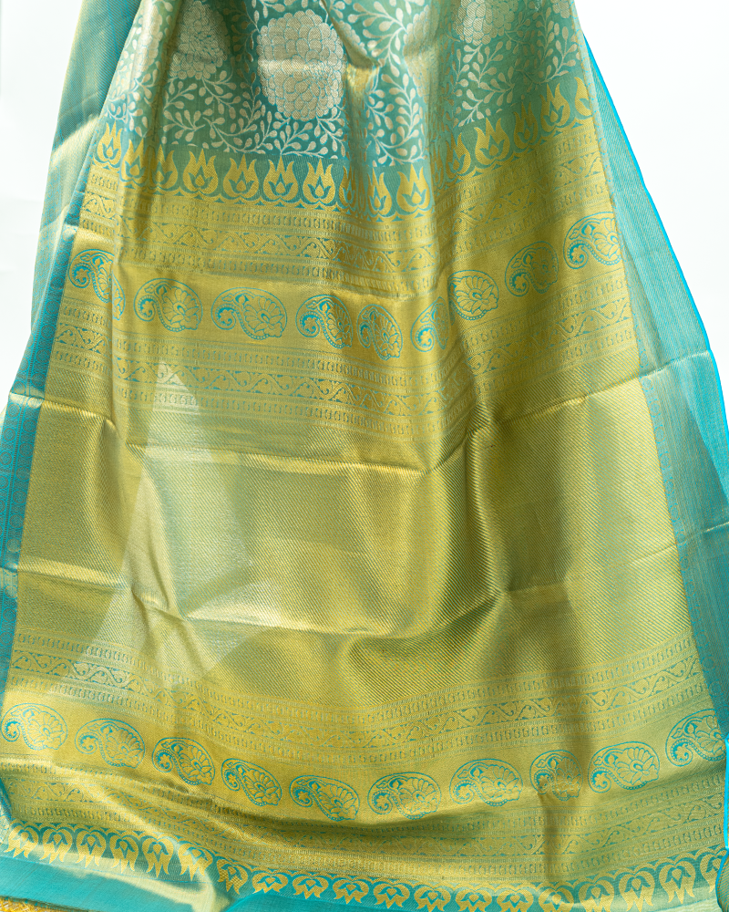 This Aqua/Teal Tissue Kanjivaram Silk Saree features a butta pattern large circular floral motifs across the body and a Korvai border with traditional motifs, creating a shimmering, grand look perfect for events.