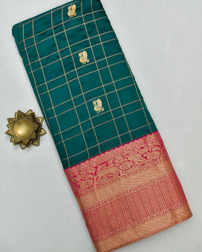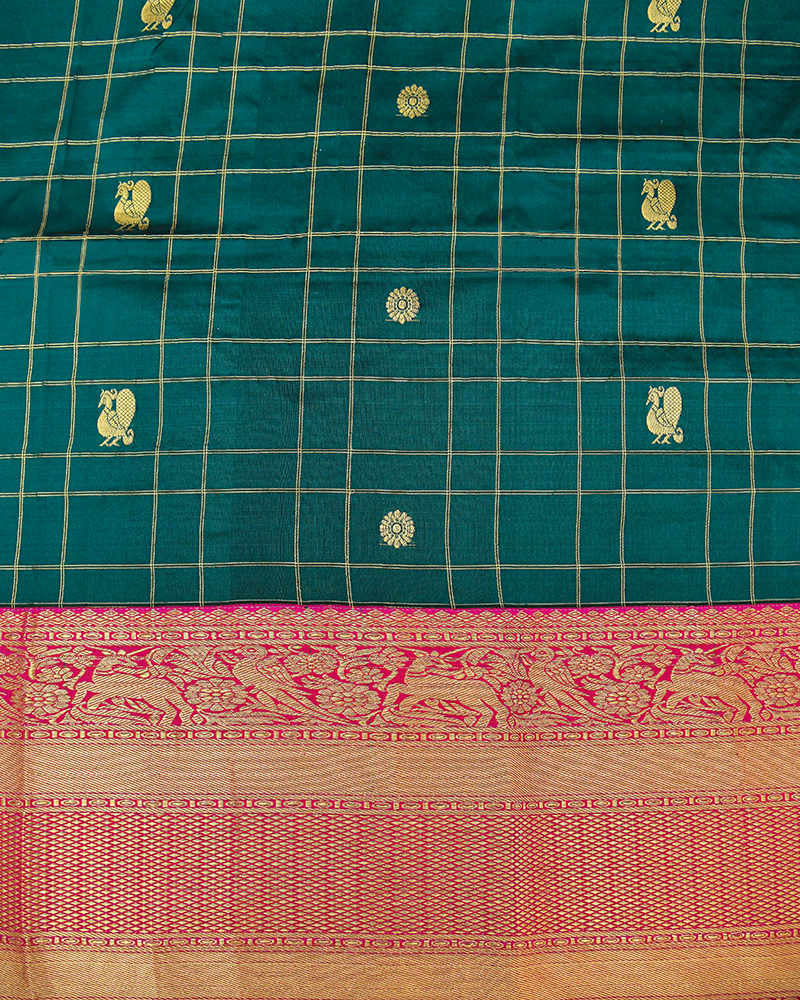 This Kanchipuram Silk features a Teal Green Kattam body with Mayil Chakram (Peacock & Chakram) and floral buttas, framed by a pink Korvai border with Vanasingaram motifs.