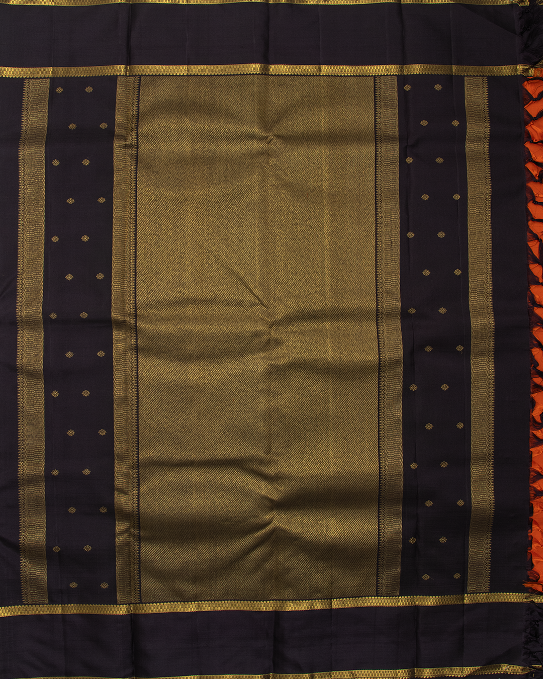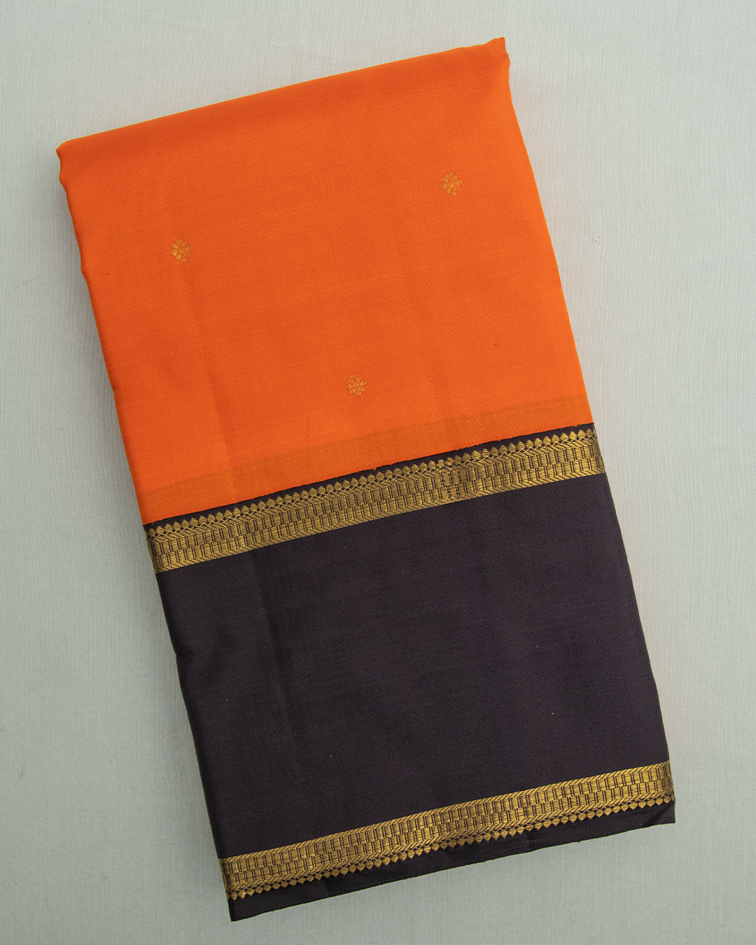 Luminous orange handloom silk body featuring golden zari Chitti Buttis, paired with a deep purple Pettu Border accented by parallel Vairaoosi zari lines.