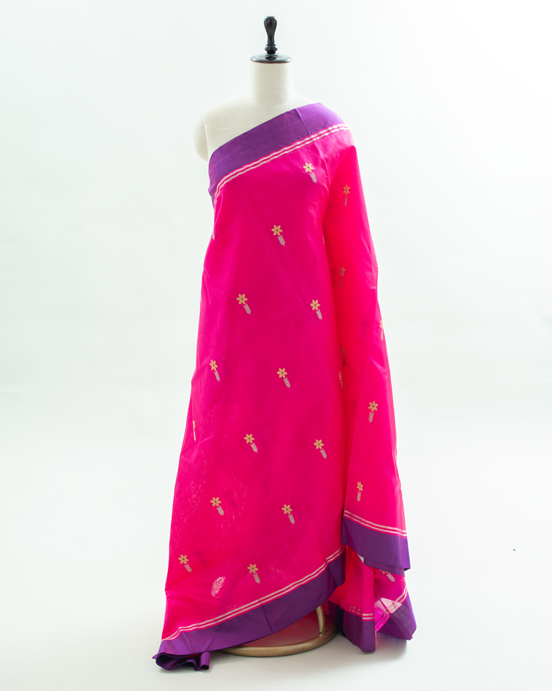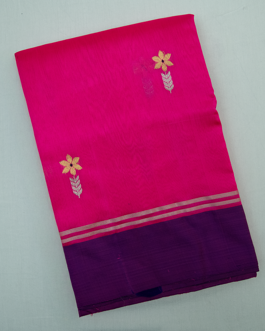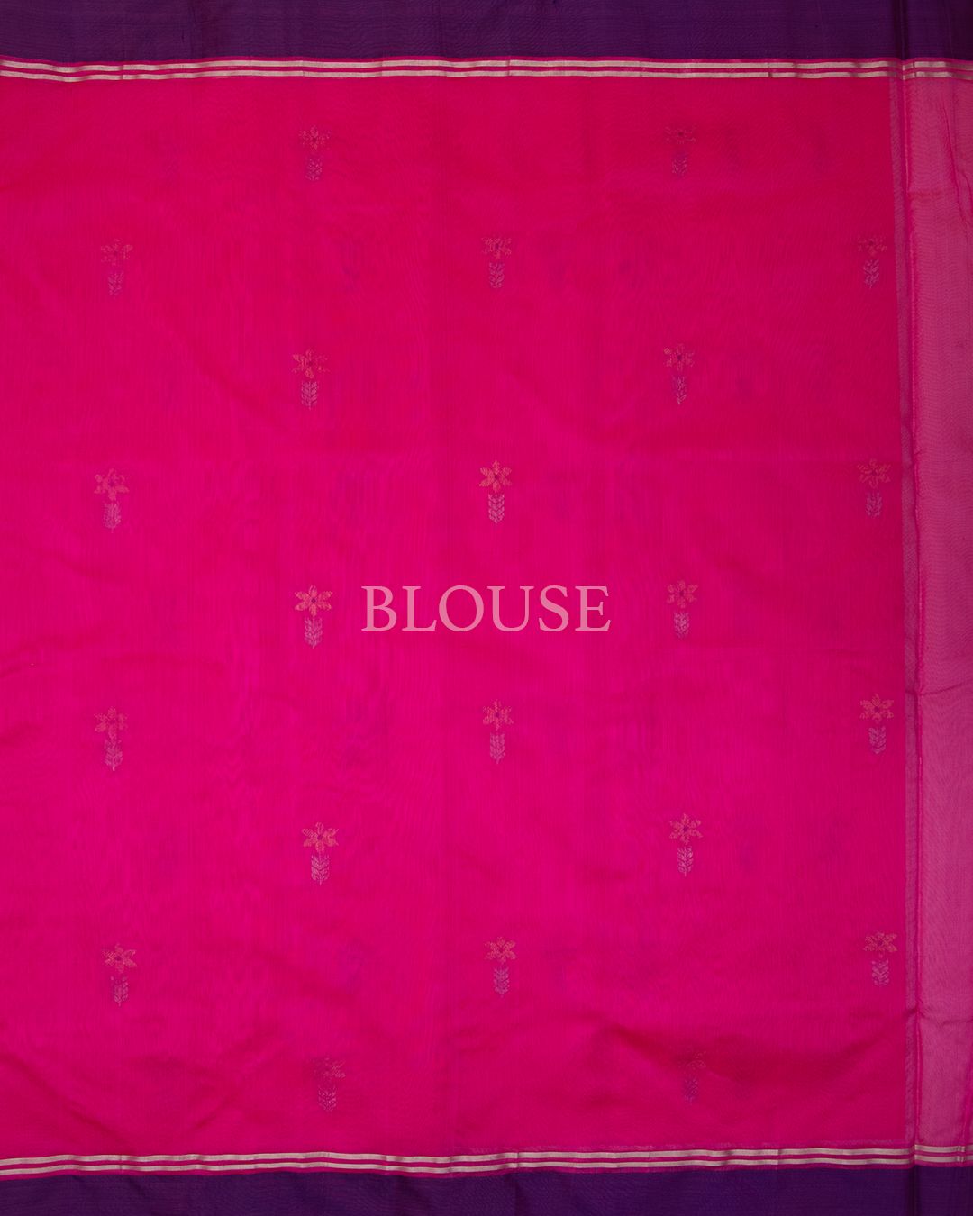 This elegant Chanderi silk saree features a vibrant pink body adorned with traditional zari butis and a striking contrast purple border with intricate gold weaving.