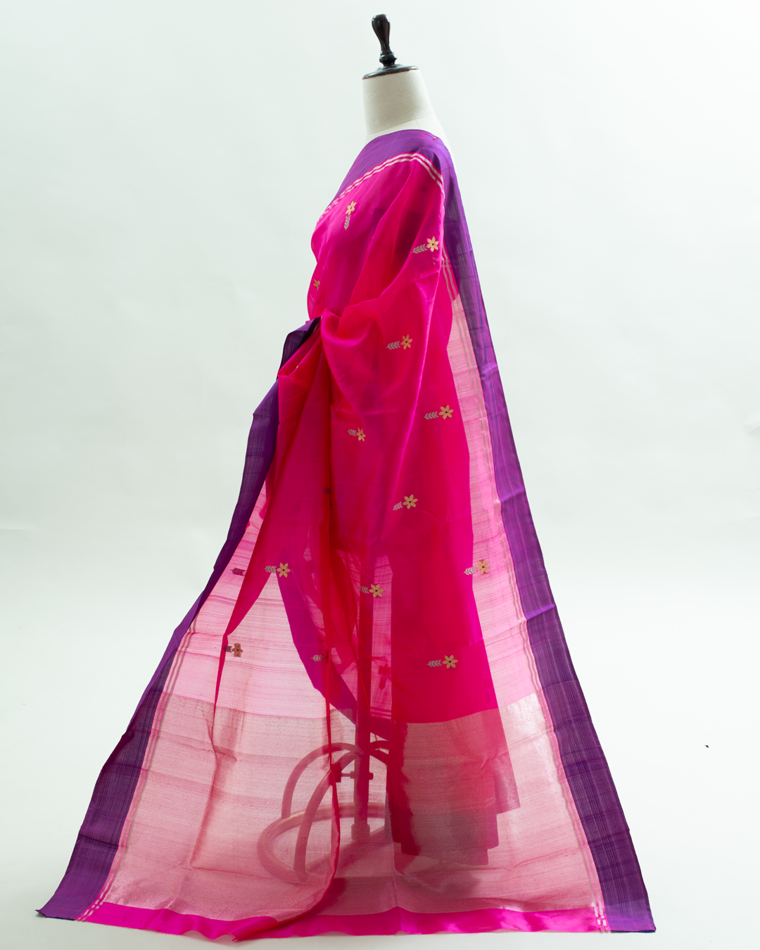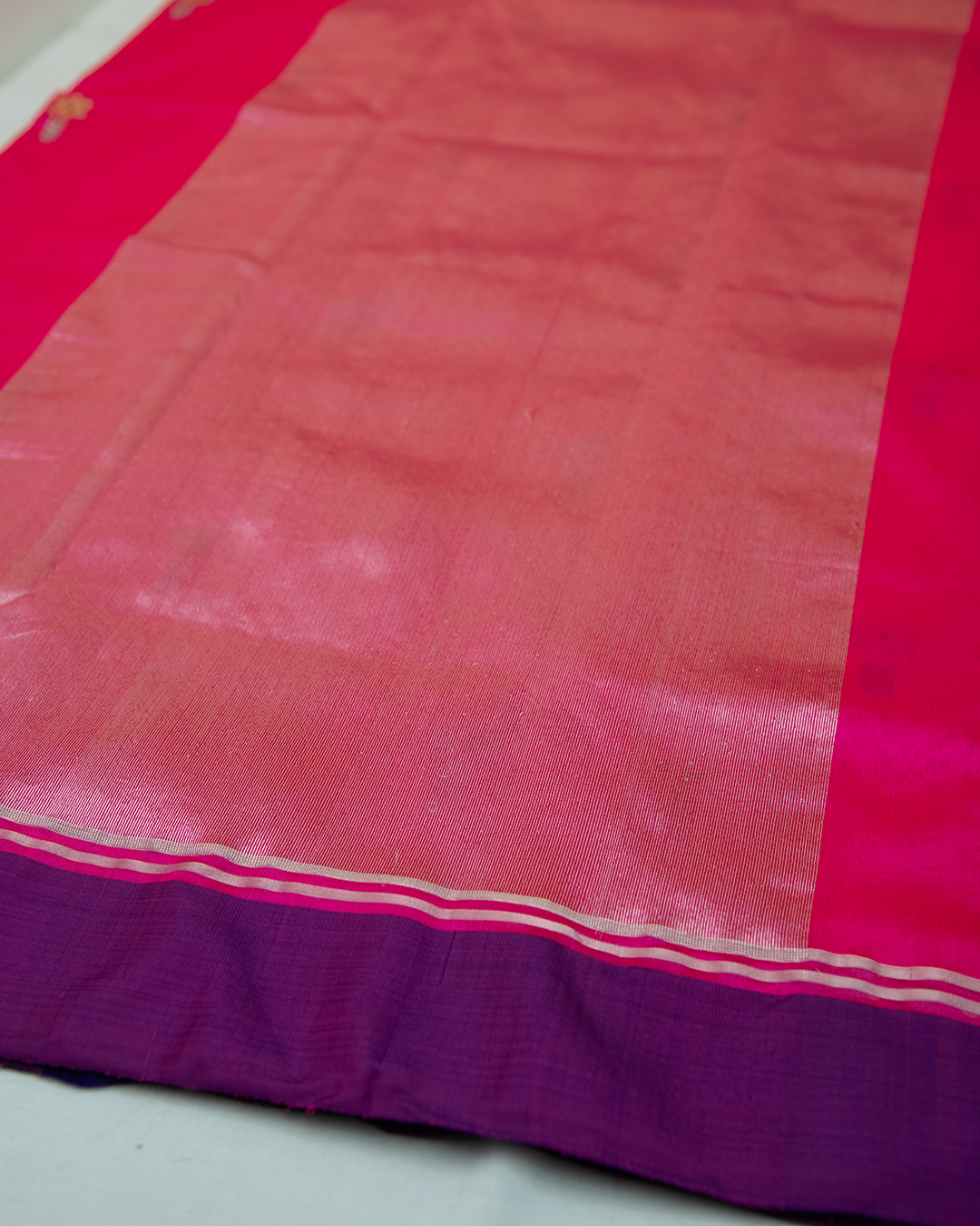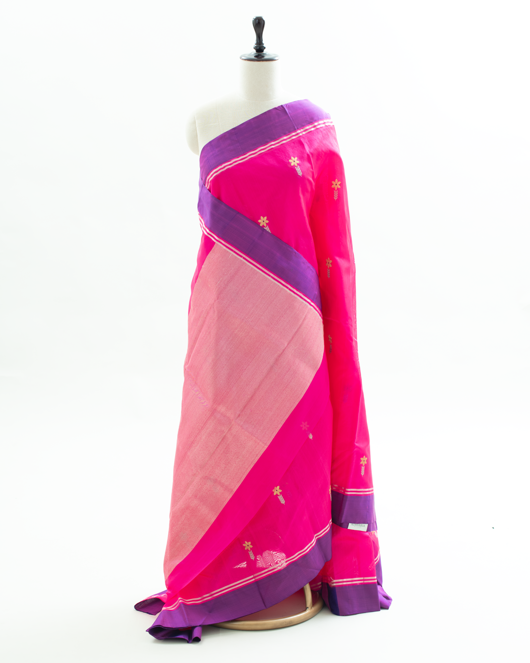 This elegant Chanderi silk saree features a vibrant pink body adorned with traditional zari butis and a striking contrast purple border with intricate gold weaving.