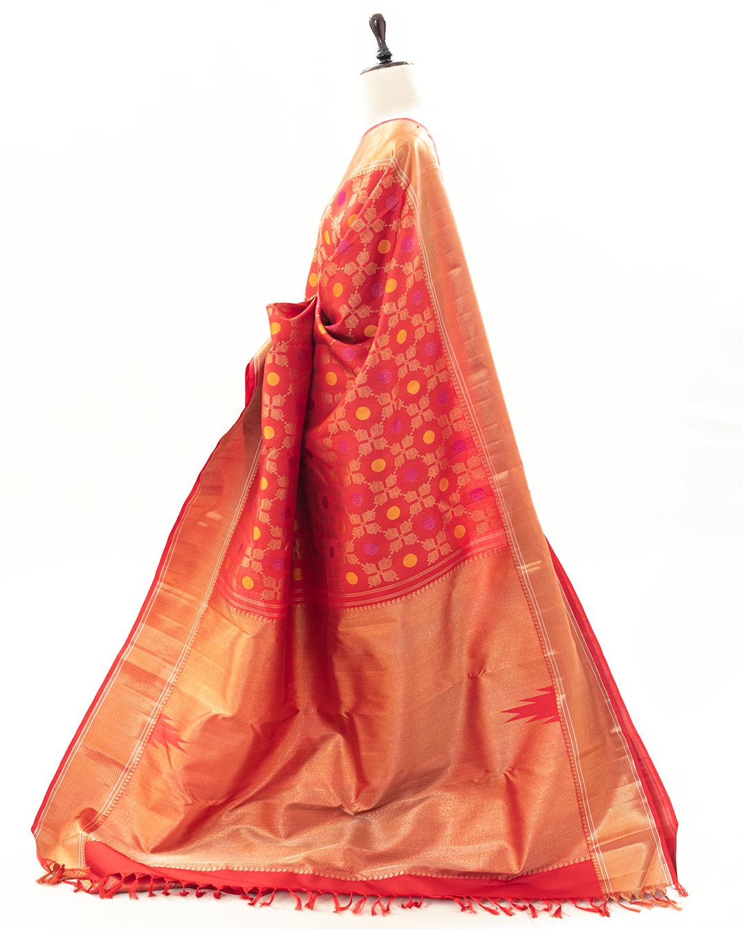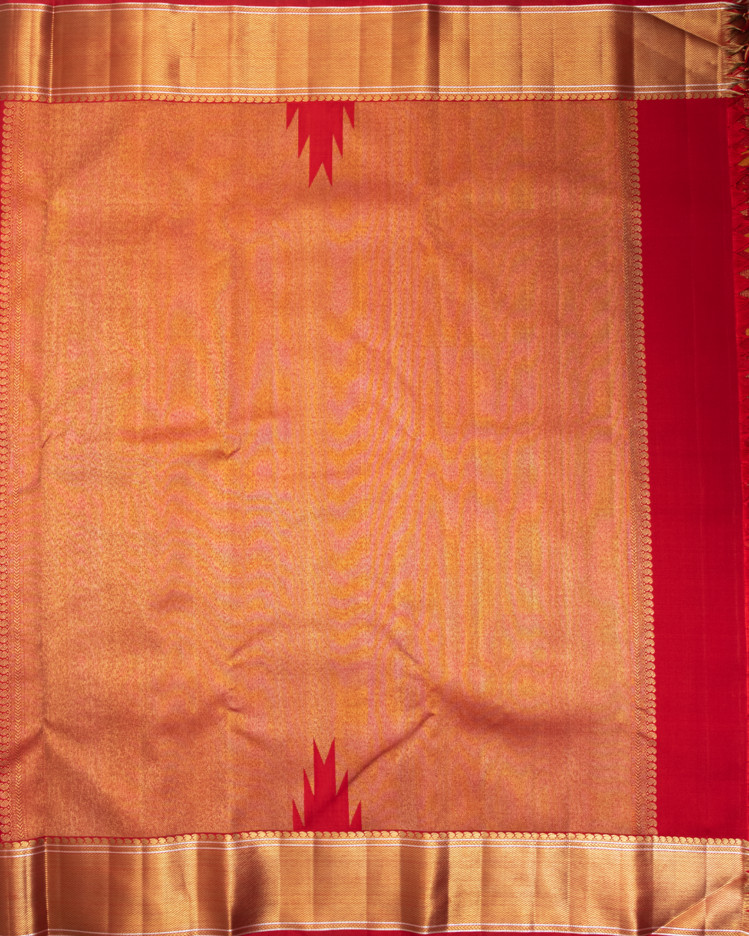 Opulent Red Kanjivaram Silk Saree with bold zari woven geometric and circular motifs with shimmering gold zari border, radiating heritage richness and luxurious traditional grandeur.